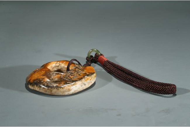 Of irregular circular form, the stone is of yellow russet and grey tone one one side, the reverse with beige tone.