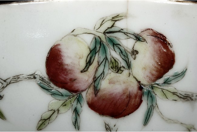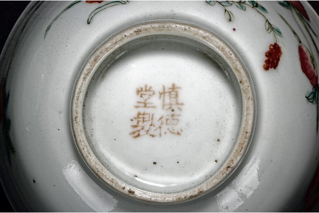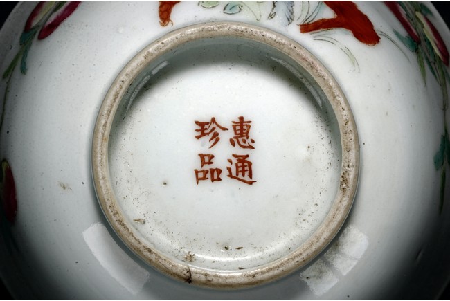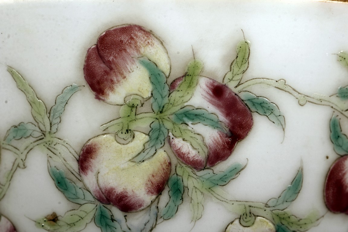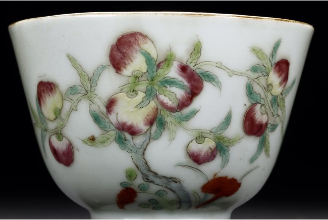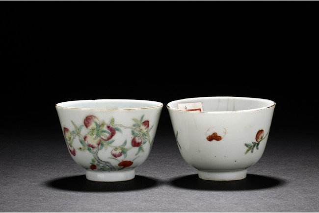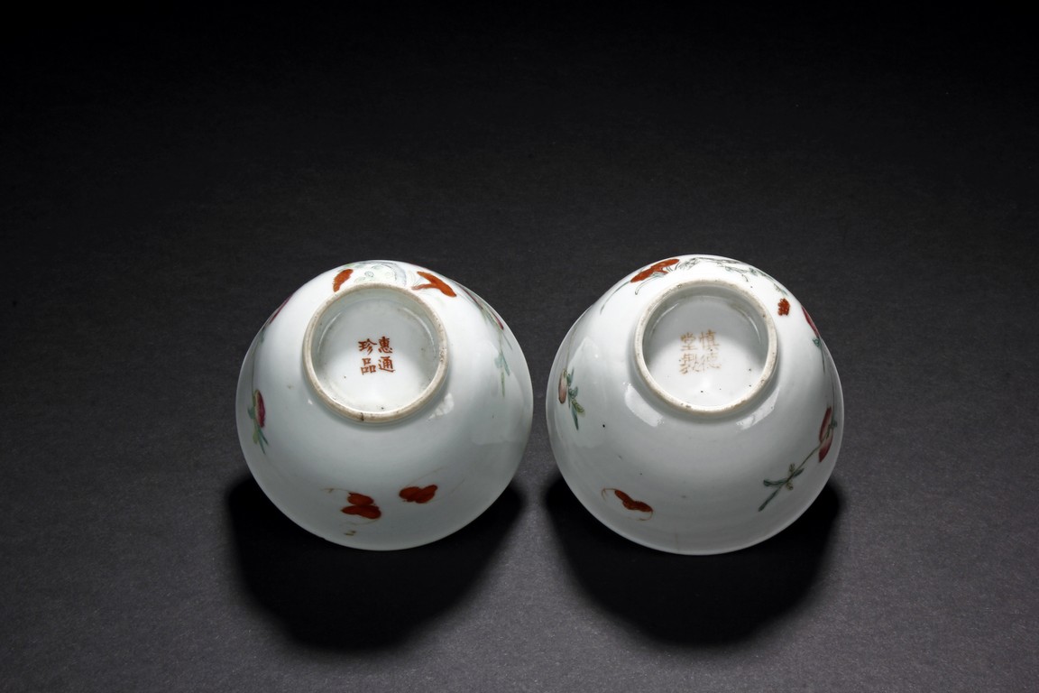 Republic period. Each cup is thinly potted with steep sides rising to a flared rim, and is decorated with nine peaches growing on branches, with two flying bats on opposite side. One bears a four character 'Shen De Tang Zhi' mark, the other bears a four character 'Hui Tong Zhen Pin' mark.