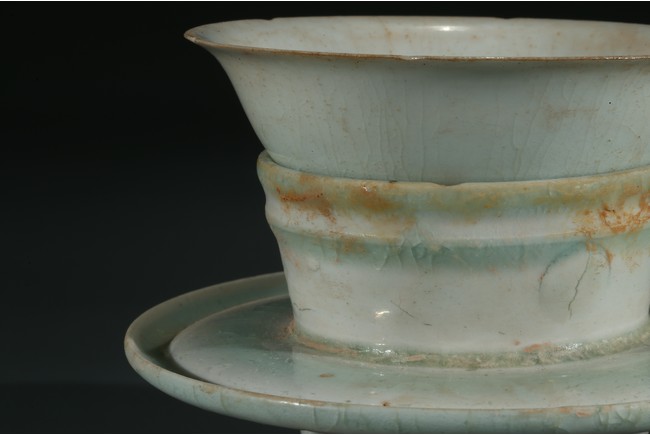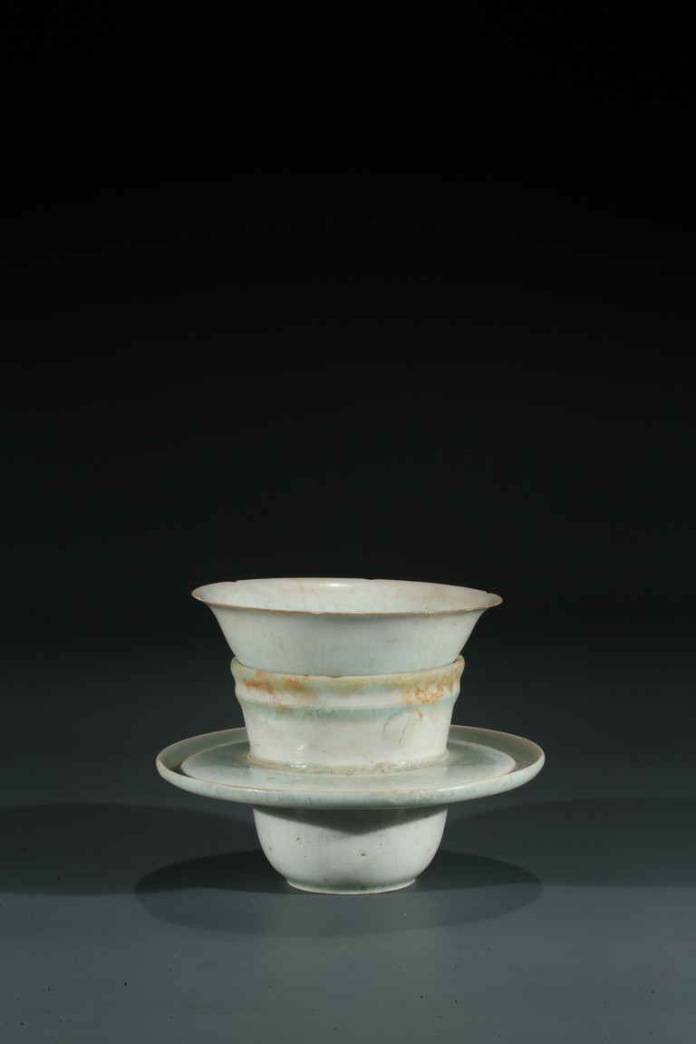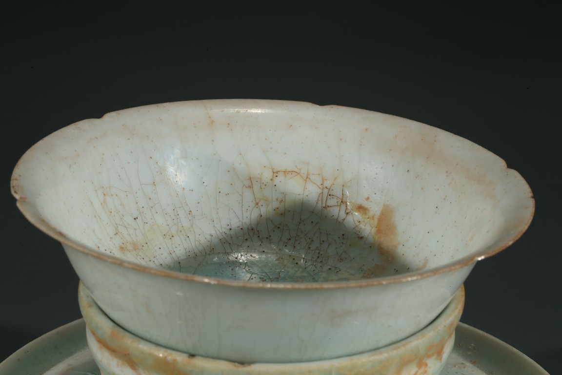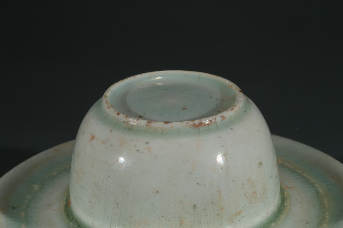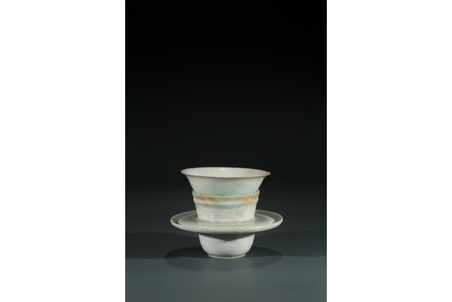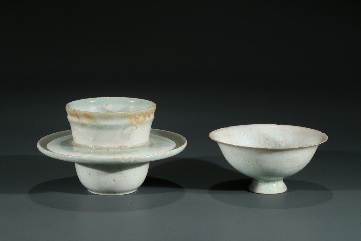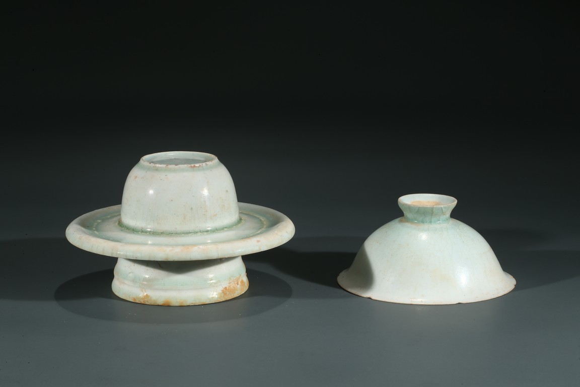 湖田窯是漢族傳統制瓷工藝中的珍品,湖田窯影青瓷更是別具風韻,此物為套盞,通體施釉自然,質地細膩,釉質潔瑩如玉,更有“素肌”之質,線條流暢,洋溢著濃郁的生活氣息。