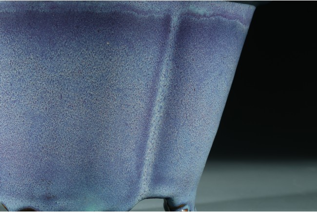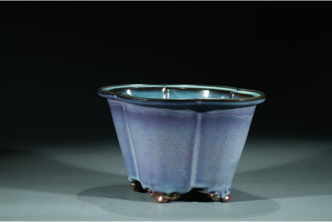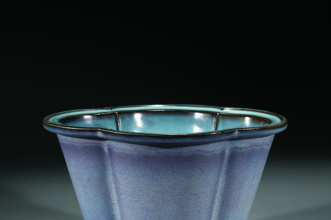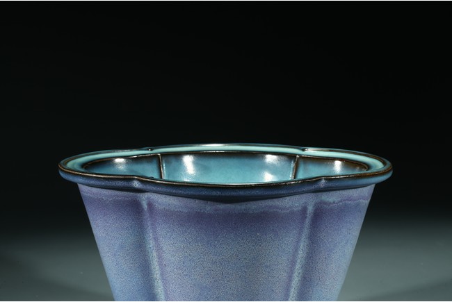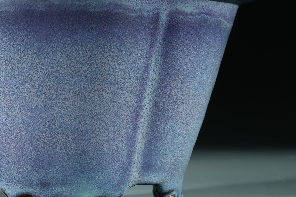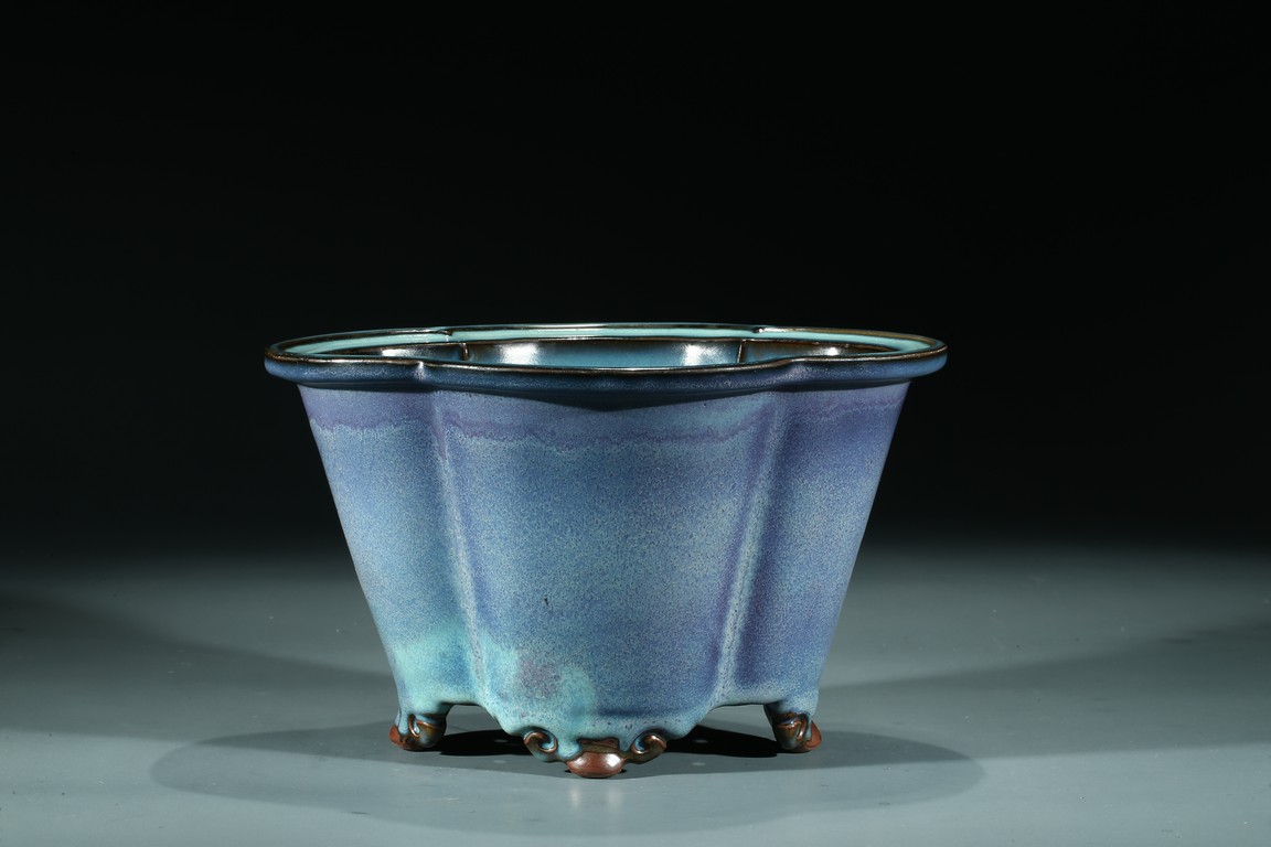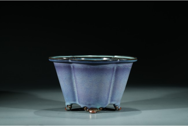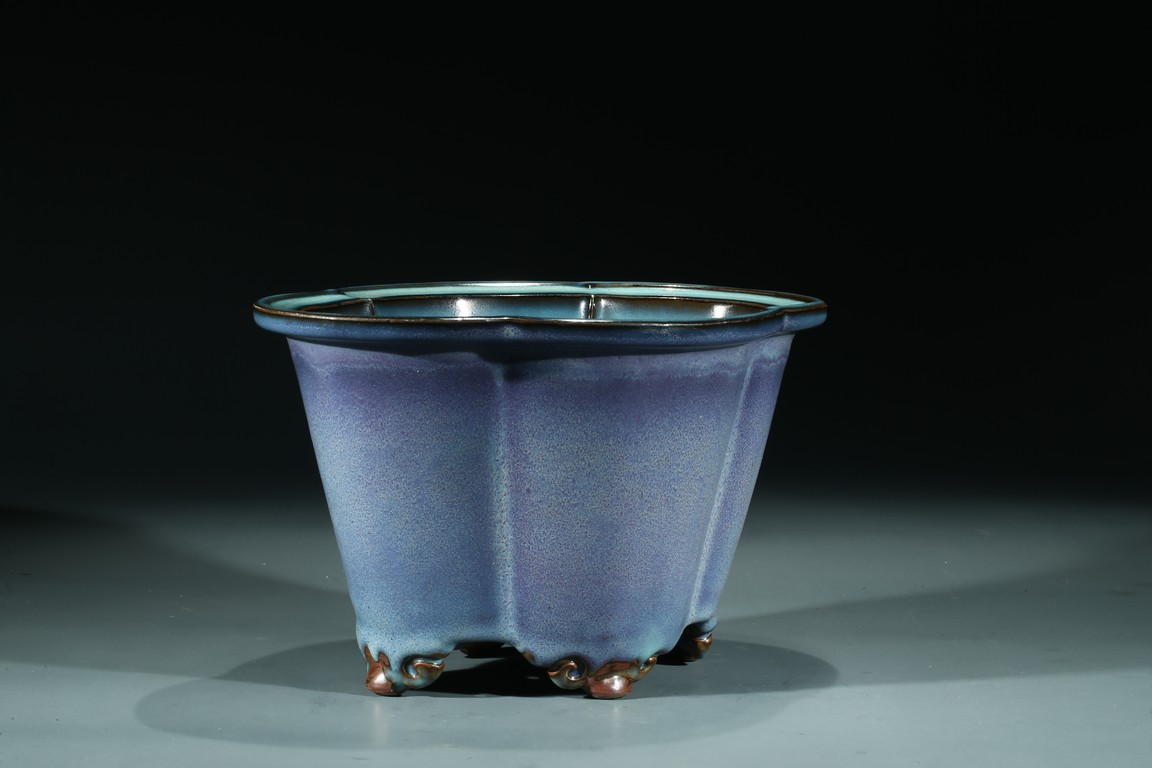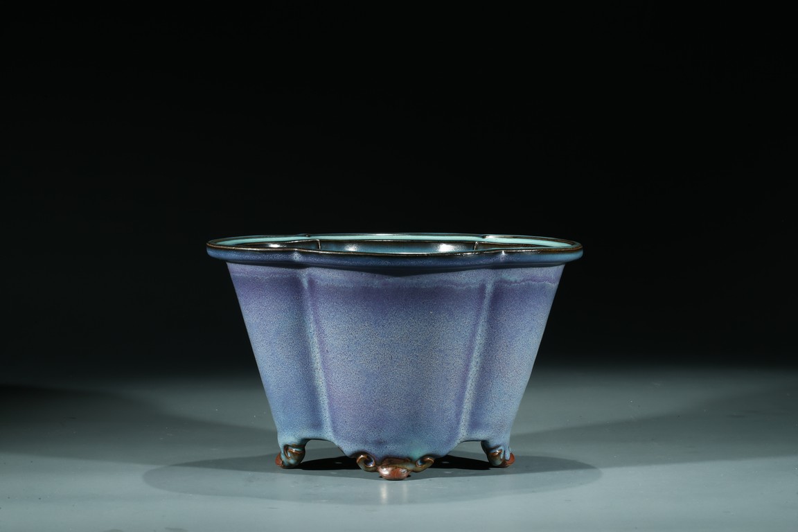 此花盆整體呈海棠形,下承四足外撇。通體施窯變釉。釉質清潤通透,與俊雅的形體相得益彰,頗具藝術魅力,通身淡紫色的釉面上透著藍綠色,為沉靜的釉面增添些許雅緻韻味,品相完好,非常難得。