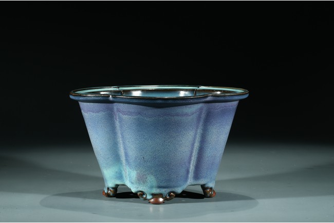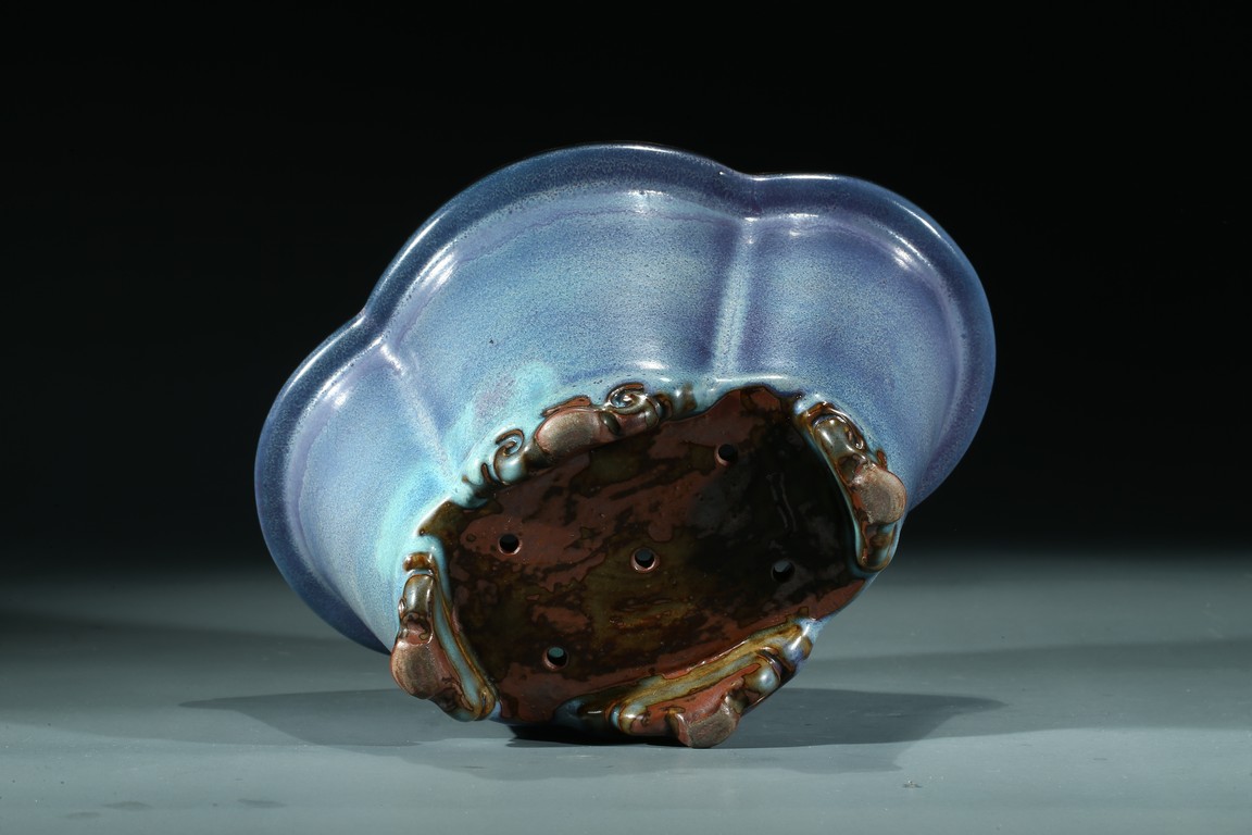 Of quatrefoil form, the lobed flaring sides rising to a broad everted galleried rim, resting on four crisply carved ruyi-shaped feet, the exterior covered overall with a lustrous lavender blue glaze, the interior with vivid sky blue glaze, the underside in olive-brown glaze over five pierced drainage holes.