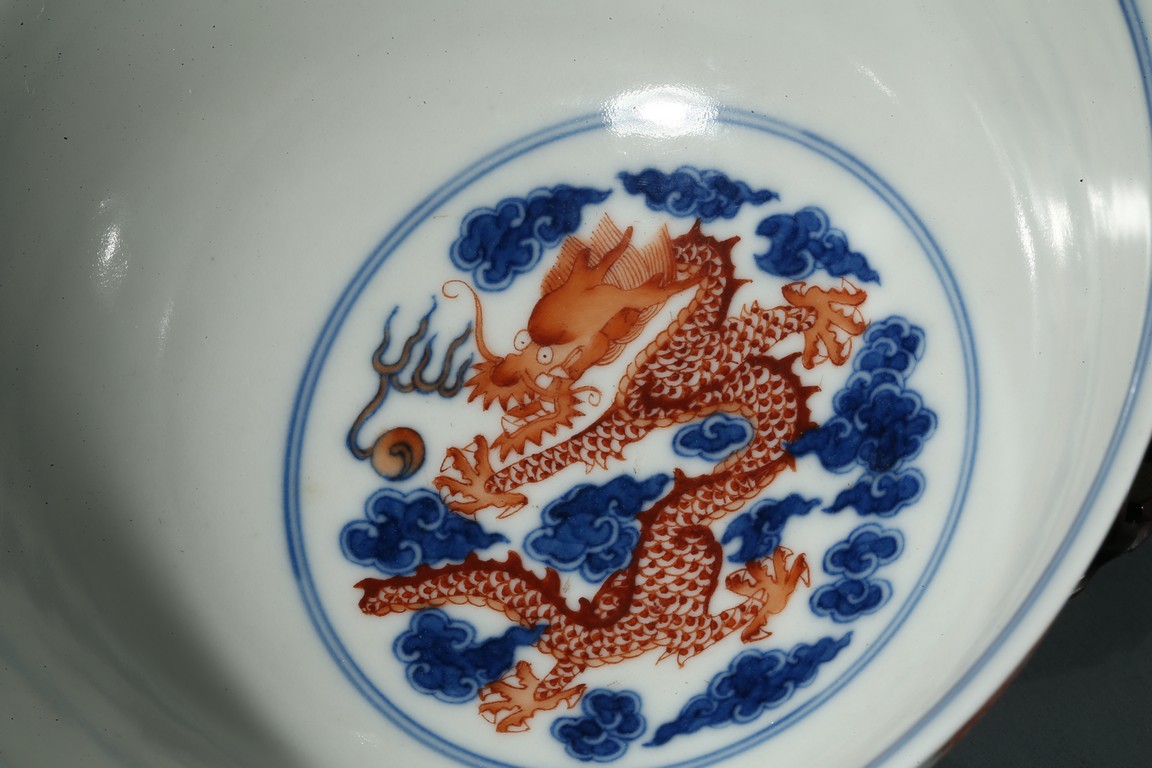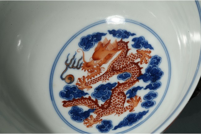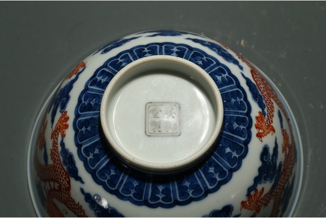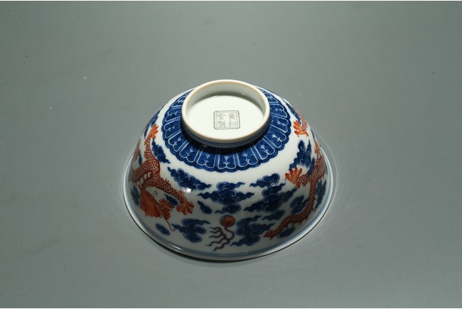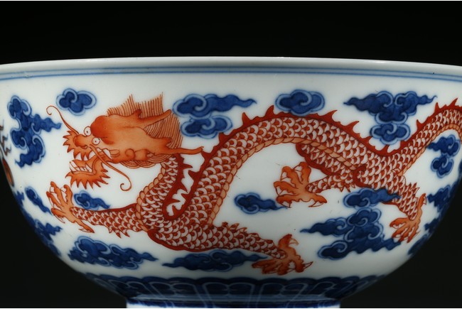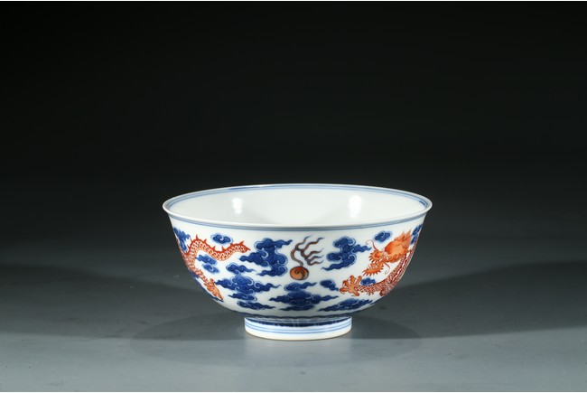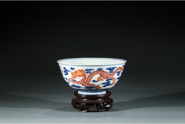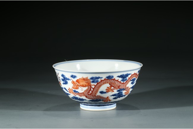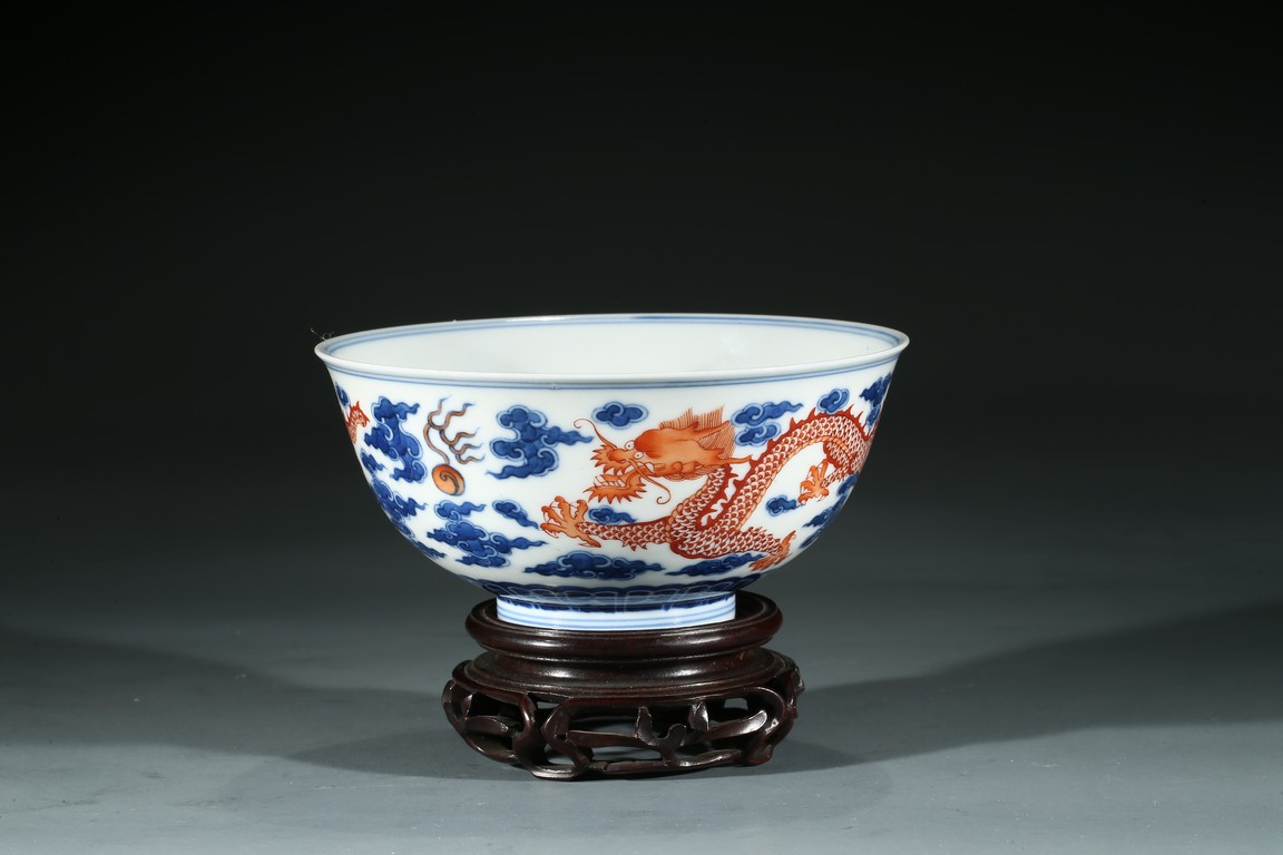 此碗撇口,弧腹,圈足,碗心與外壁以礬紅彩繪騰雲之龍,以青花飾其周圍之祥雲。雲龍蒼健兇猛,氣勢恢宏。釉下青花和釉上紅彩相結合工藝,始創於明宣德時期。清景德鎮依故宮舊藏明官窯為範本,製作御用瓷器,產生了一批品種和風格與前朝極為相似的作品,並沿用清各朝。此碗其造型規整,胎質縝密,釉面溫潤,繪製精細,紋樣精美,色彩艷麗,紋飾線條流暢,保有完好,應為官窯之器。