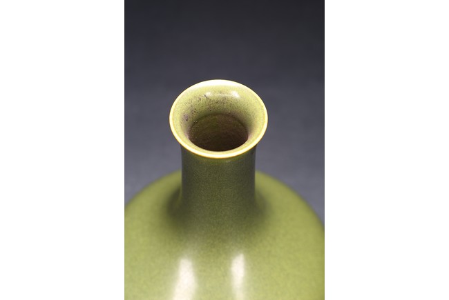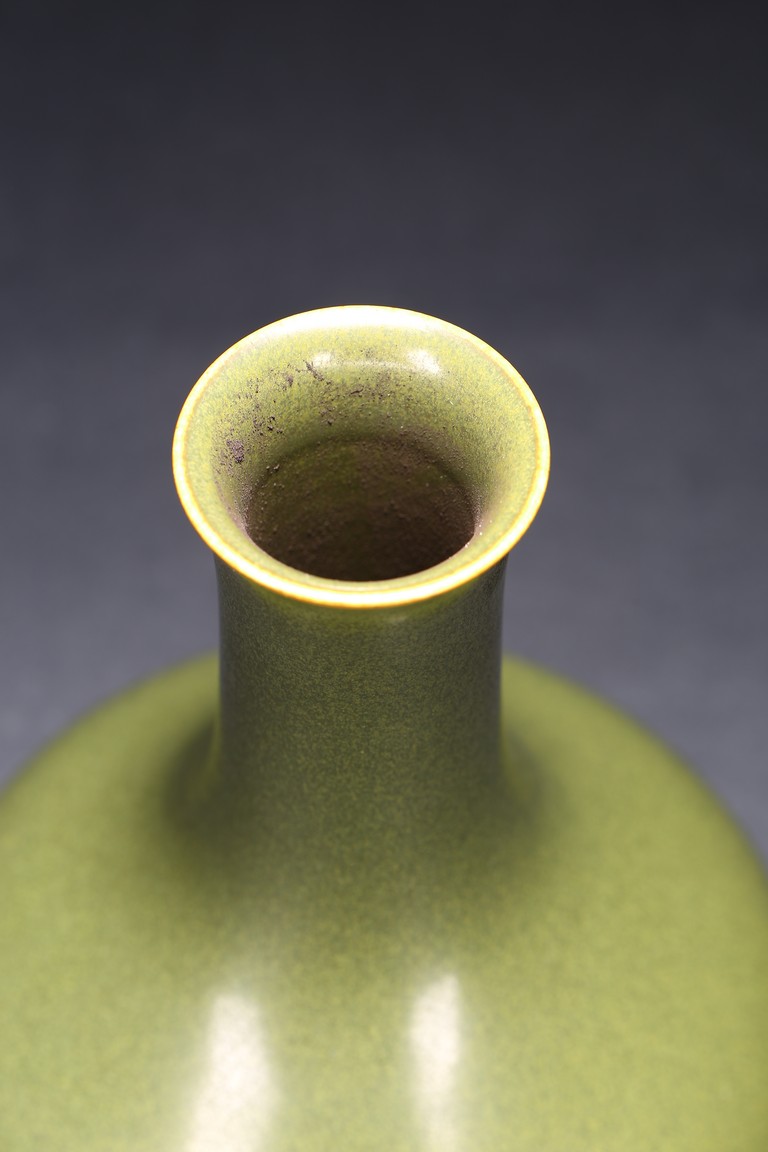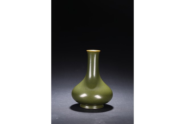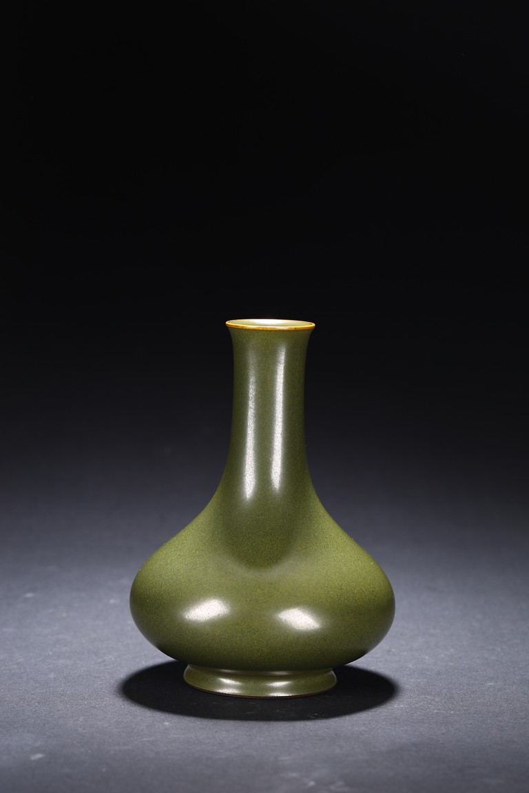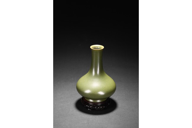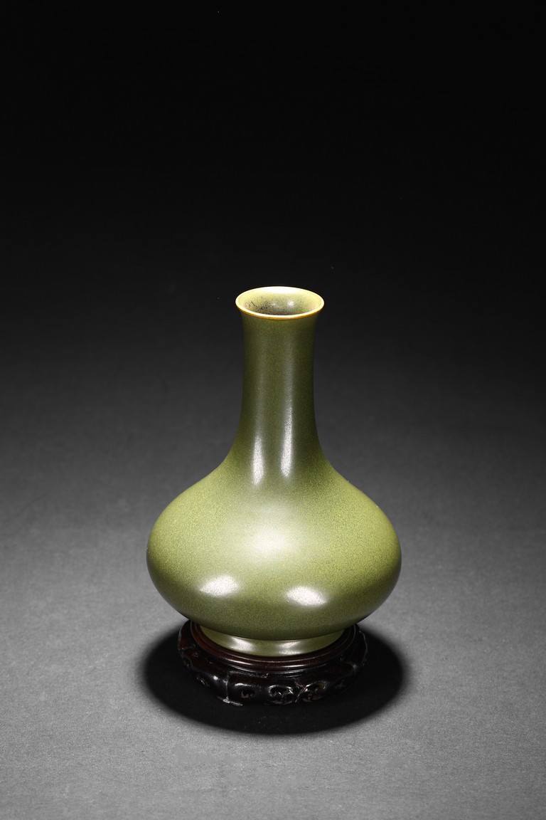 Qing Dynasty Qianlong period. Of elegant pear shape, well potted with a compressed globular body rising from a short splayed foot to a slender waisted tubular neck and everted rim, covered overall in a yellow-speckled olive-green glaze, the base incised with a six-character Qianlong seal mark dressed beneath a brown slip, fitted with a rosewood stand.