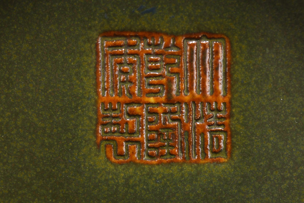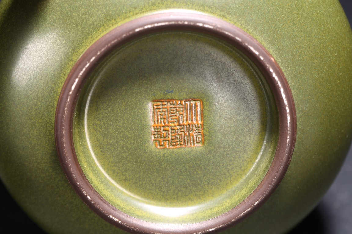 Provenance: Property from a private New York collection 來源: 紐約私人藏家收藏。荸薺瓶為清宮瓷器燒造的傳統形制之一,始於康熙朝,而尤盛於乾隆。因器形似荸薺而得名,直頸較粗,有撇口與直口之分,器腹均為扁圓,形如荸薺,充滿賞趣。正如此茶葉末釉荸薺瓶,直頸長頎、溜肩、扁鼓腹,底承圈足,底部正中落“大清乾隆年制”六字篆書款。器形飽滿端正,重心下移,愈顯豐腴大方。整器通體施茶葉末釉,釉質潤澤,釉色勻凈而深沉,誠如《陶雅》之所贊“茶葉末紋理之佳妙,有若干泥團之疏散於水中者,且其漸漸暈開,匯於底足,圍繞週遭,直如鮮魚腹皮之姿態流動,又於窯變外得少佳趣。”細細觀之,此瓶造型端莊規整,釉質釉色靜穆,盡顯大氣雅緻,誠為乾隆官窯佳品。