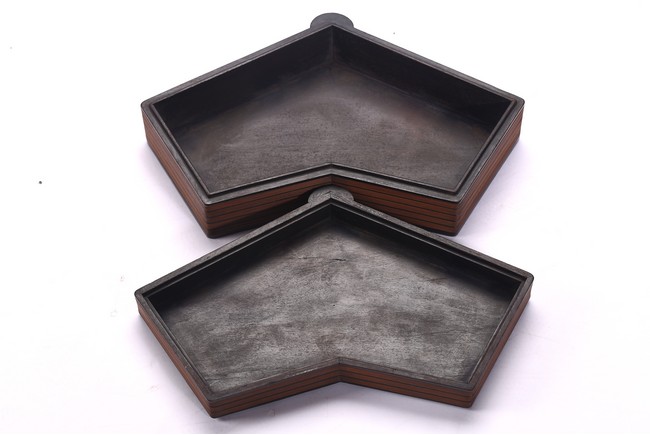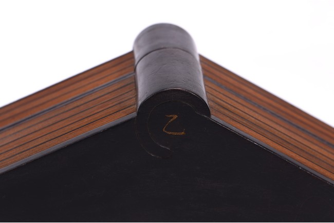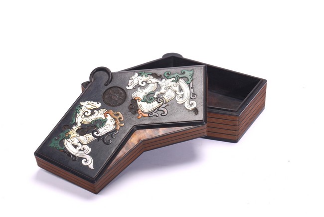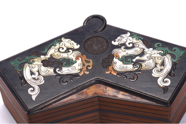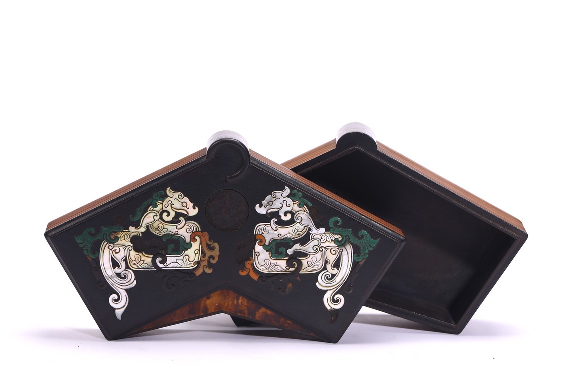 Qing Dynasty Qianlong period. Modelled in the form of Qing, an ancient Chinese ritual chime, in form of stacked books, the top cover finely inlaid in various materials, including mother-of-pearl, tortoise shell to depict a pair of stylized kui dragons flanking a pearl ball (missing inlay), the base carved with a single character ' Yi'.