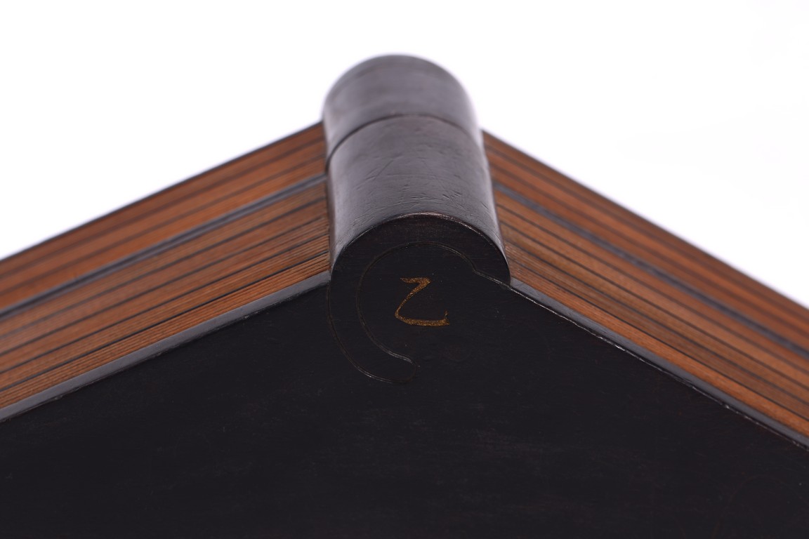 Provenance: Property from a private New York collection 來源: 紐約私人藏家收藏。此盒整體呈古代青銅器磬鐘式,主體材質為紫檀,用材考究。盒蓋表面用螺鈿,玳瑁,松石等名貴材料以百寶嵌工藝作一堆夔龍戲珠紋,圖案設計端莊典雅,頗有古意。“磬”為先秦時期打擊玉器,用石或玉製成,形狀像曲尺。磬亦通‘慶’,寓意吉慶有餘。盒底刻一‘乙’字款,應為乾隆時期宮廷作坊對器物等級評定的標註,分為‘甲,乙,丙,丁’等,甲為最高級。此件紫檀盖盒用材考究,包漿古润,置於案頭,賞心悅目,不可多得。