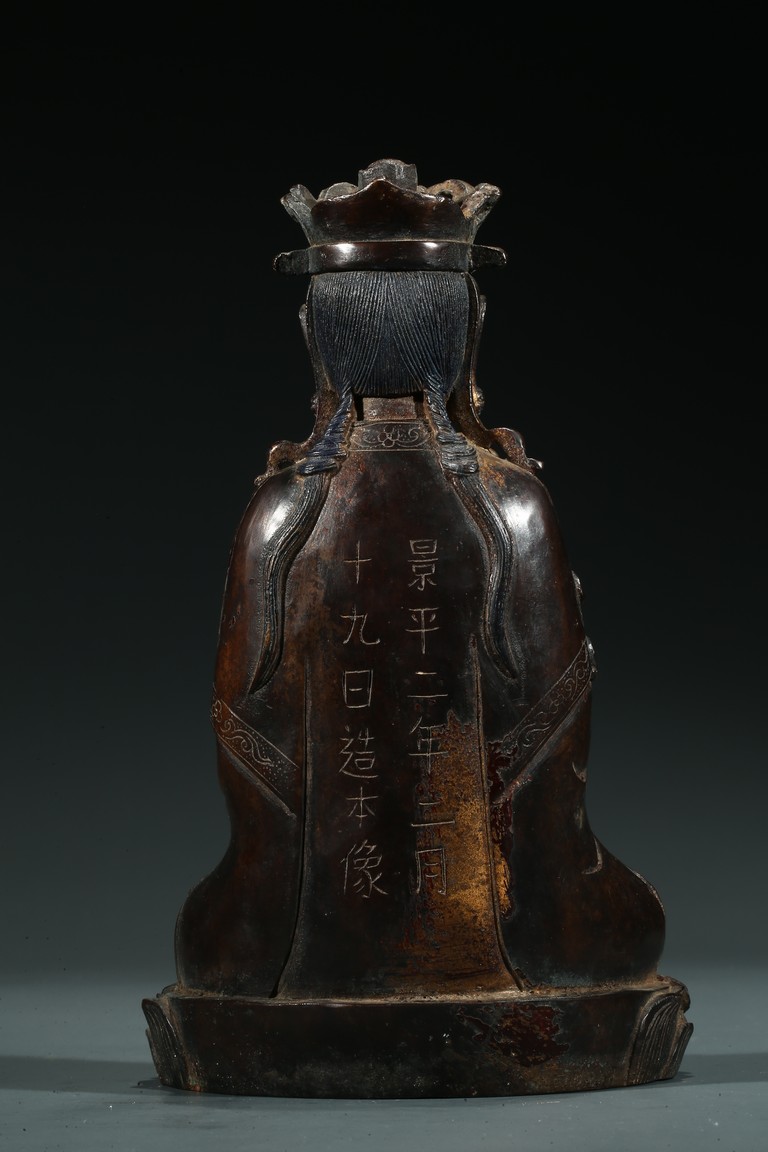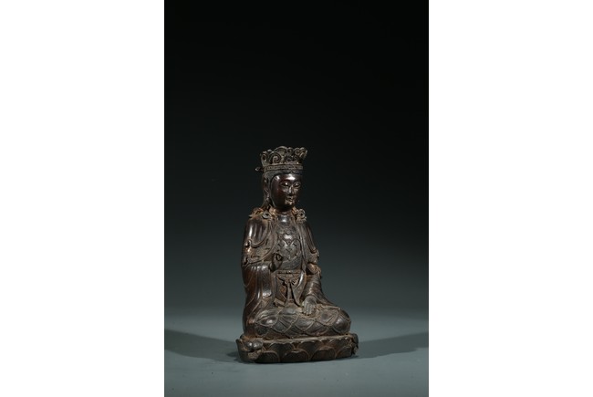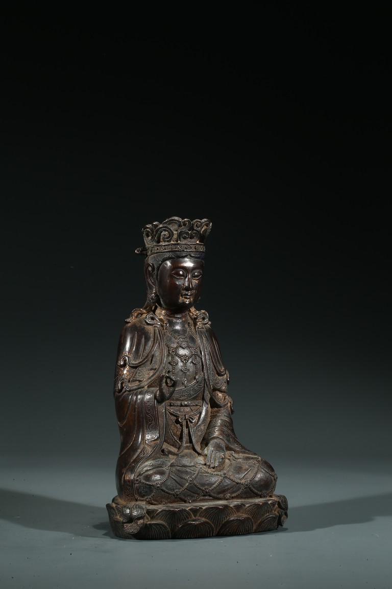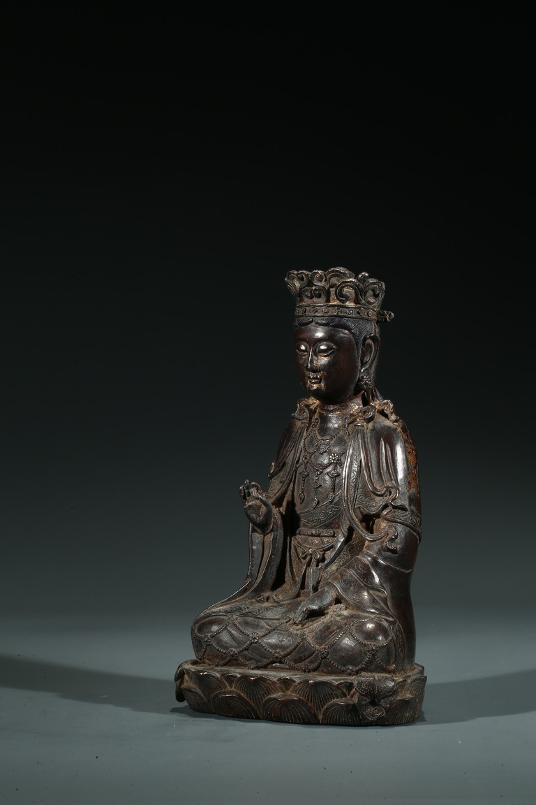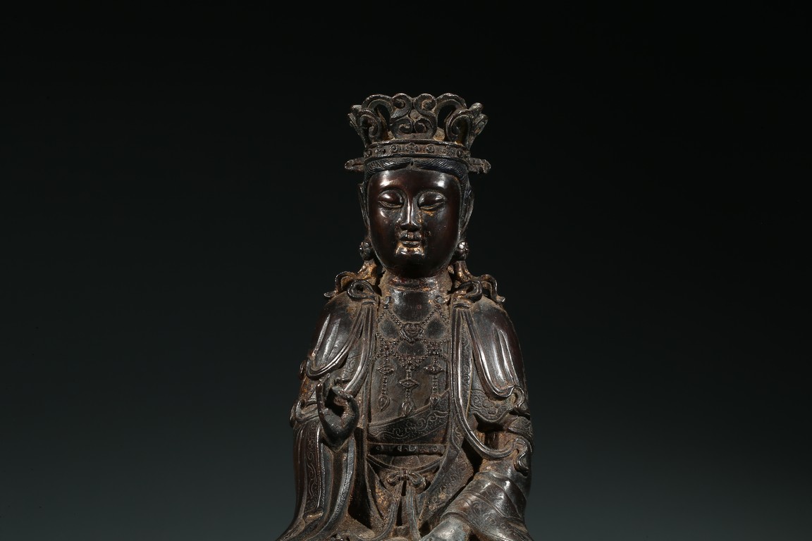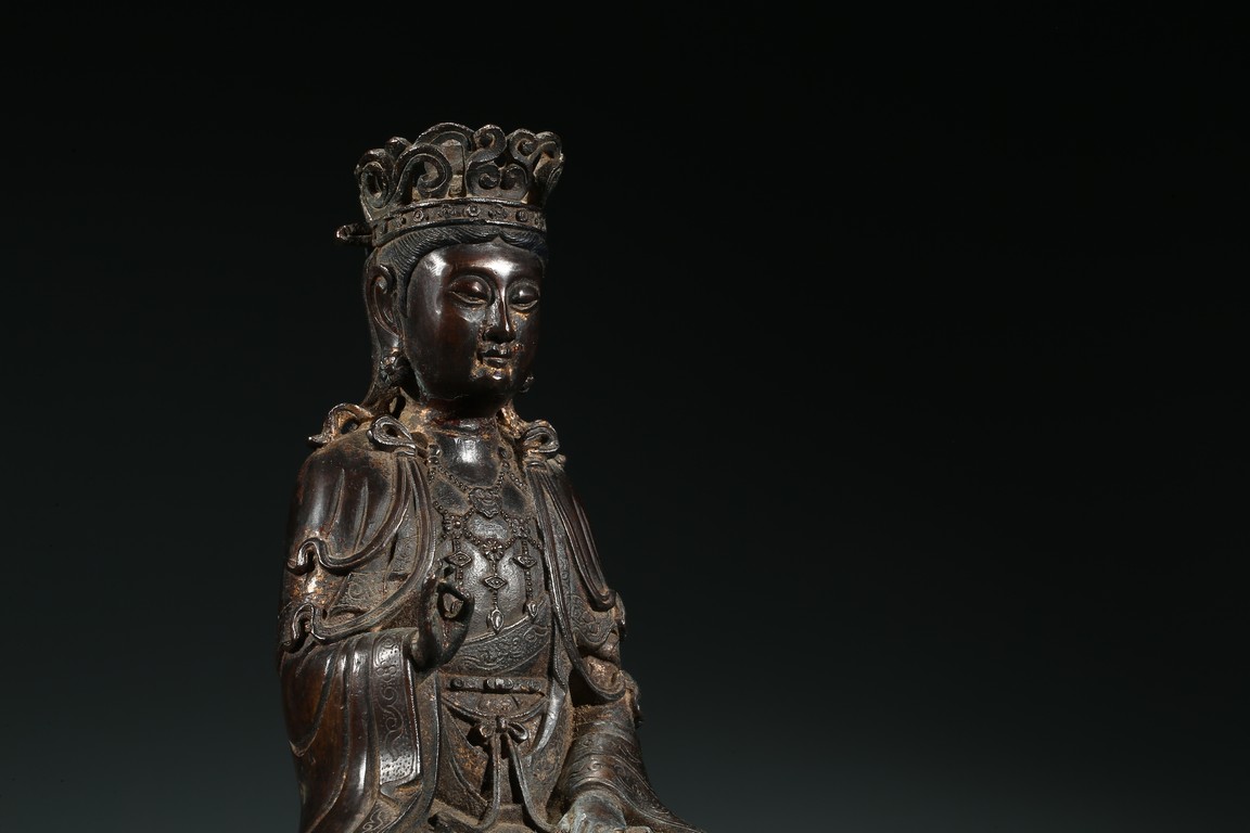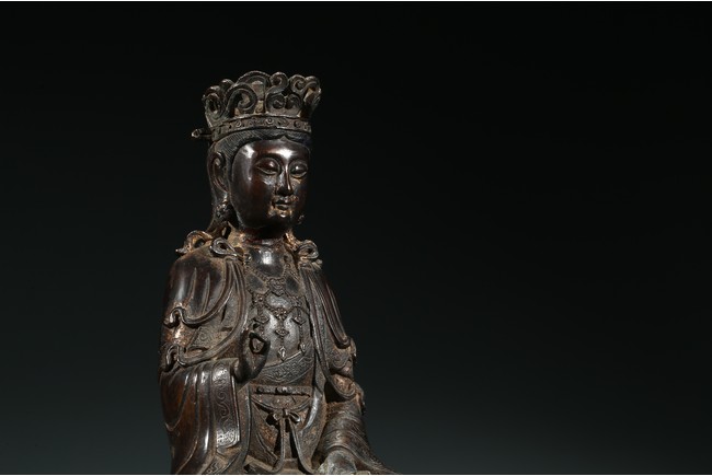 菩薩圓潤的面龐,始終微笑的臉頰令人望之而心安。微閉的眼神,那樣的柔和、慈祥,似乎可以化解芸芸眾生的一切苦難。左手置於膝前,右手拇指和中指輕拈,姿勢優美自然,栩栩如生。菩薩上身著雙領式通肩袈裟,胸部配飾瓔珞釧環,下身著高束腰長裙,衣紋處理採用了漢地傳統雕刻技法,自然流暢,生動寫實。整體做工精細,形態端莊,雕刻細緻入微,時代風格鮮明,為明漢地造像。