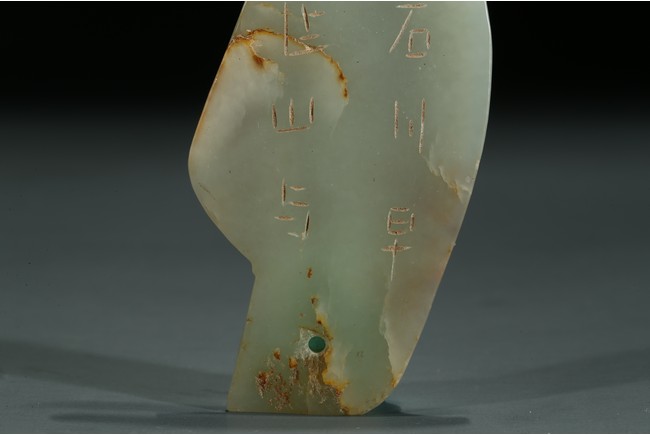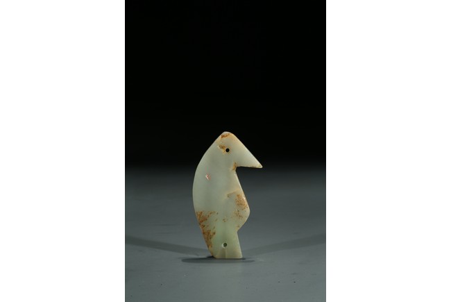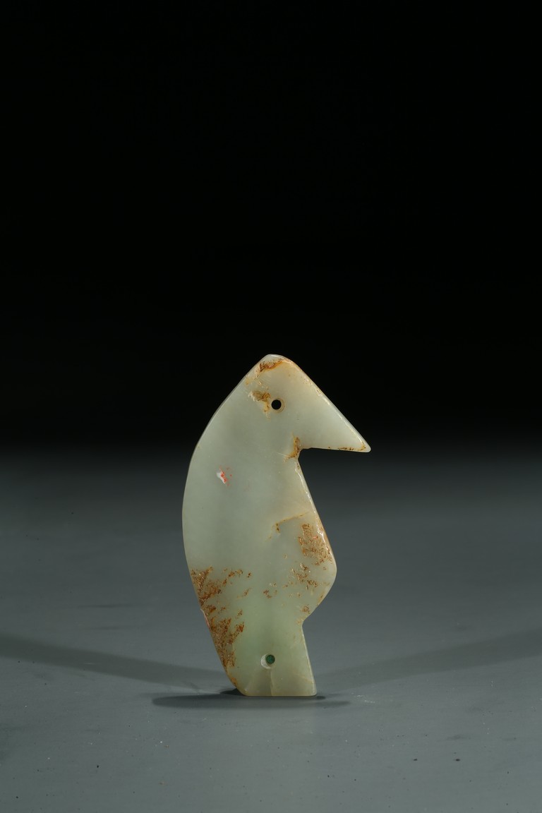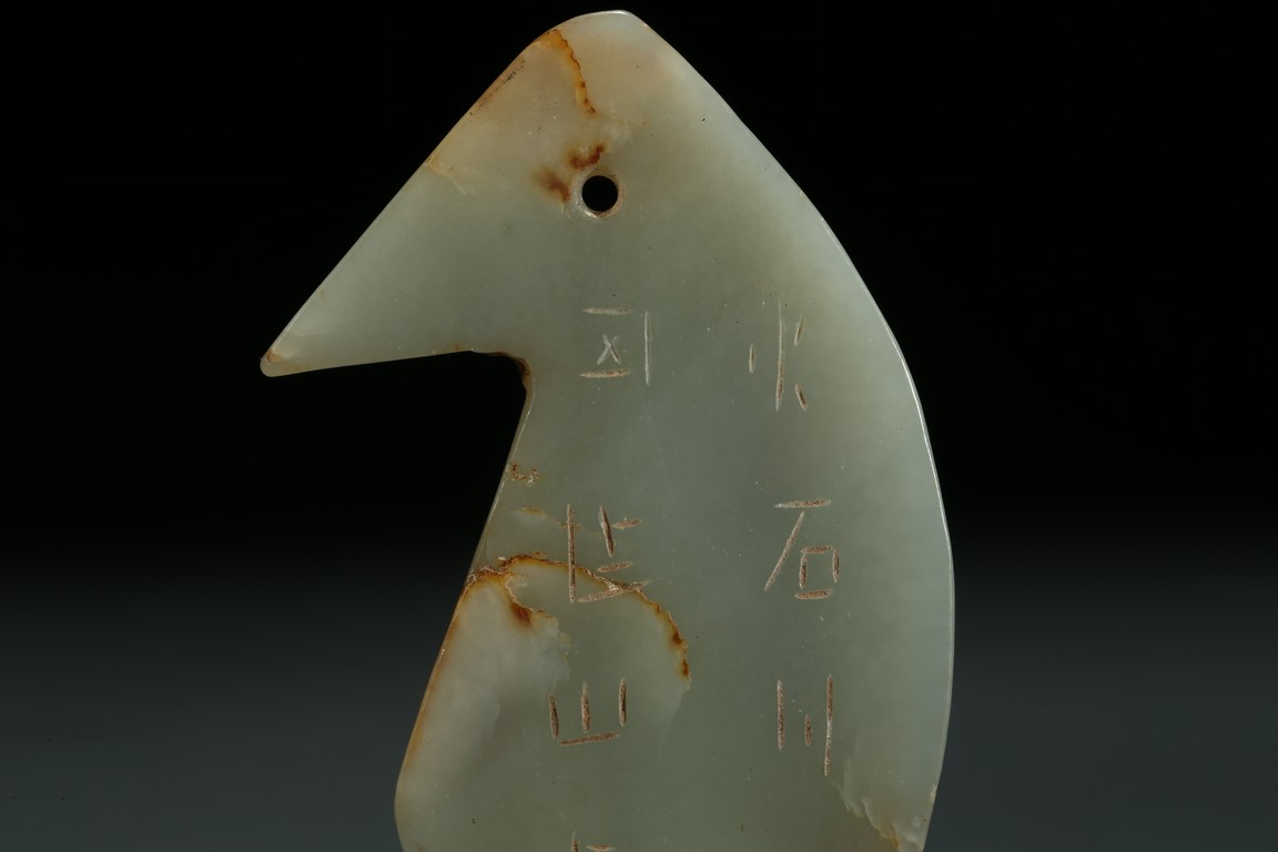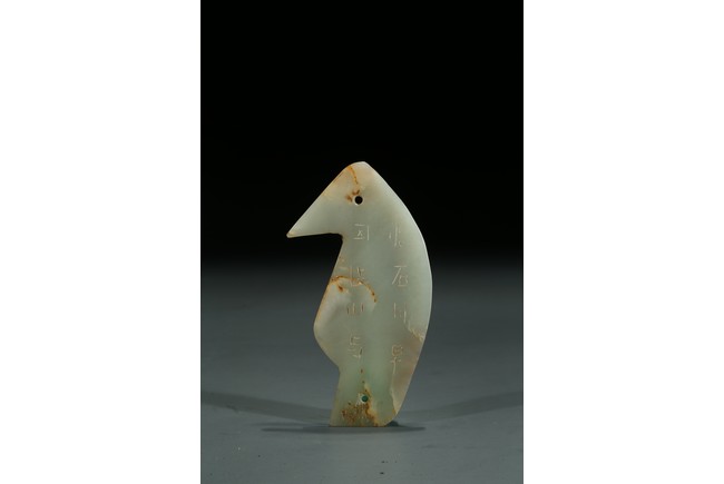 Carved in the form of standing bird figure, the eye and tail drilled with holes, body inscribed in archaic characters.