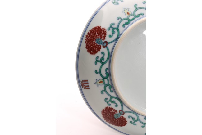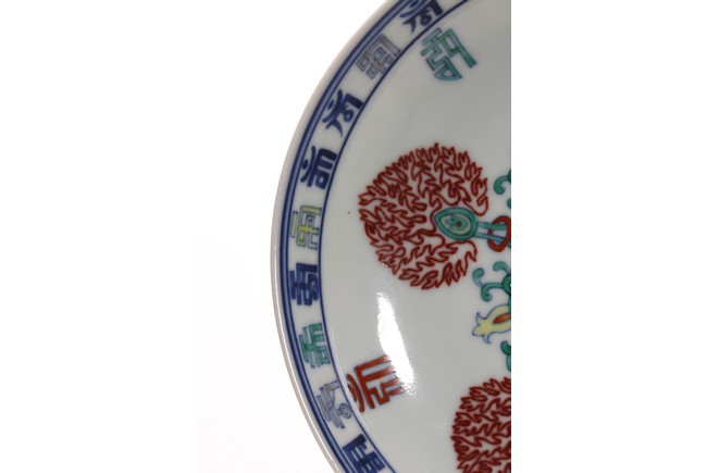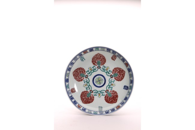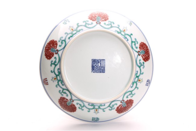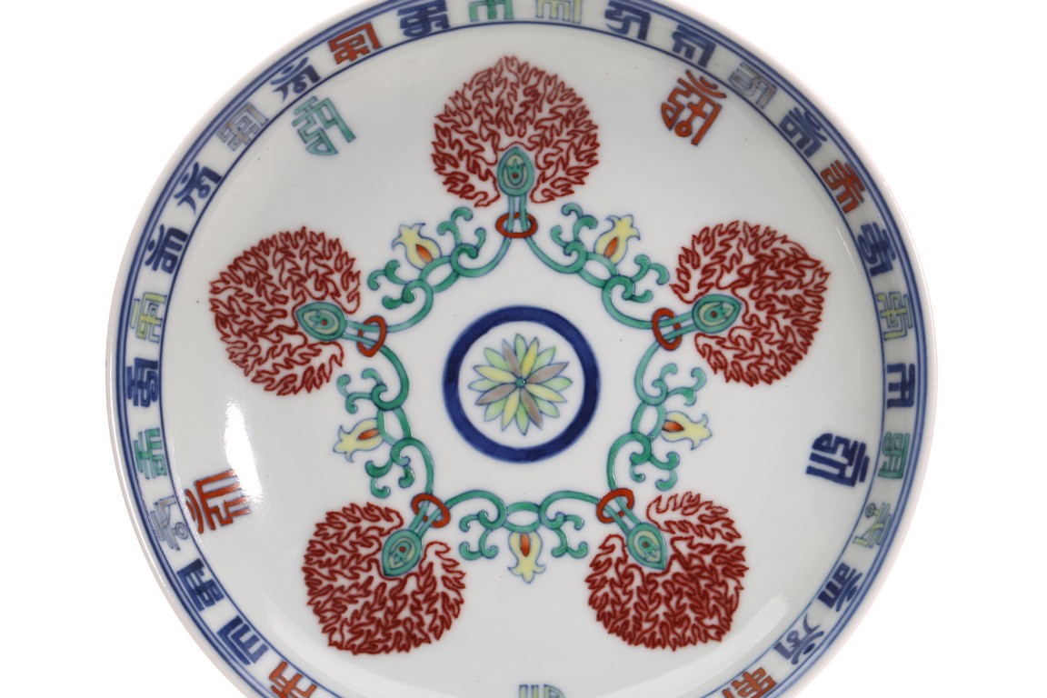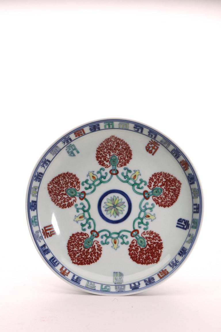 此盤撇口,弧腹,圈足,盤形周正。通體以鬥彩裝飾,內口沿繪一周梵文,內外壁均繪纏枝花卉以梵文間隔,中心繪一團花。整器以紅、黃、綠彩為主色,色彩濃豔。 底足“大清乾隆年制”六字三行篆書款。