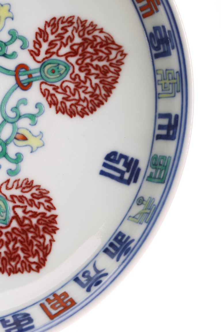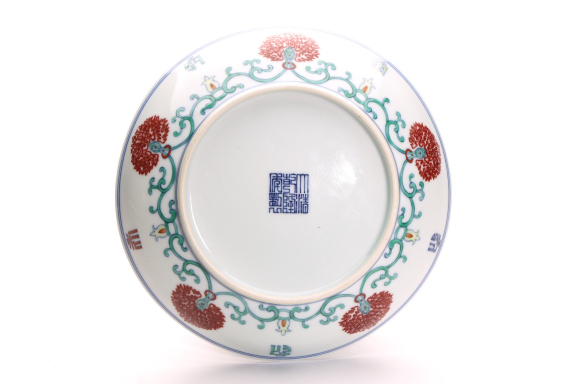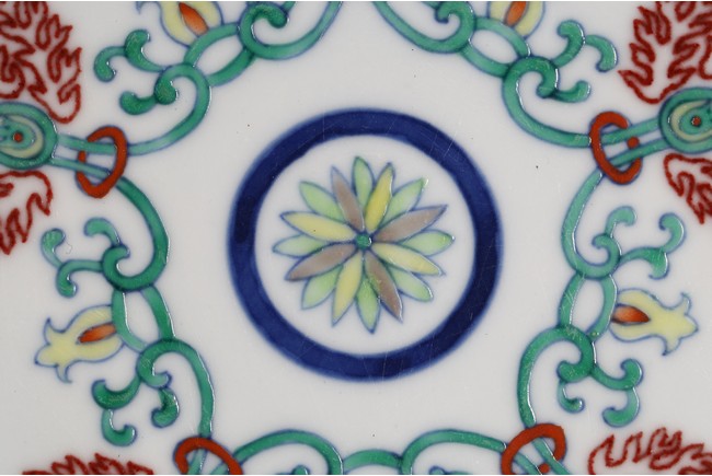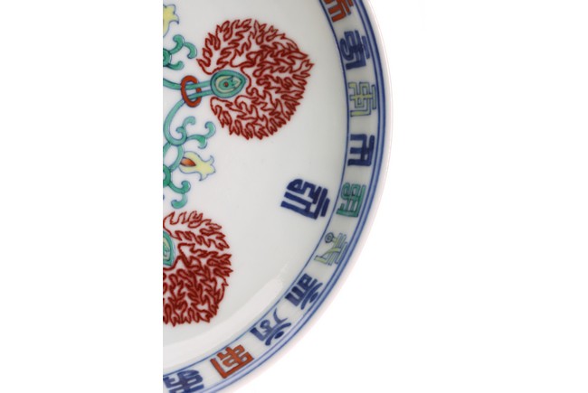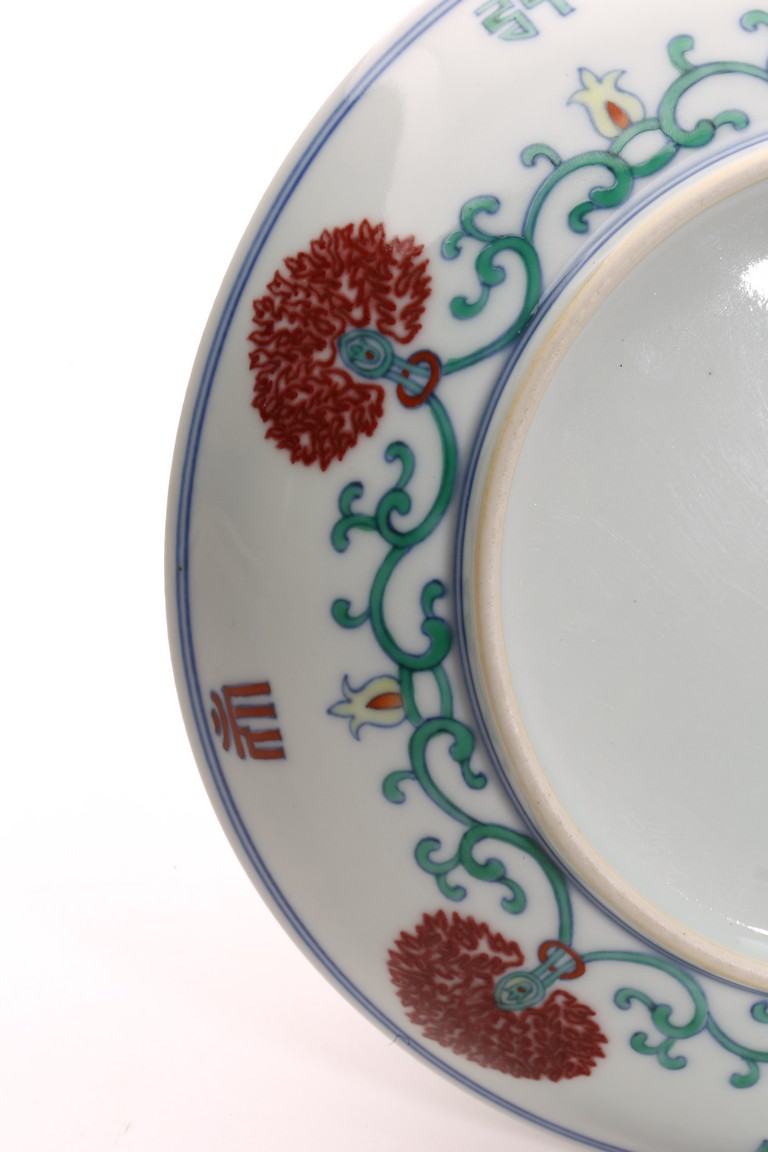此盤撇口,弧腹,圈足,盤形周正。通體以鬥彩裝飾,內口沿繪一周梵文,內外壁均繪纏枝花卉以梵文間隔,中心繪一團花。整器以紅、黃、綠彩為主色,色彩濃豔。 底足“大清乾隆年制”六字三行篆書款。