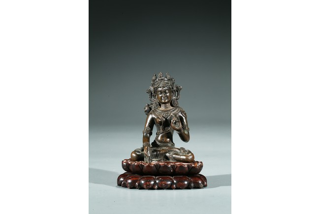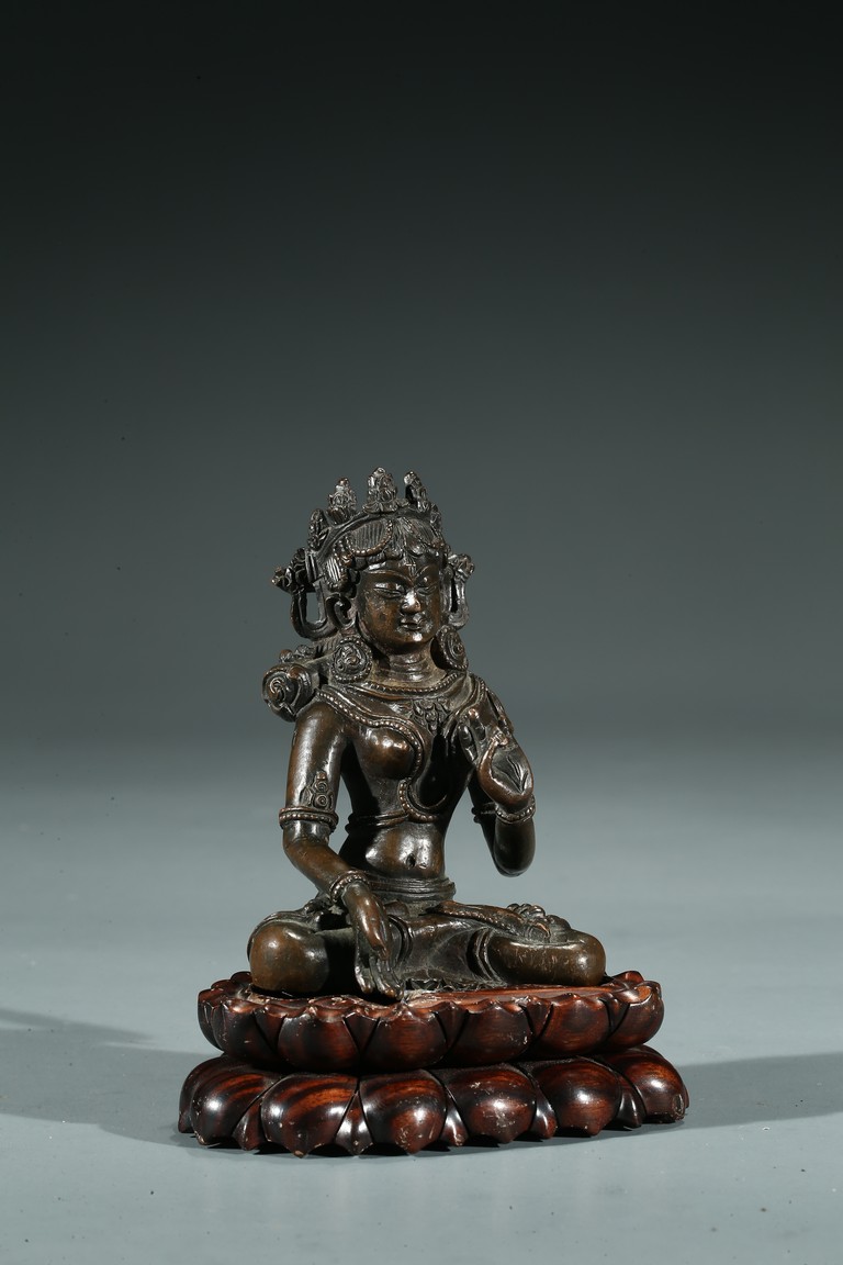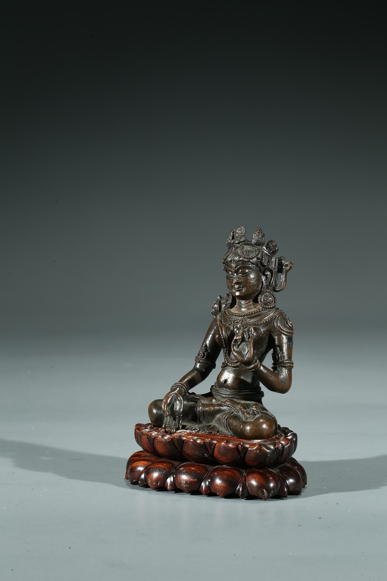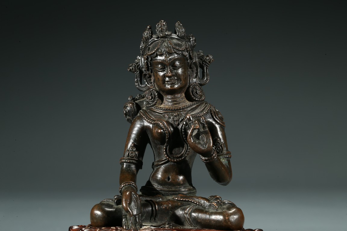 cast seated in dhyanasana on a wood double-lotus base, the right hand lowered in varada mudra, the left hand raised to the chest in vitarka mudra, overall adorned with an elaborate necklace, earrings, and diadem, and further jewelry at the waist, arms, and feet, face with meditative expression, the hair pulled into a high chignon.