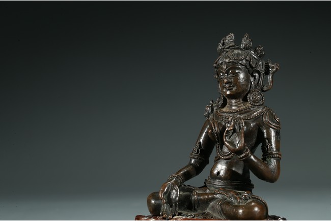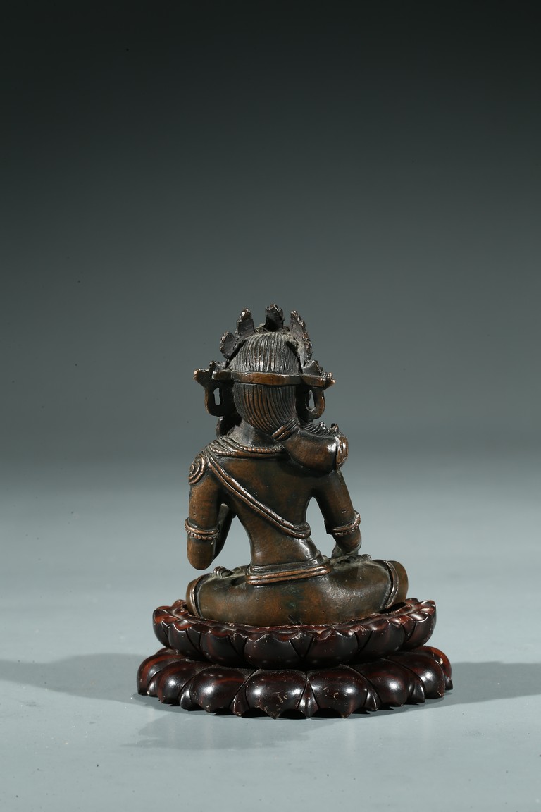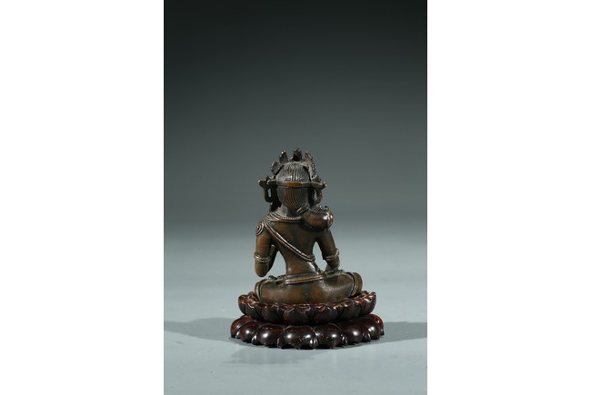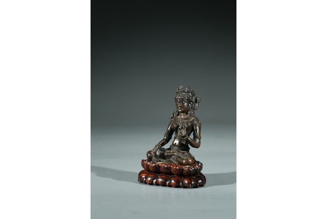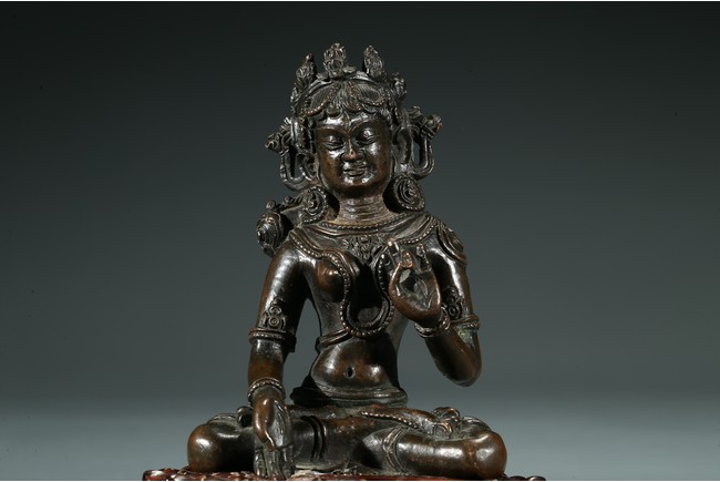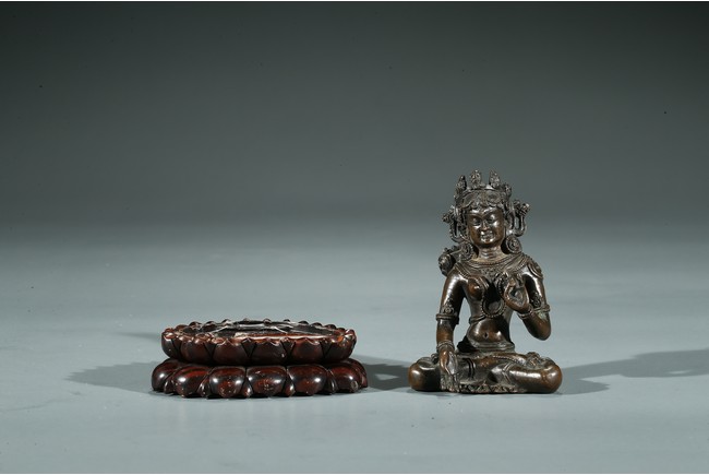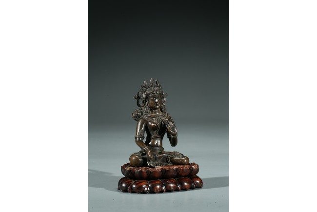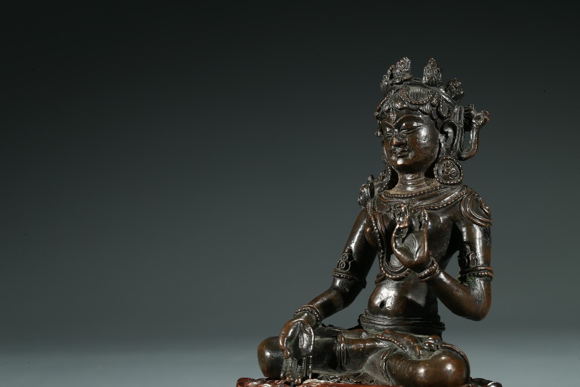 cast seated in dhyanasana on a wood double-lotus base, the right hand lowered in varada mudra, the left hand raised to the chest in vitarka mudra, overall adorned with an elaborate necklace, earrings, and diadem, and further jewelry at the waist, arms, and feet, face with meditative expression, the hair pulled into a high chignon.