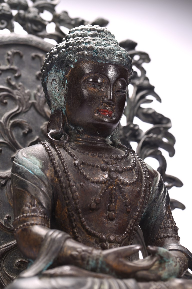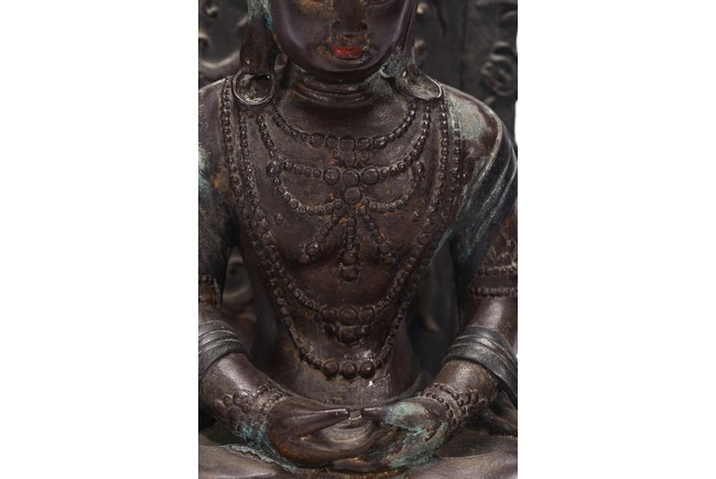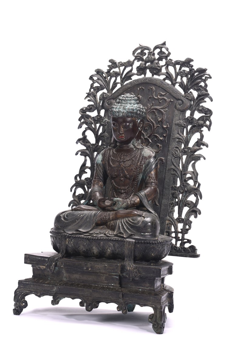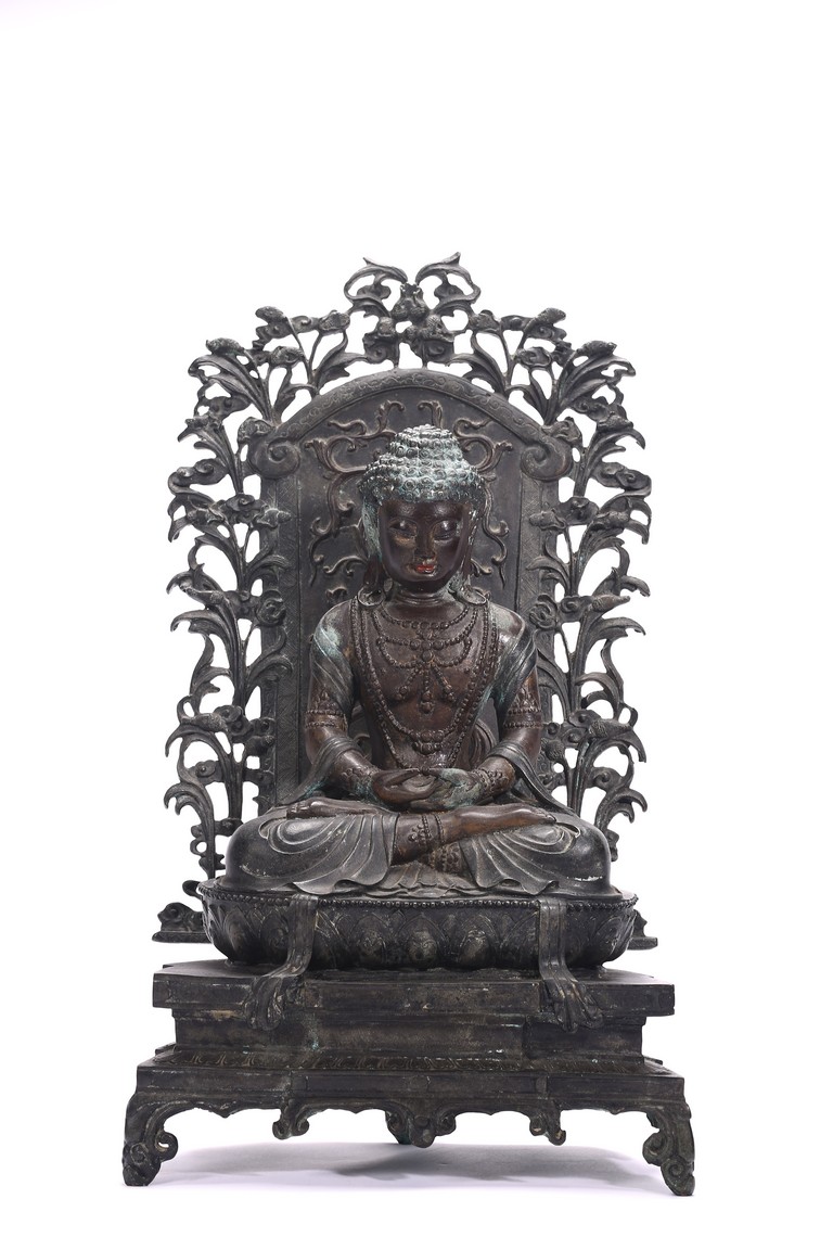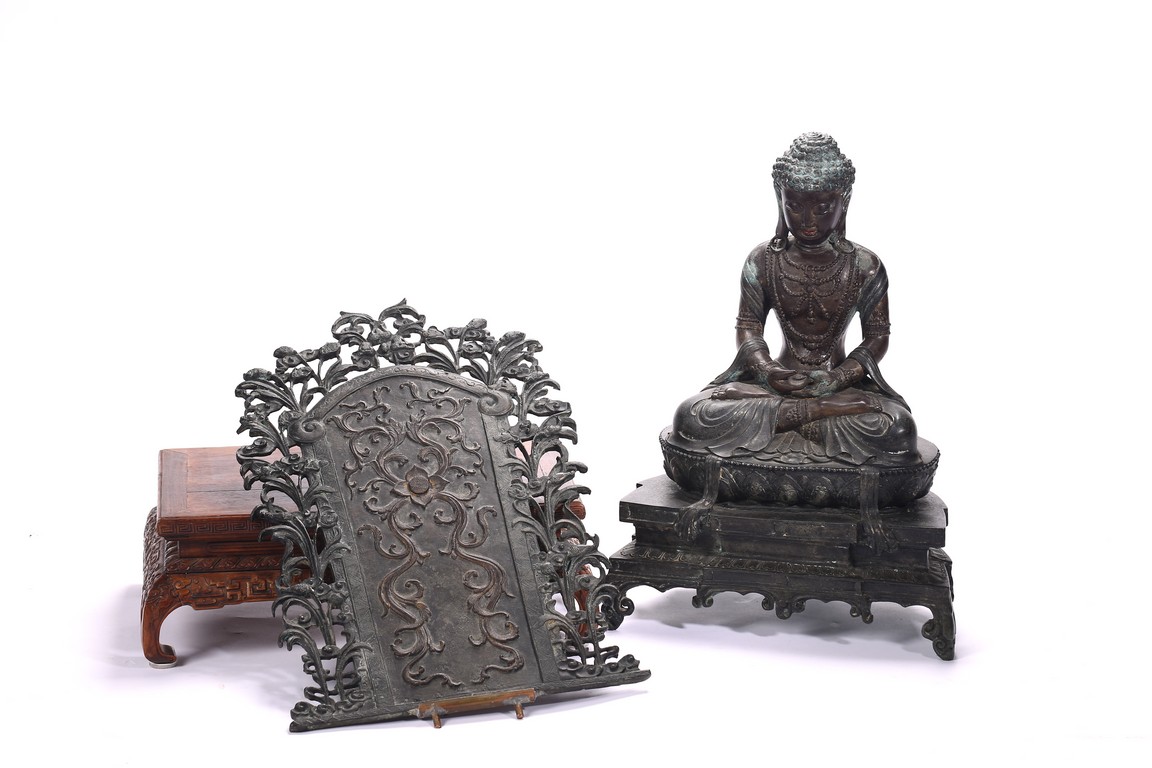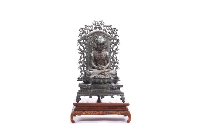 Qing Dynasty period or earlier. Cast in a meditative pose, seated with the hands in dhyana mudra, chest adorned with elaborate jewelry, face with peaceful expression, backed by a delicate backplate, supported on a separated wood stand.