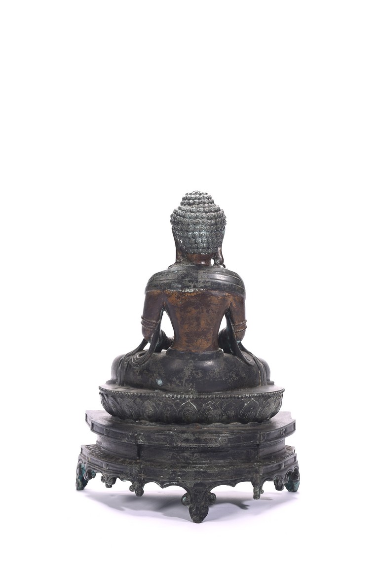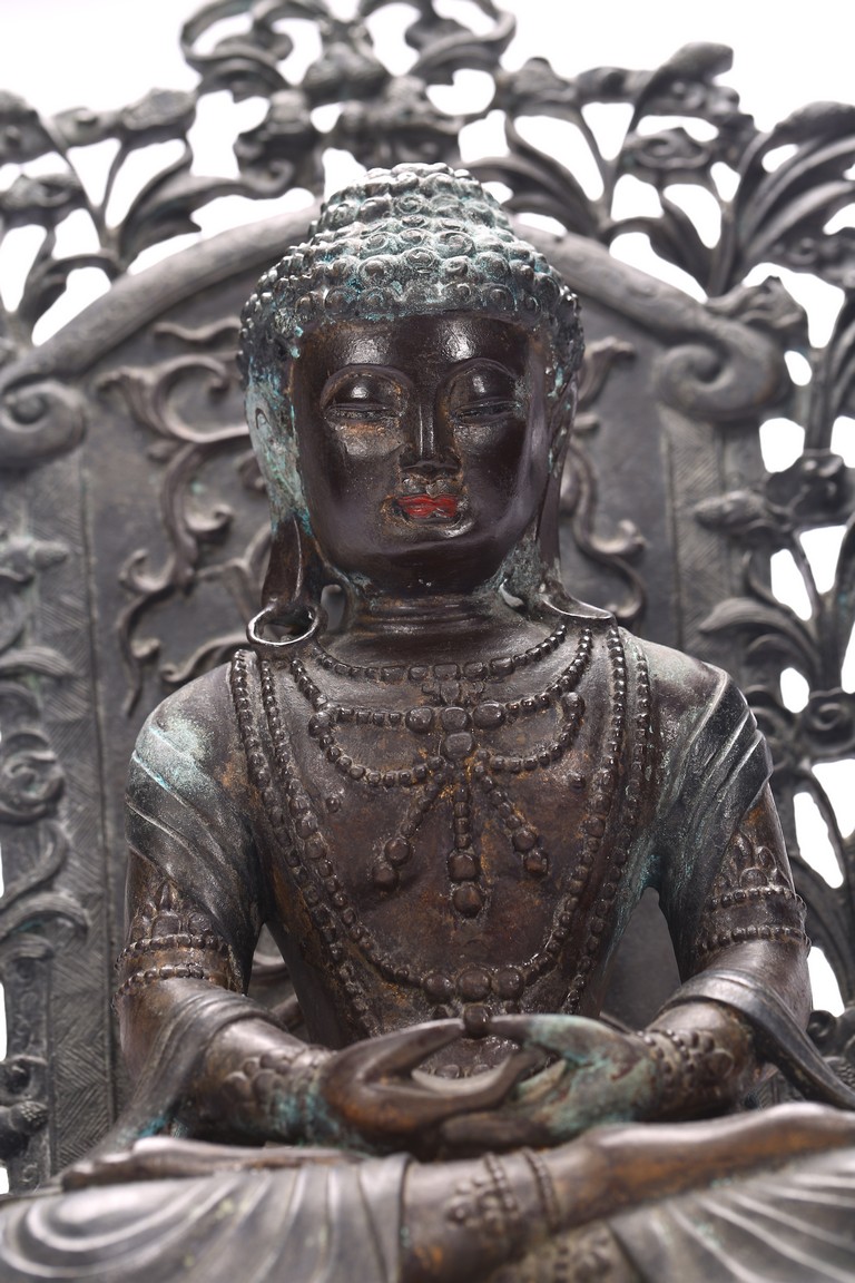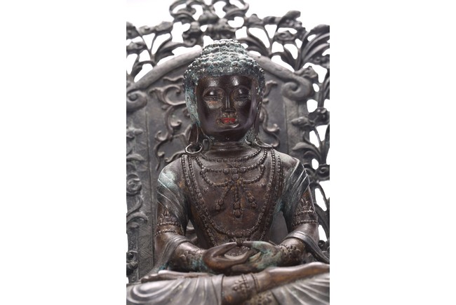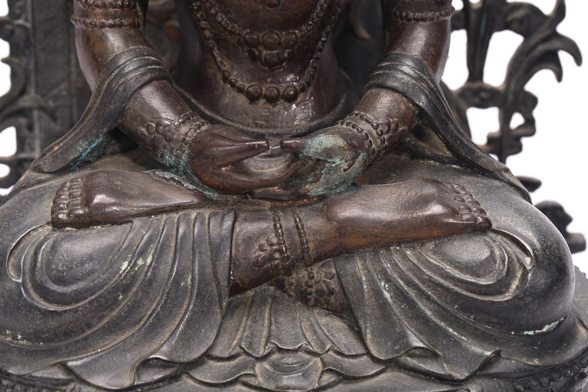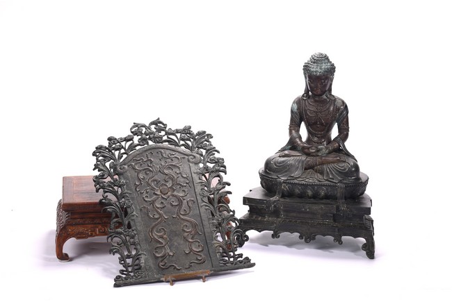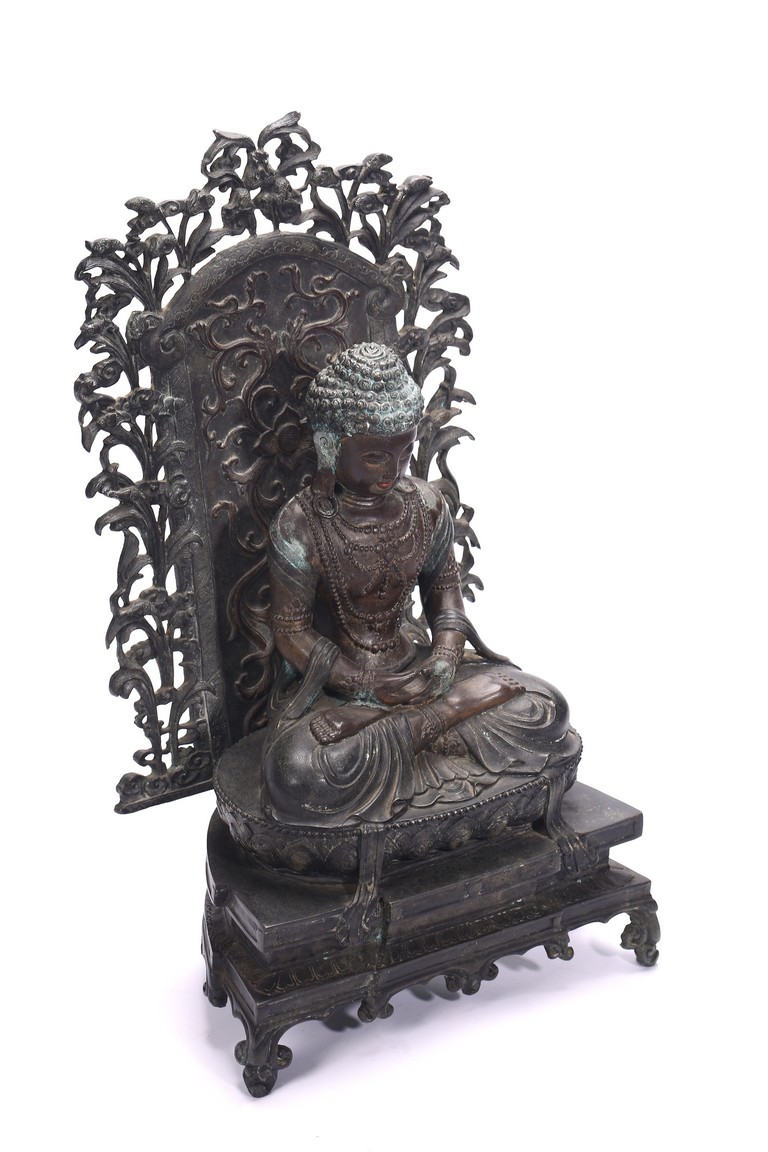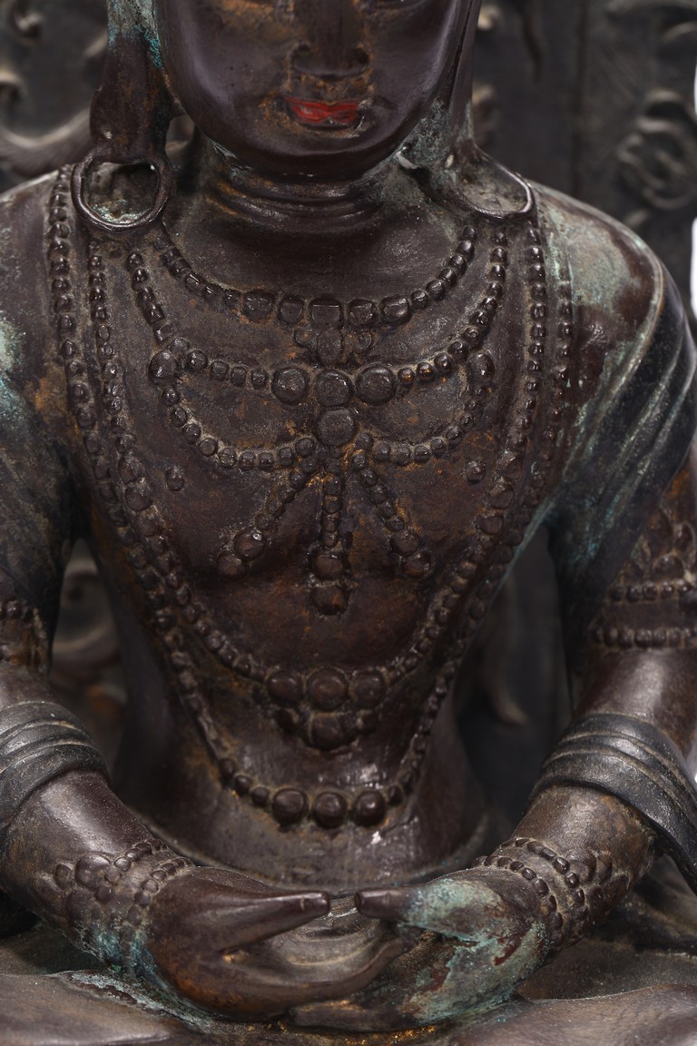 Qing Dynasty period or earlier. Cast in a meditative pose, seated with the hands in dhyana mudra, chest adorned with elaborate jewelry, face with peaceful expression, backed by a delicate backplate, supported on a separated wood stand.