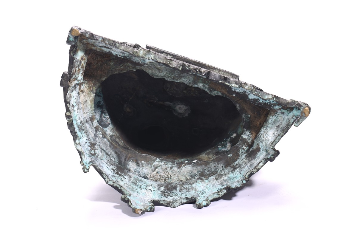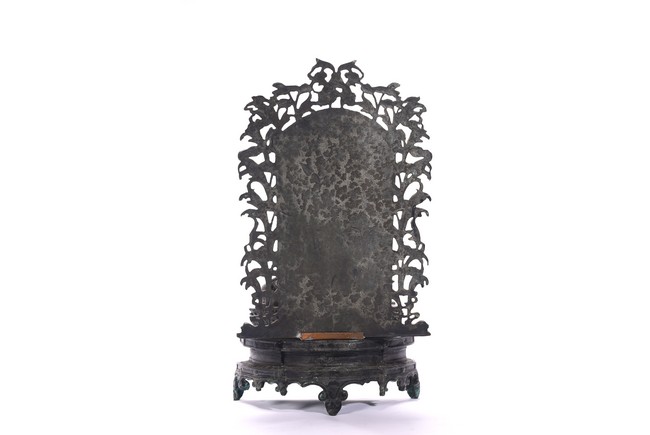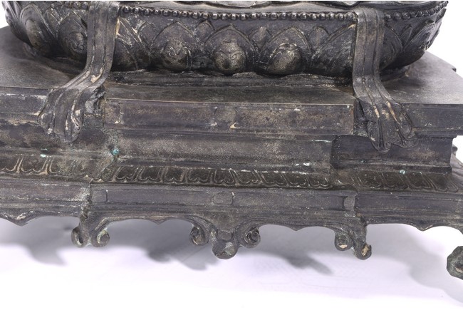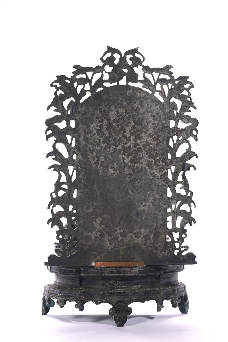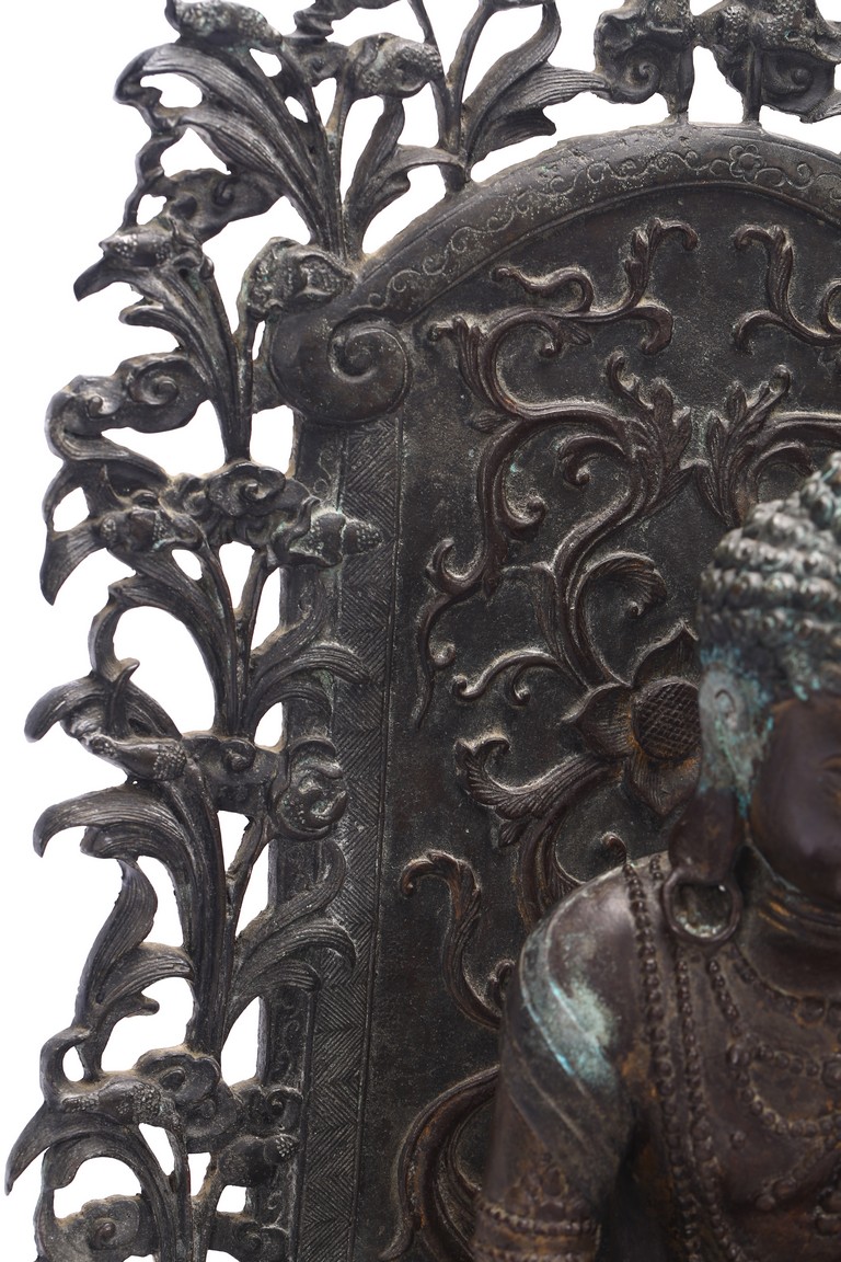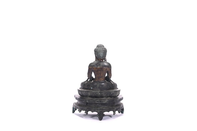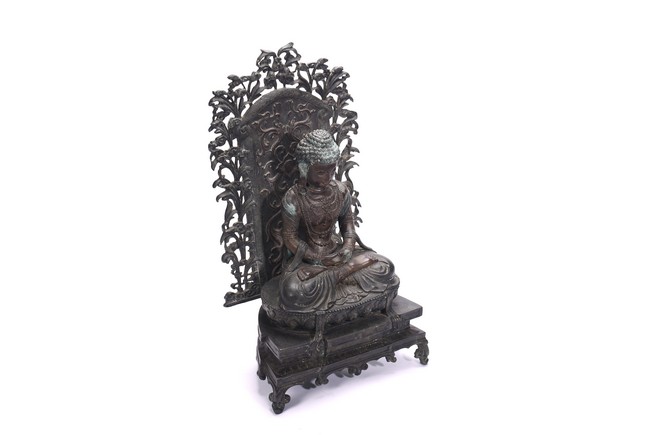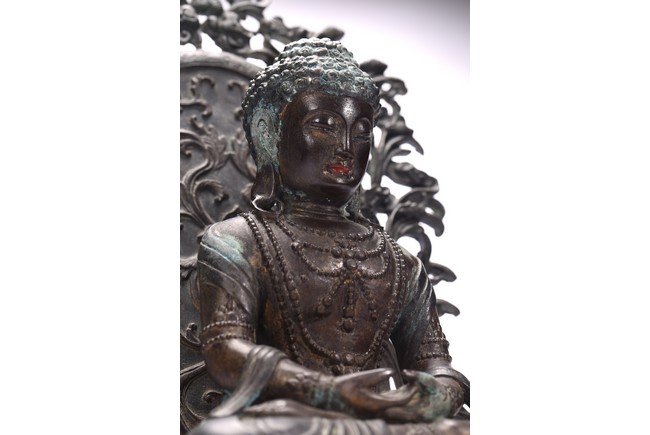 Qing Dynasty period or earlier. Cast in a meditative pose, seated with the hands in dhyana mudra, chest adorned with elaborate jewelry, face with peaceful expression, backed by a delicate backplate, supported on a separated wood stand.