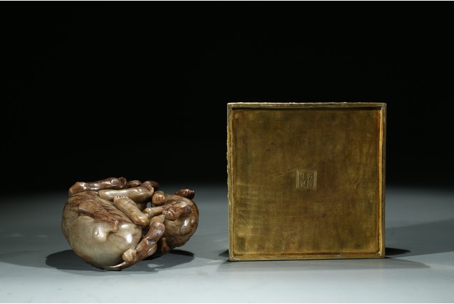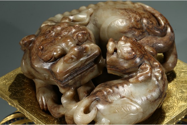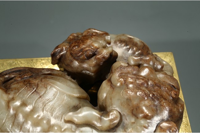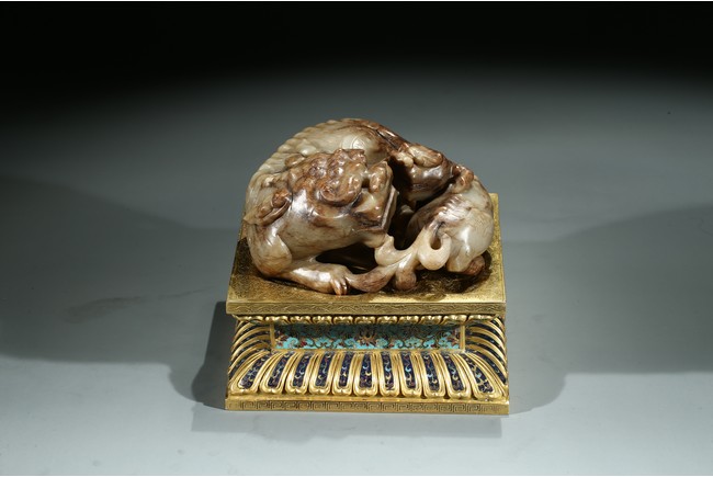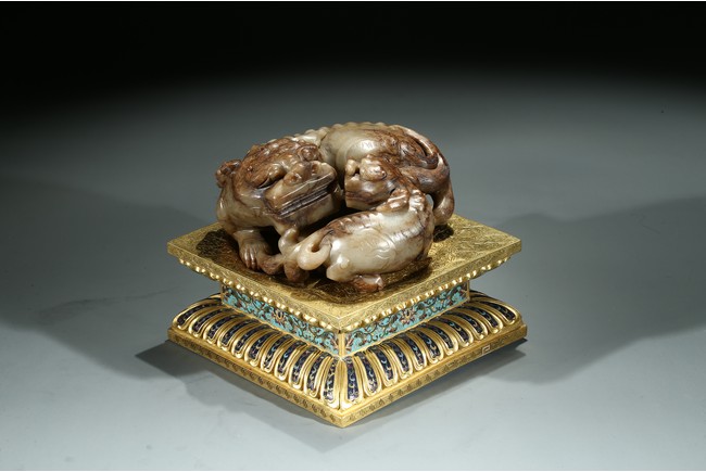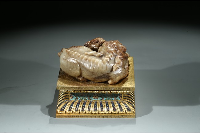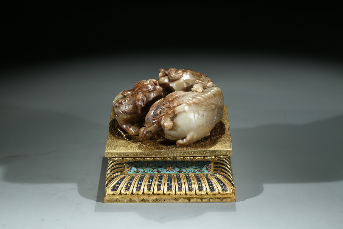 Finely carved in the form of a recumbent lion with its cub, the adult with its head turned to its left, resting on its front paws, its cub seated closely, the head intricately carved with bulbous eyes with flaring nostrils, below bushy eyebrows, the stone is of celadon tone with russet inclusions, all supported on square cloisonne enamel stand.