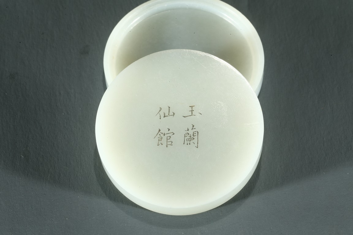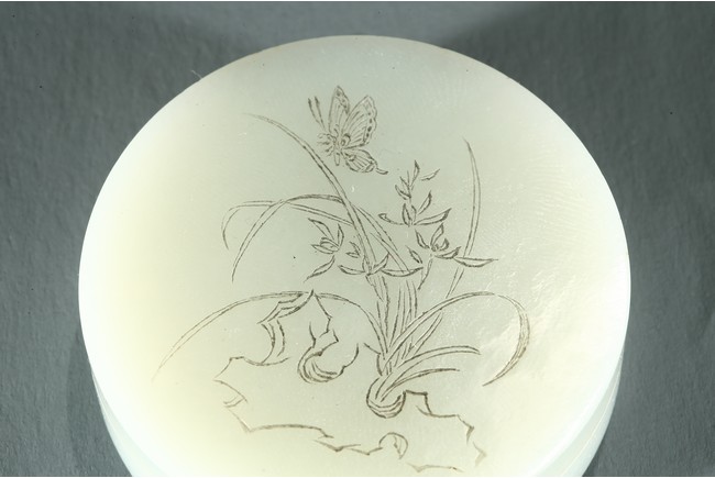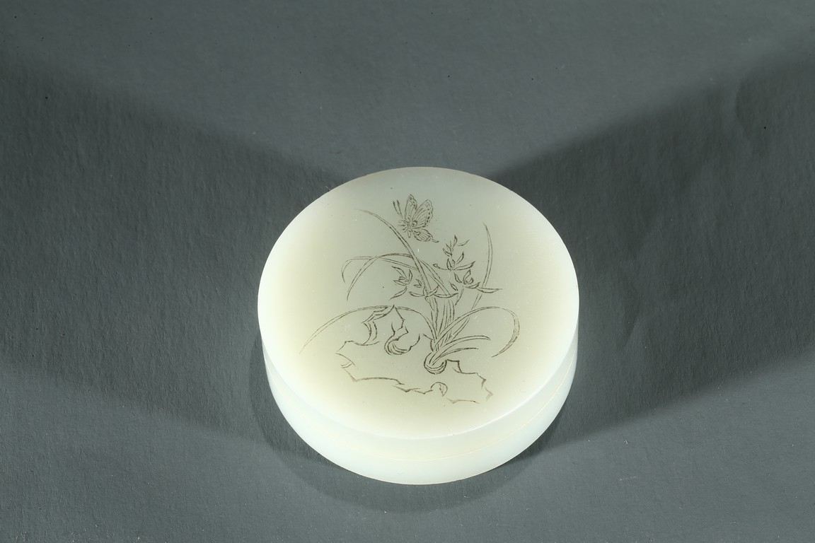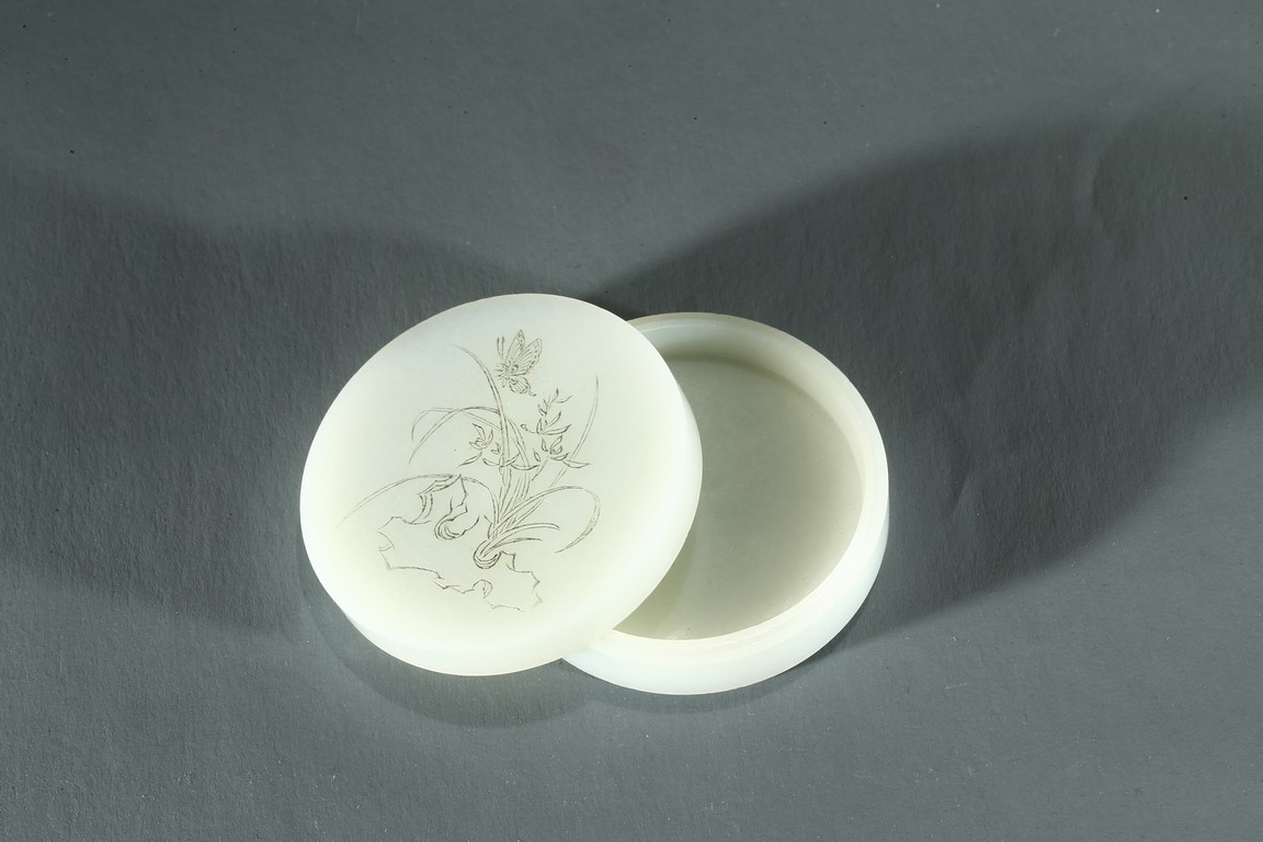 Of circular form, the cover incised with orchids and butterfly and base with four character inscription.