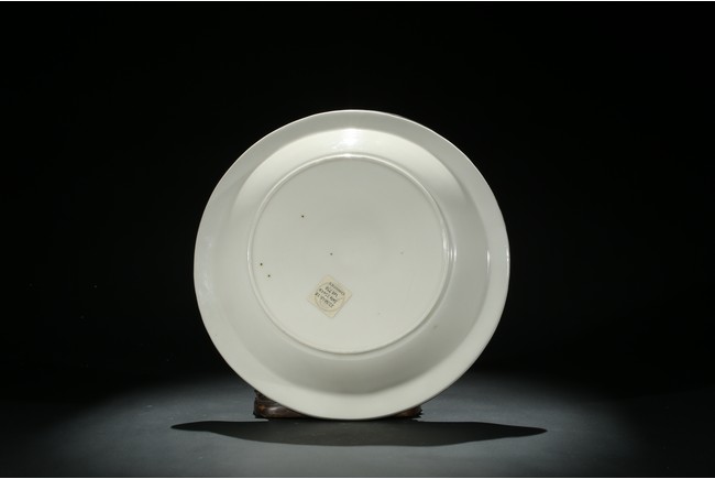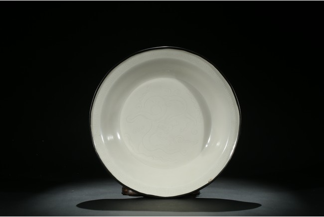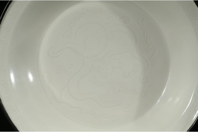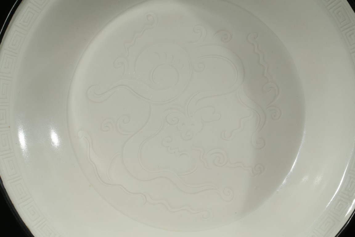 The gently curved sides rising from circular base and short straight foot to a broad everted lipped rim bounded with metal with key-fret pattern, the center decorated with a writhing chilong within auspicious clouds. Song Dynasty period.