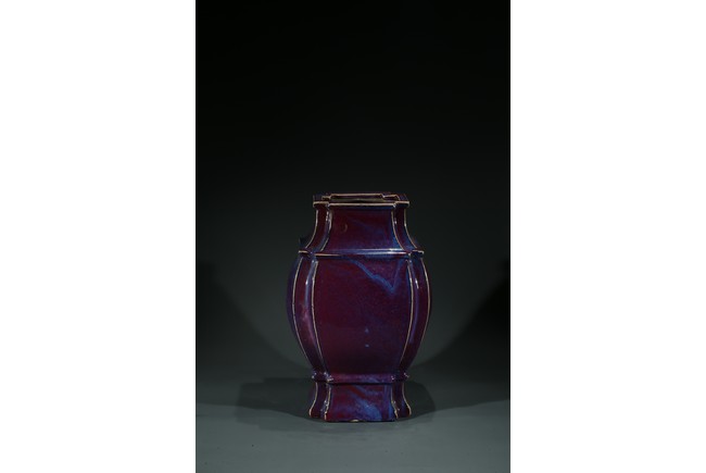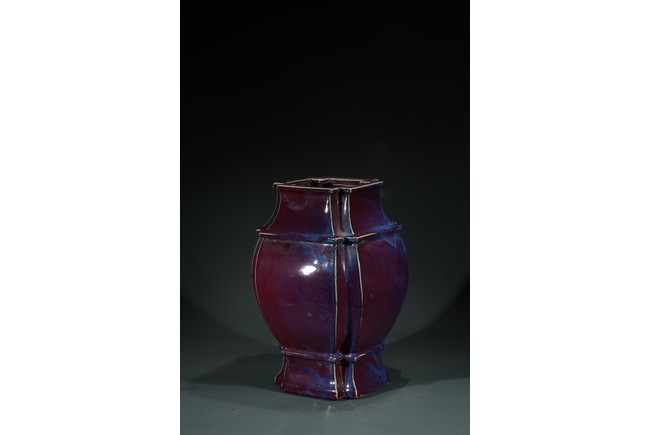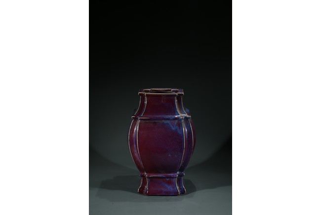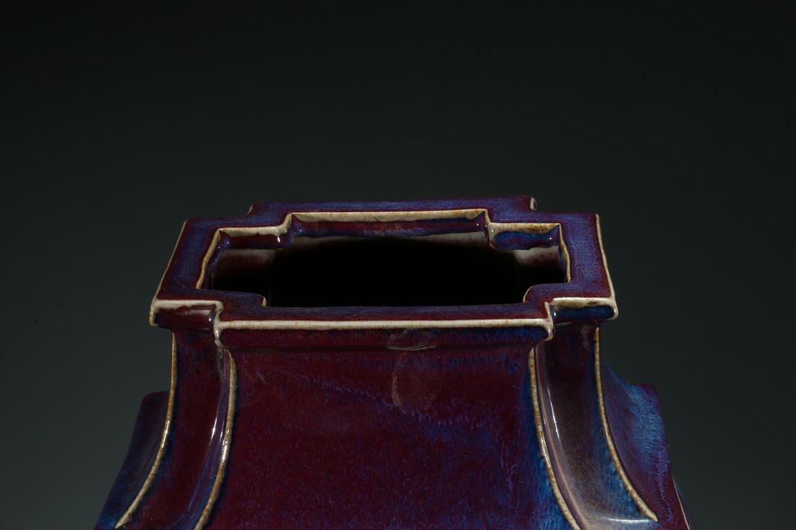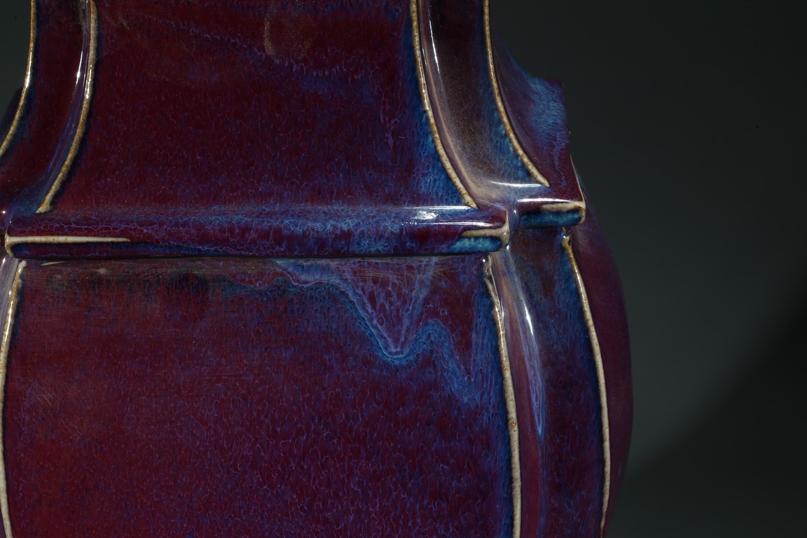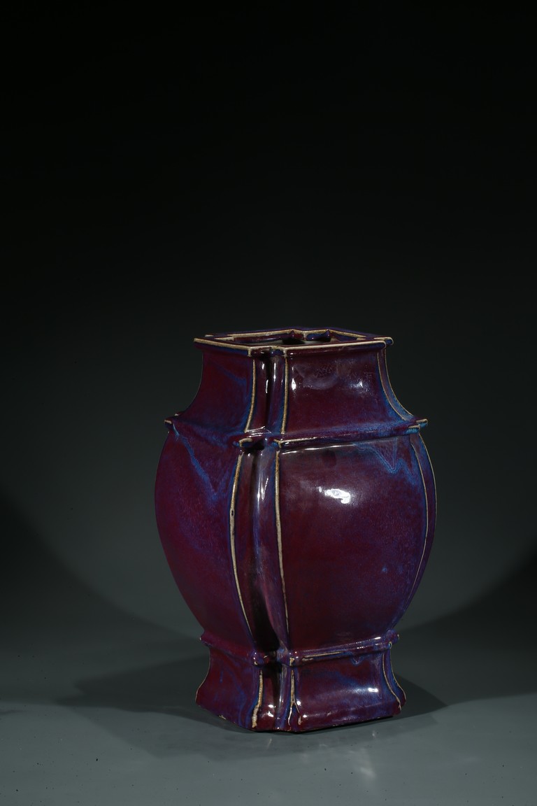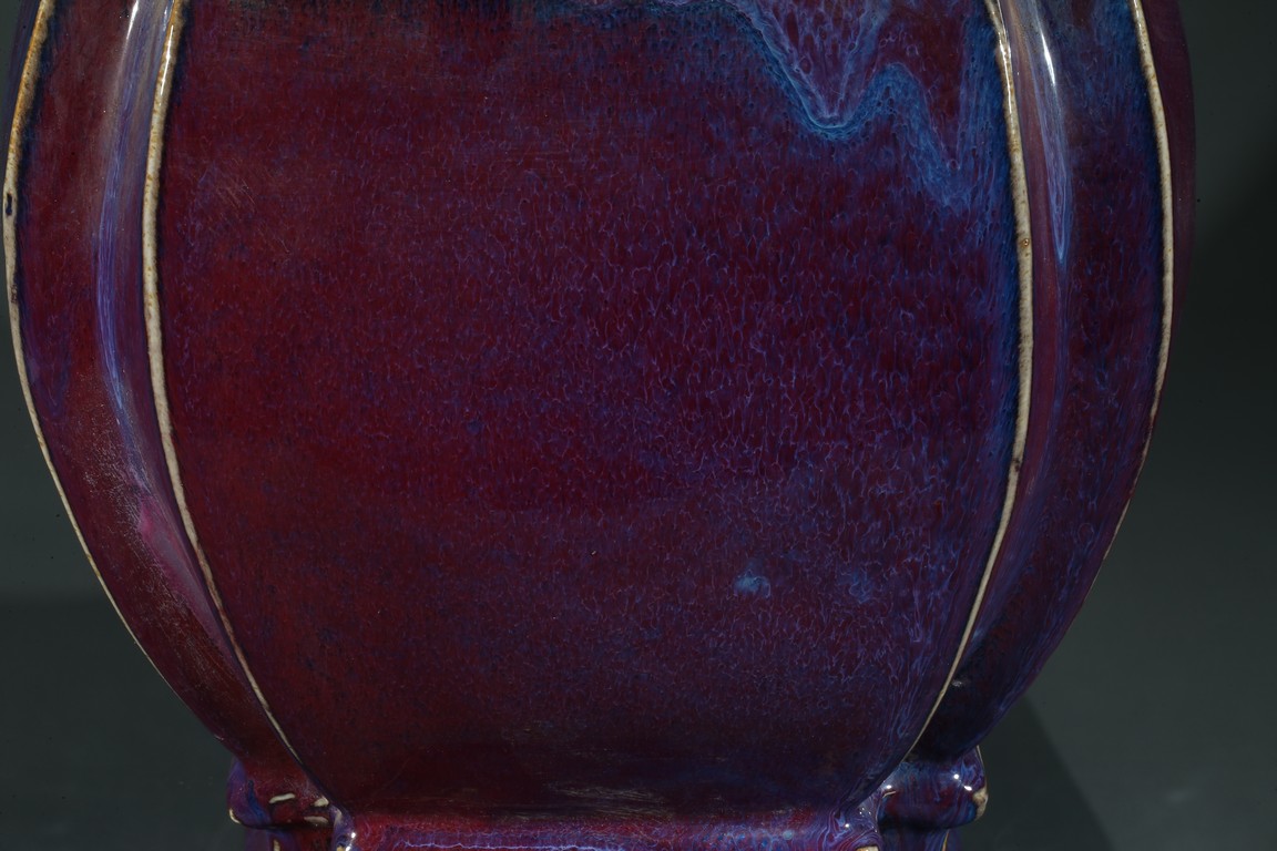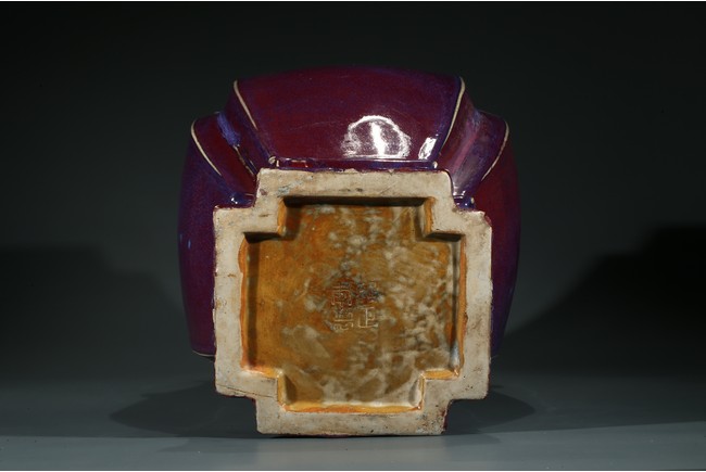 Sturdily potted, the baluster body rising from splayed foot to waisted neck, covered overall with purplish red tone with areas of lavender and violet, the base applied with mottled brown glaze and four character mark.
