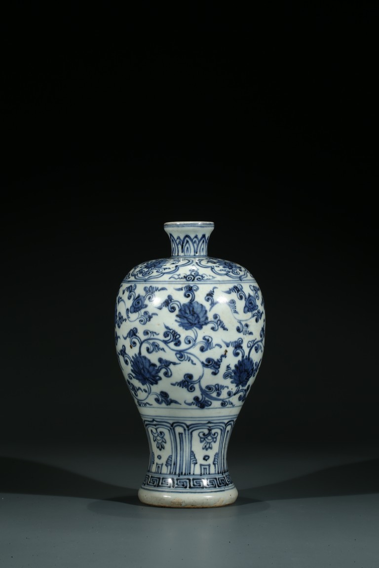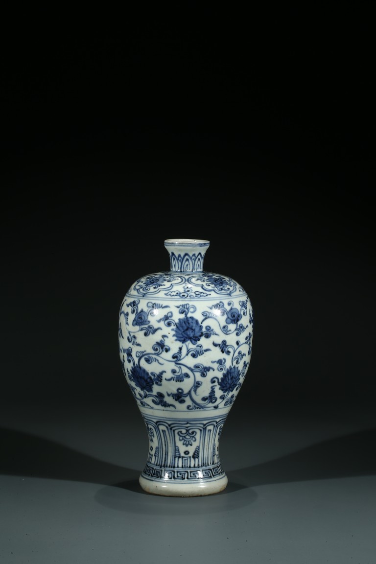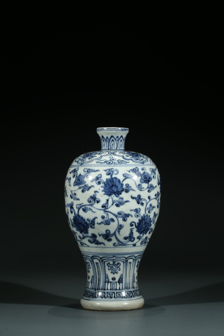 Painted around the body with a composite floral scroll of peonies, below a band of quatrefoil cartouches enclosing flower sprays around shoulder, the foot encircled with a band of upright leave lappet and key-fret band, base left unglazed.