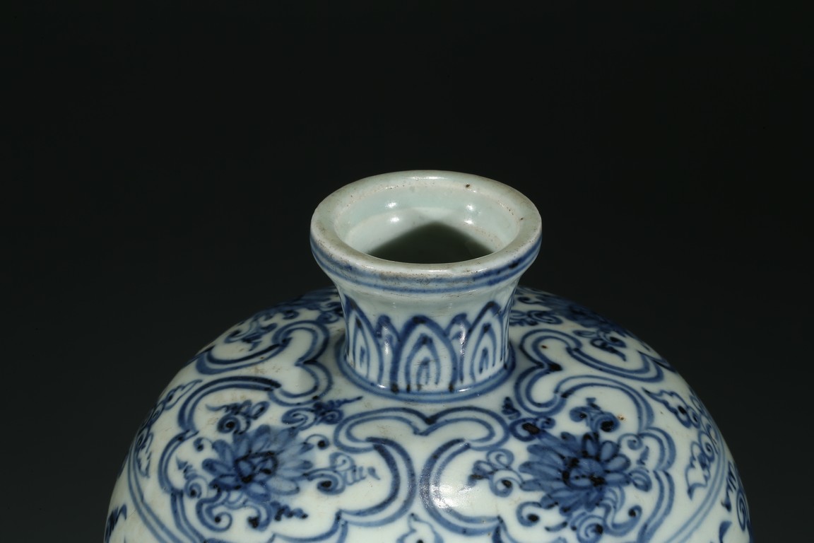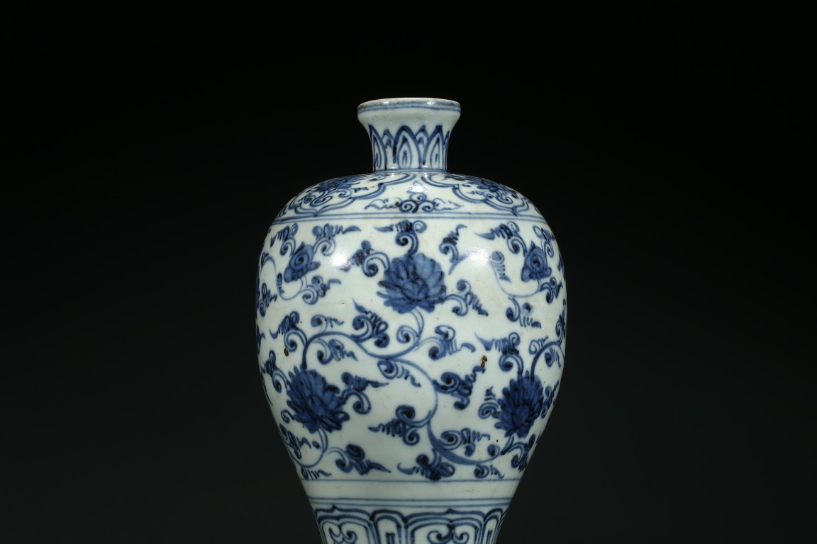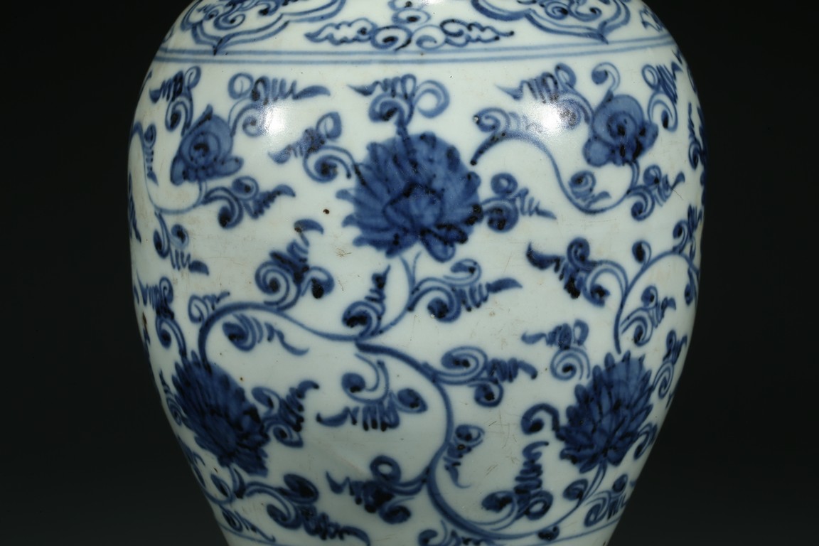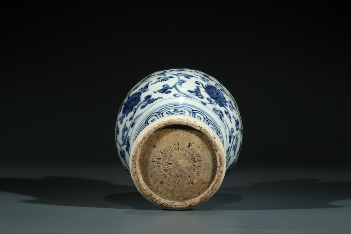 Painted around the body with a composite floral scroll of peonies, below a band of quatrefoil cartouches enclosing flower sprays around shoulder, the foot encircled with a band of upright leave lappet and key-fret band, base left unglazed.