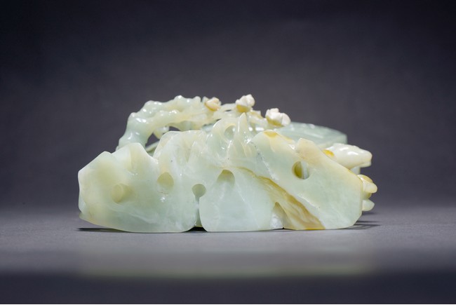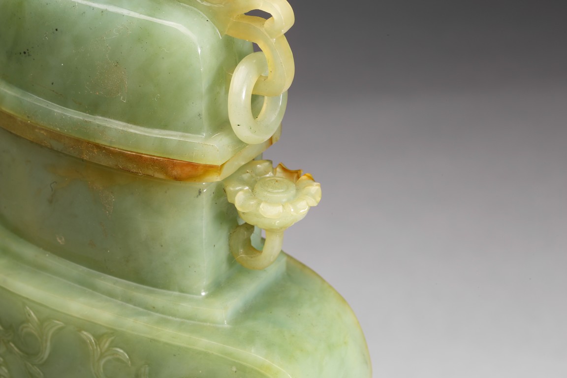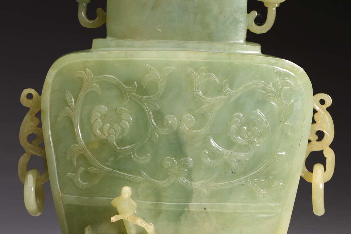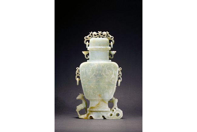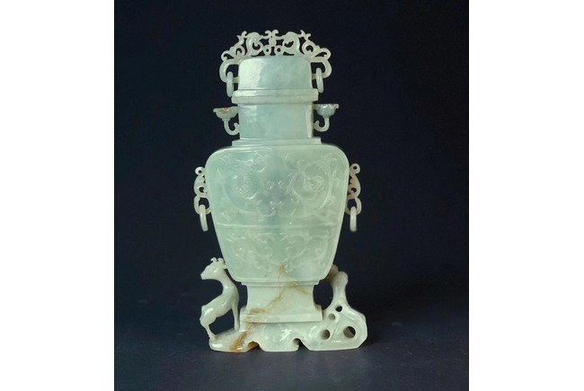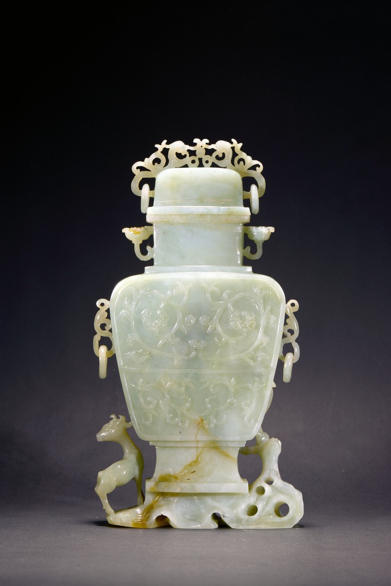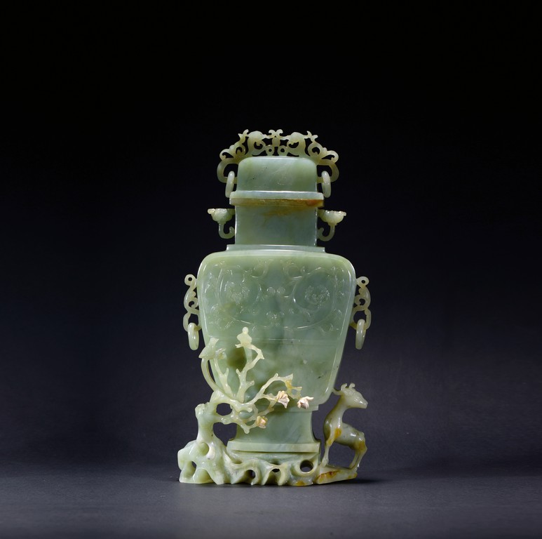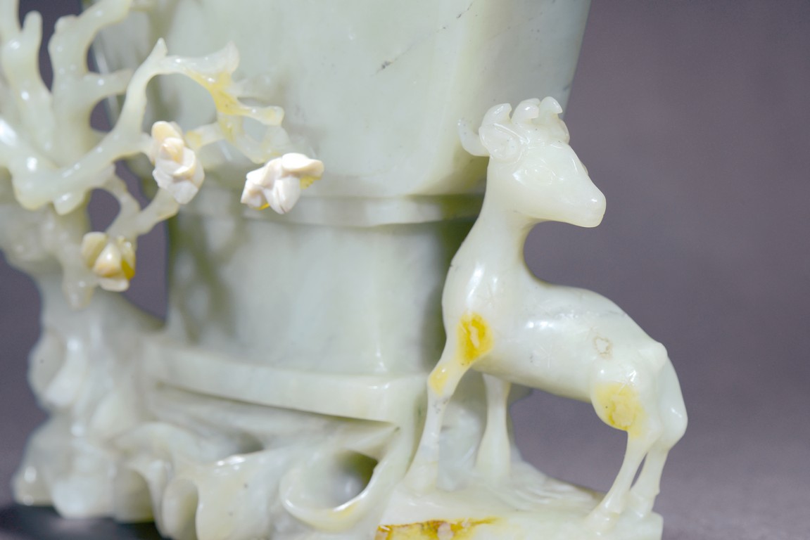 Qing Dynasty period. The body of the vase carved in shallow relief with scroll foliate pattern, with straight neck and cover topped with openwork finial, all supported on openwork rockwork base, with a gnarled tree issuing from the side and birds perching on the branches, and a deer standing foursquare to the other side.