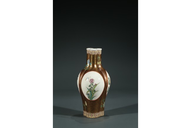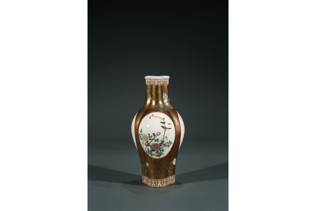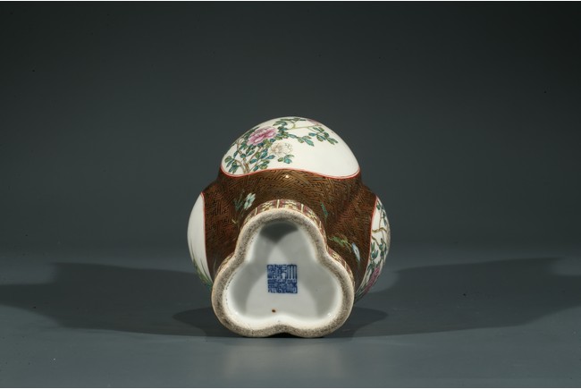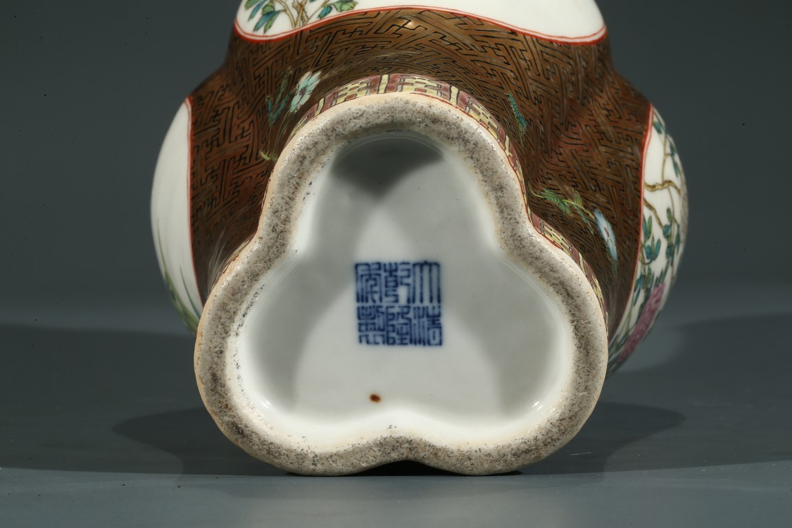 Of finely potted globular tri-lobed form, rising to three slender cylindrical necks with an everted mouth, each lobe painted with a cartouche enclosing the scene of flowers and birds, the base with six character Qianlong mark.