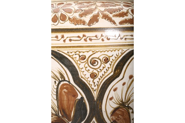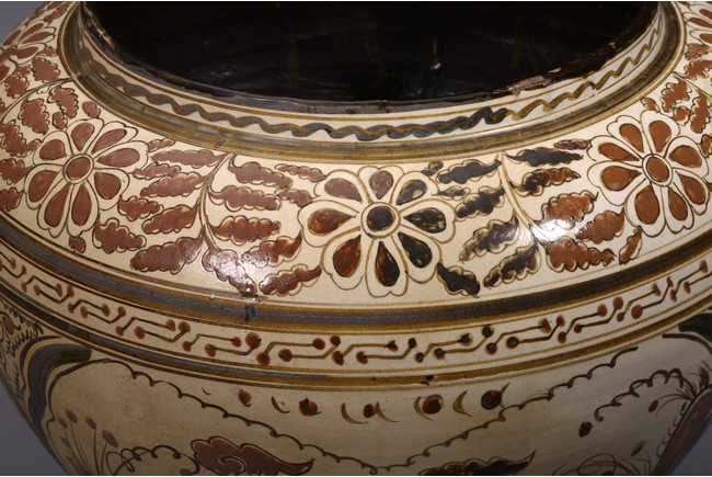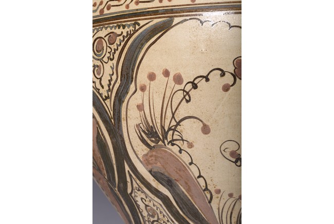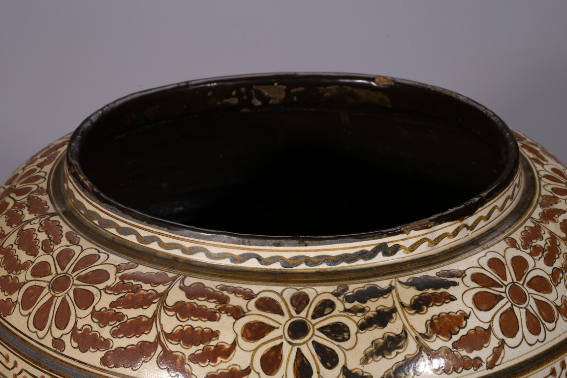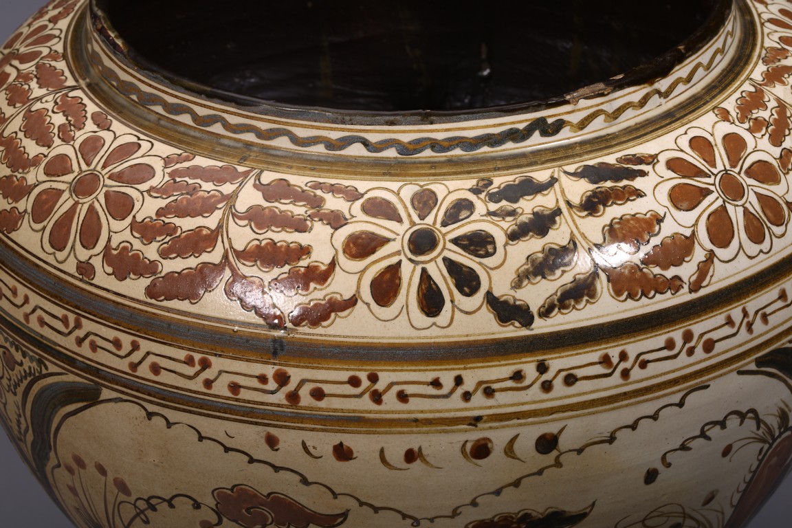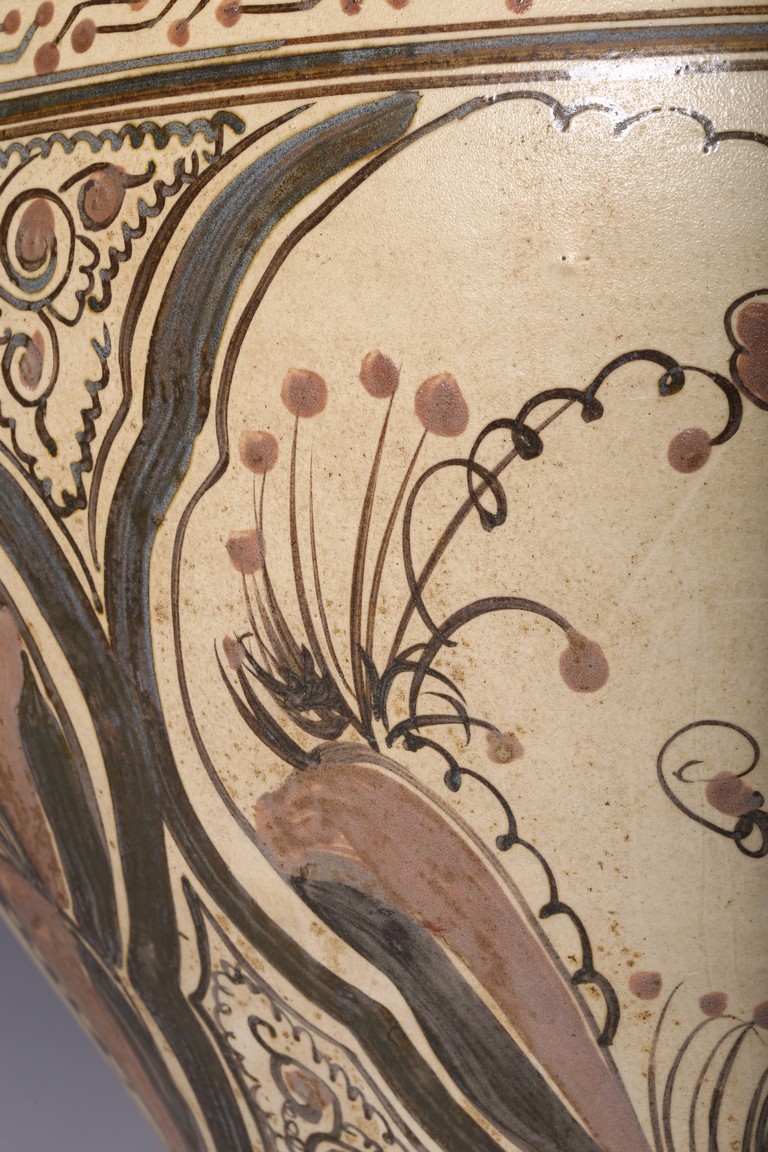Yuan Dynasty period. The high-shouldered, tapering body is boldly painted in brown pigments with crane standing on one foot surrounded by orchids enclosed in lobed cartouches, the shoulder decorated with a band of leafy flowers and foot with a band of upright leaves, base unglazed revealing pale brown body.