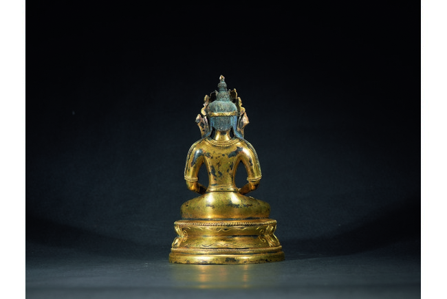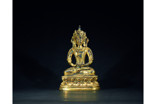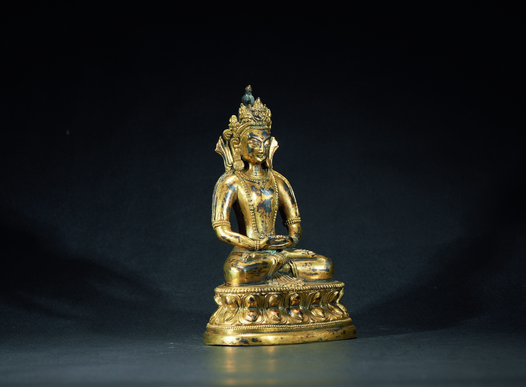 Qing Dynasty period. Shown seated in dhyanasana on a double-lotus throne, the hands in dhyana mudra, wearing beaded jewellery and a diaphanous dhoti with finely embroidered hem, the hair arranged in a high ushnisha, held back by a five-peaked crown.