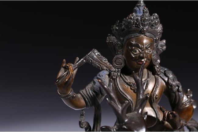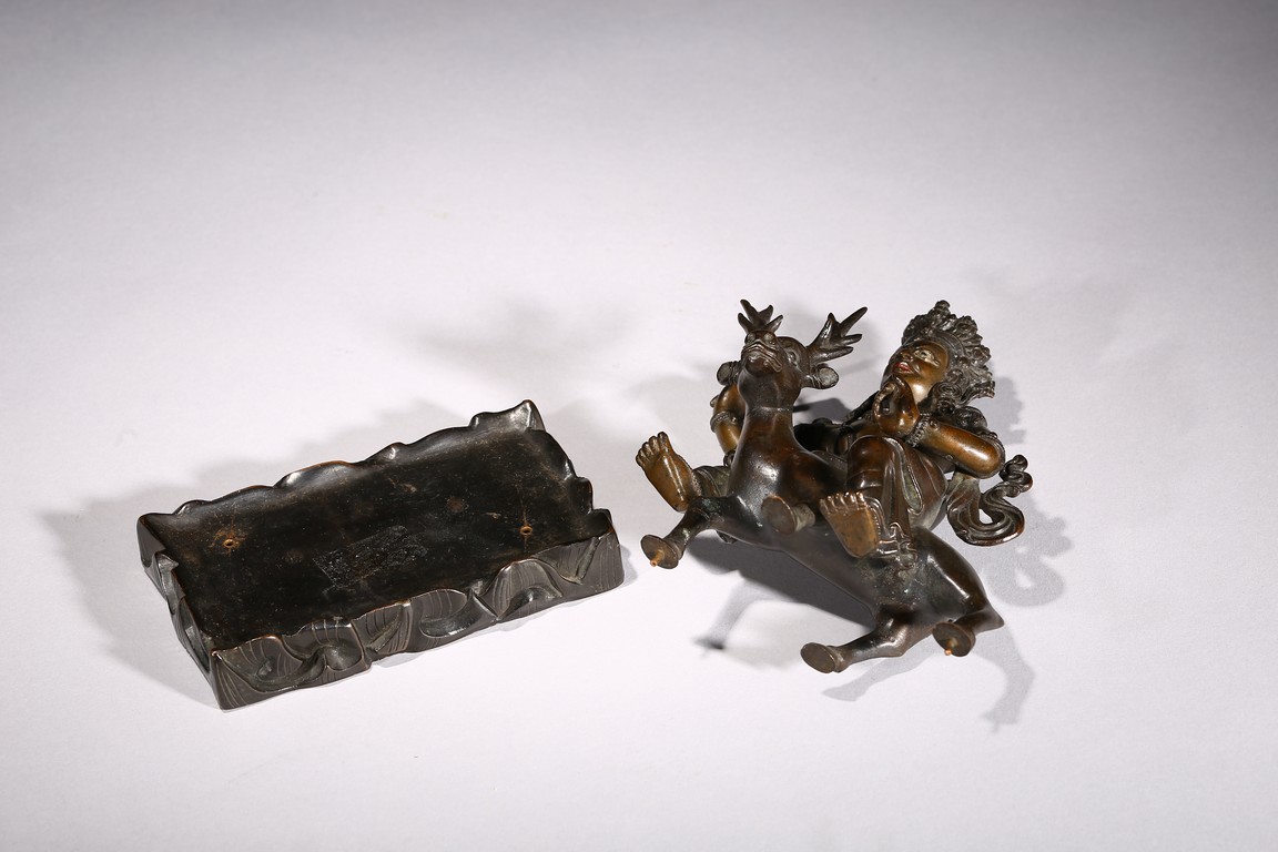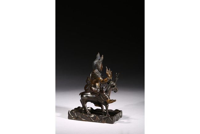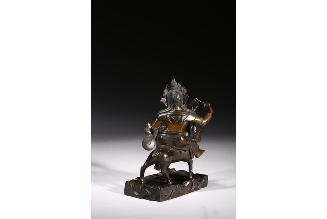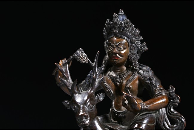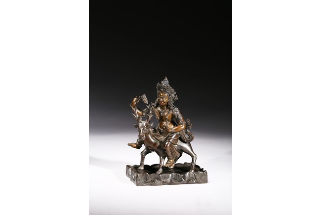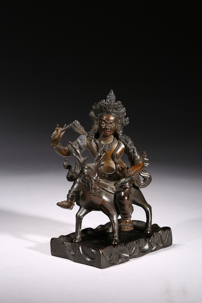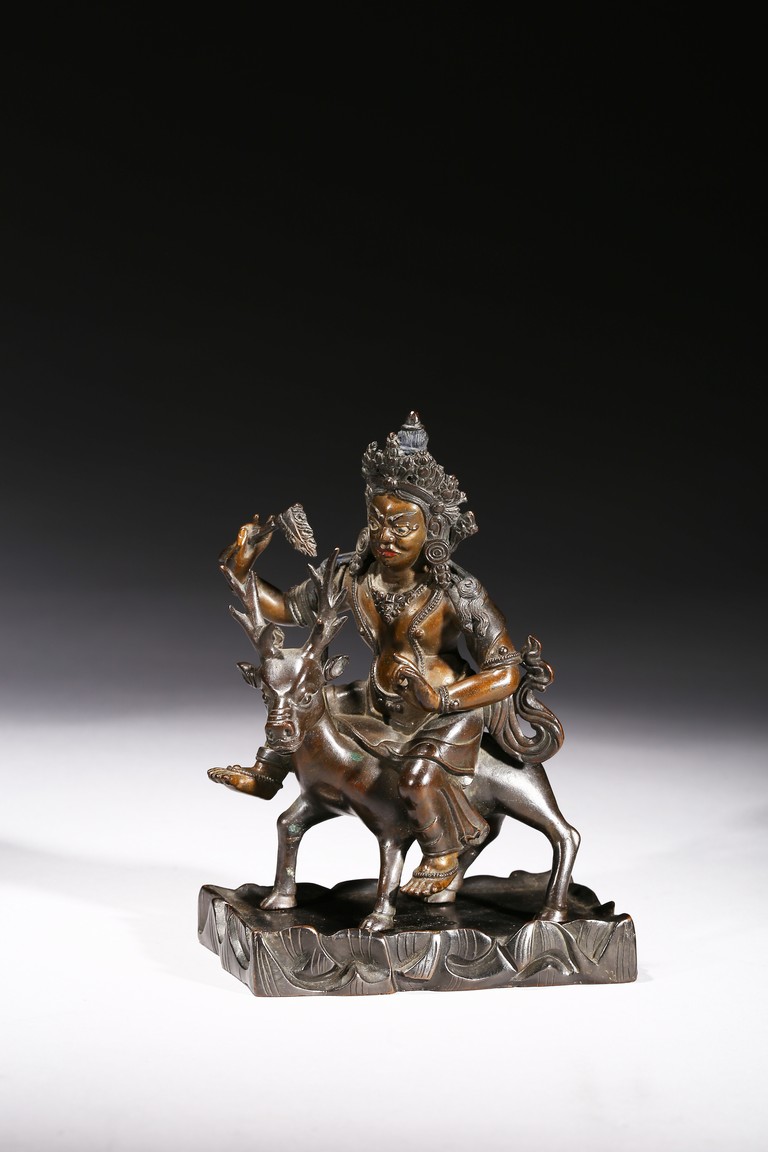 The guardian deity is shown seated upon a deer,both of hands holding an attribute,dressed in dhoti with flowing ribbons across arms,adorned with beaded necklace and face with stern expression,wearing pointed crown,and hair tied into high chignon. Qing Dynasty period.