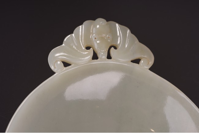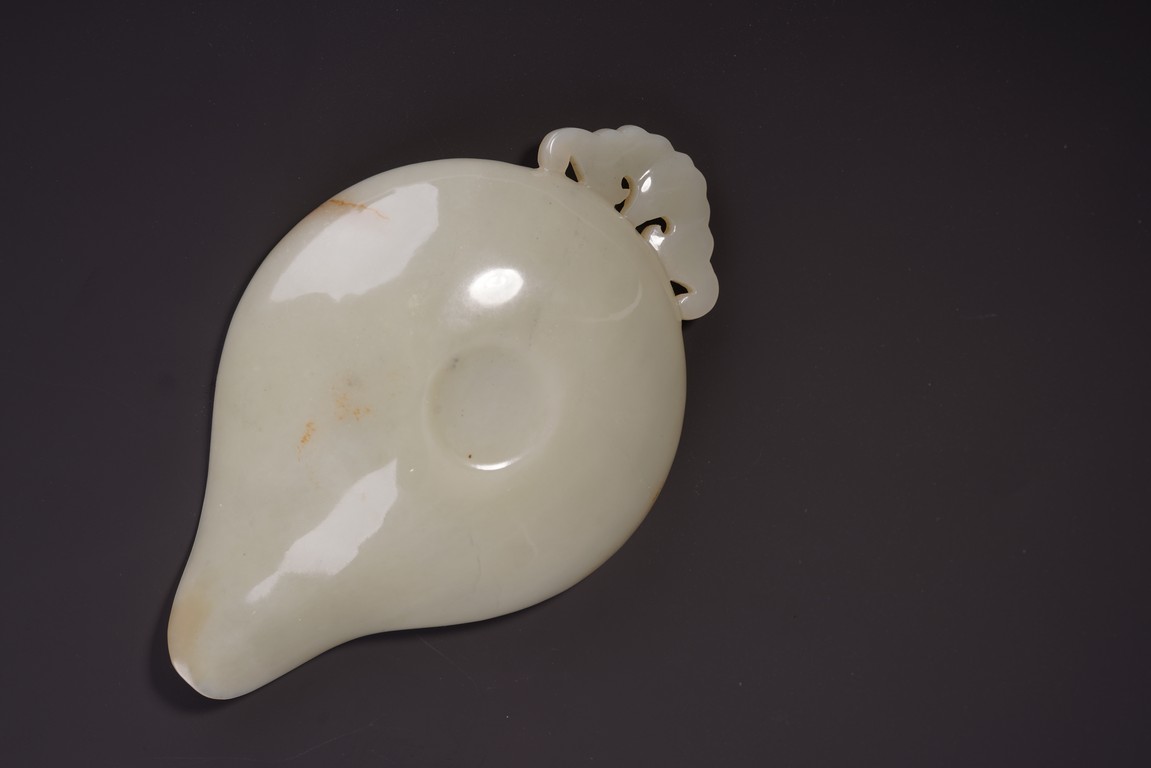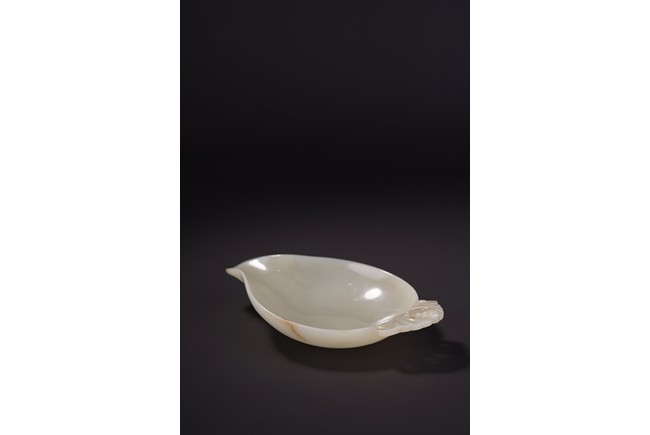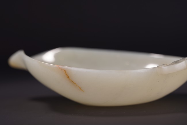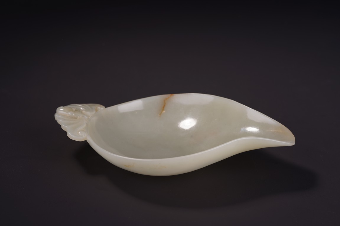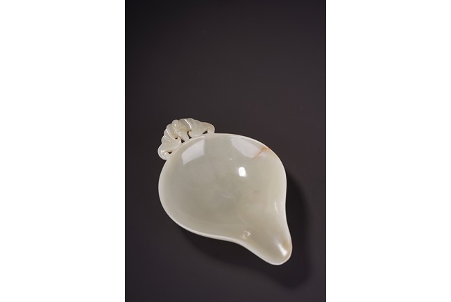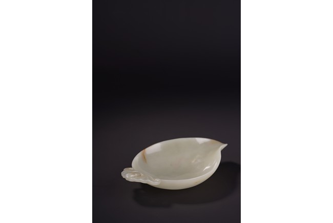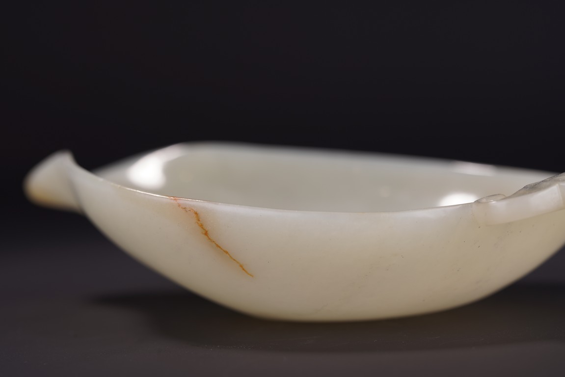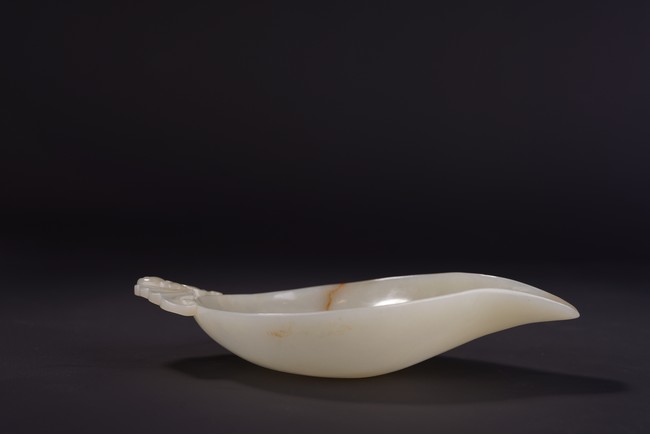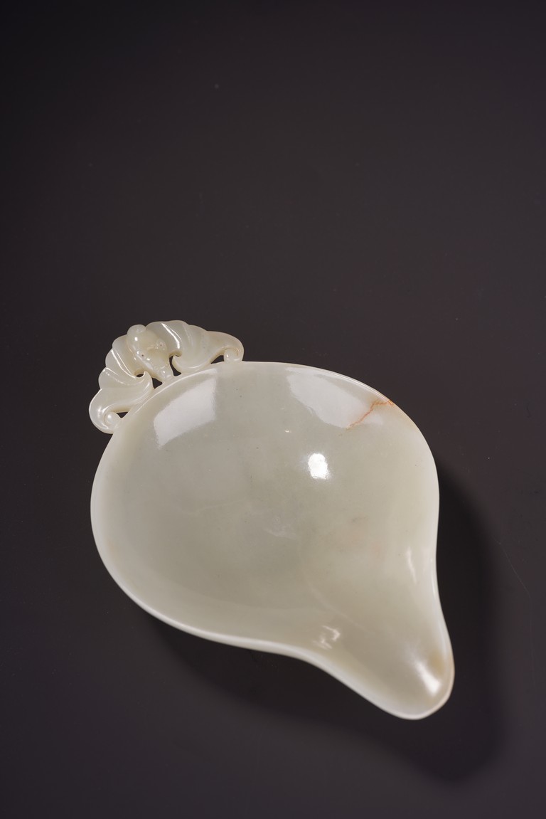 Qing Dynasty period. Modelled in the form of shallow peach form, with one side pointed outward as spout, the other one side carved with a stylized bat as handle. The stone is of translucent polished white tone with russet vein.