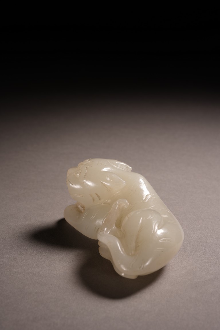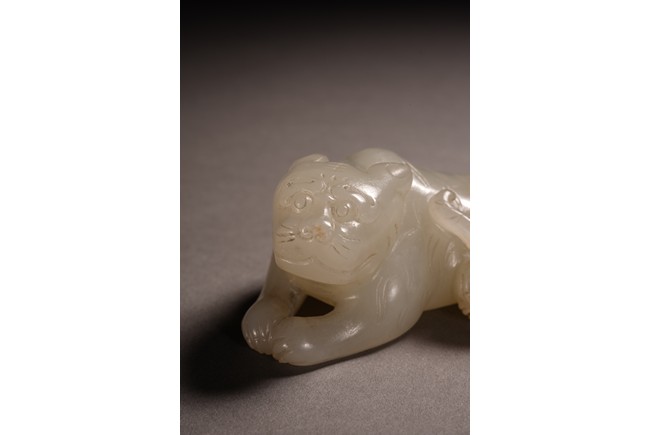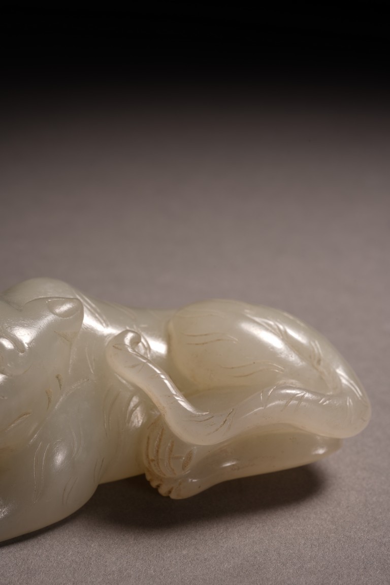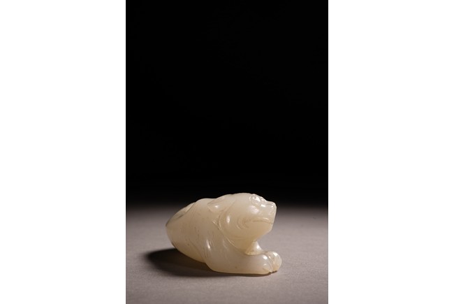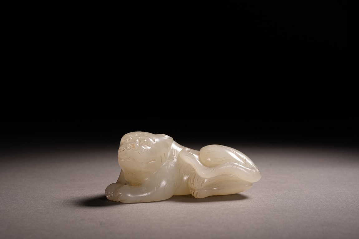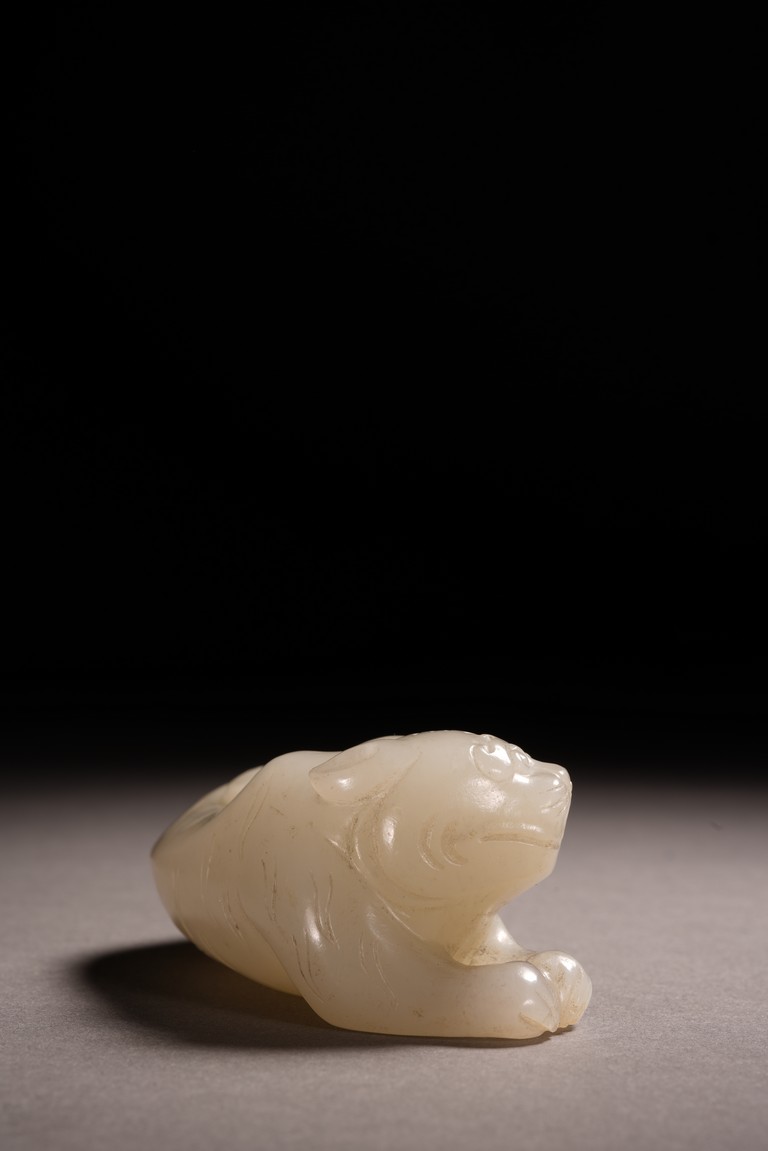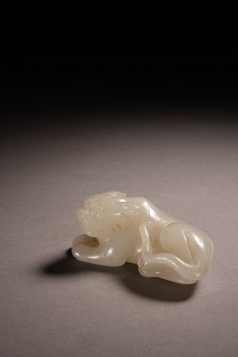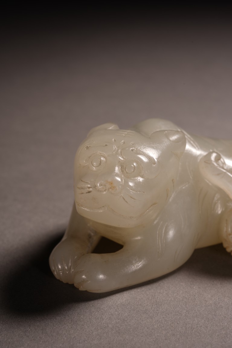 Qing Dynasty period. The recumbent tiger with body slightly slumped aside, the tail swished over its left haunch and spine, the head detailed with a wide grin, whiskers, and rounded eyes, the stone is of polished and translucent white tone.