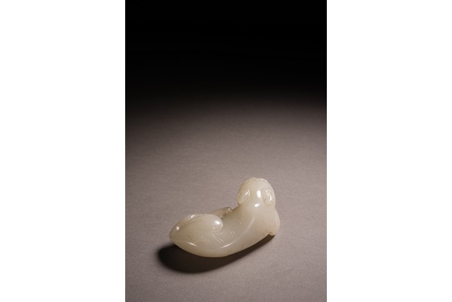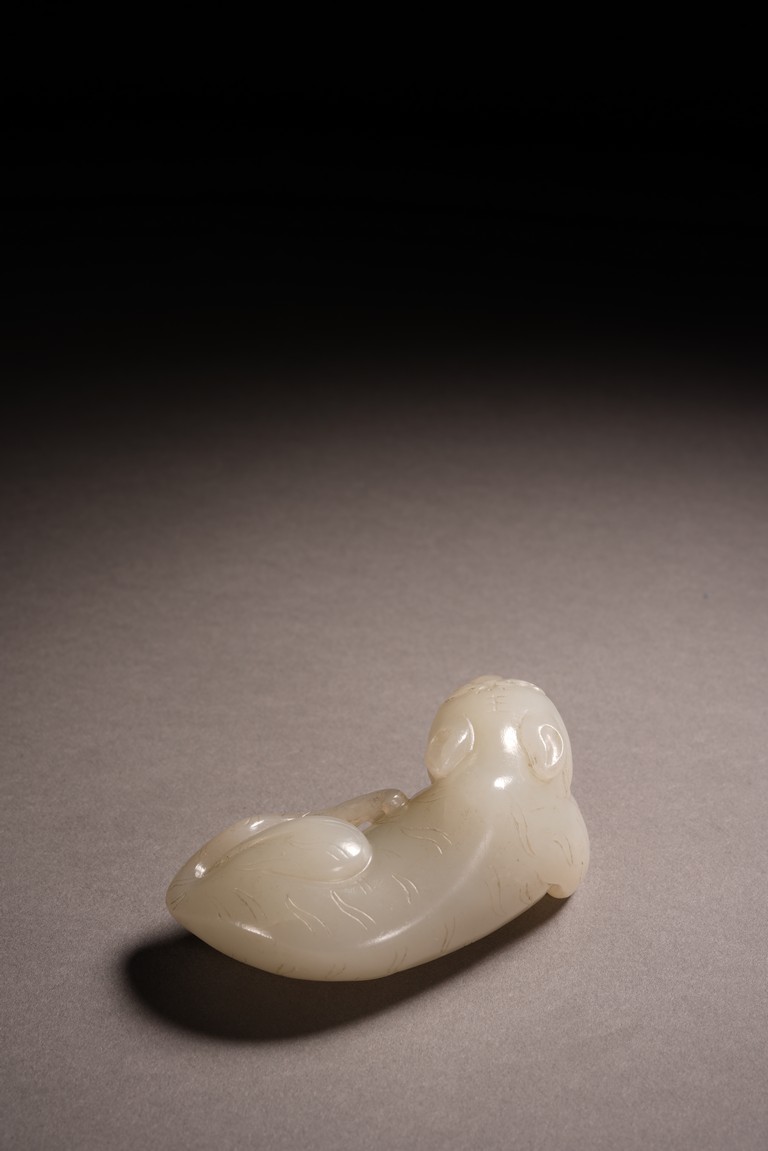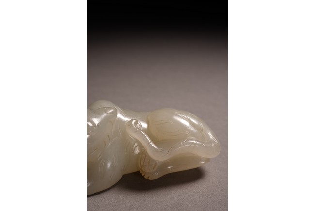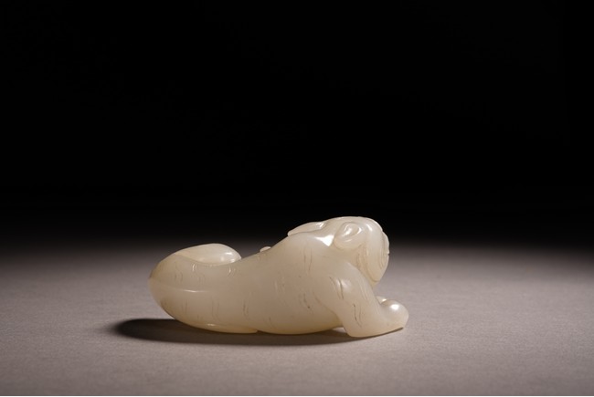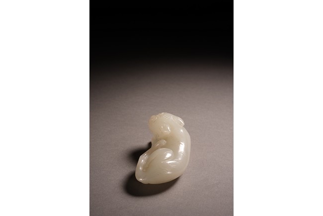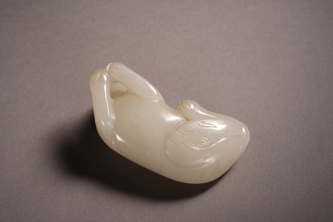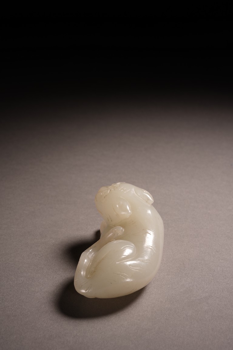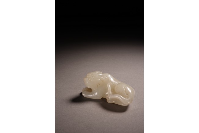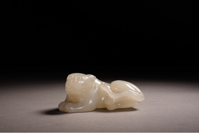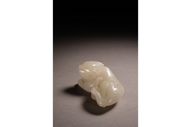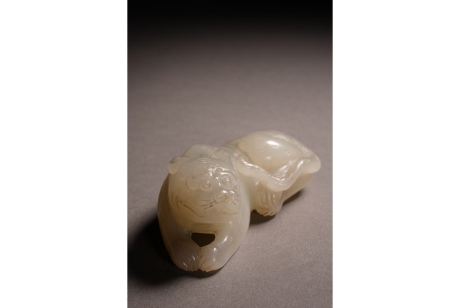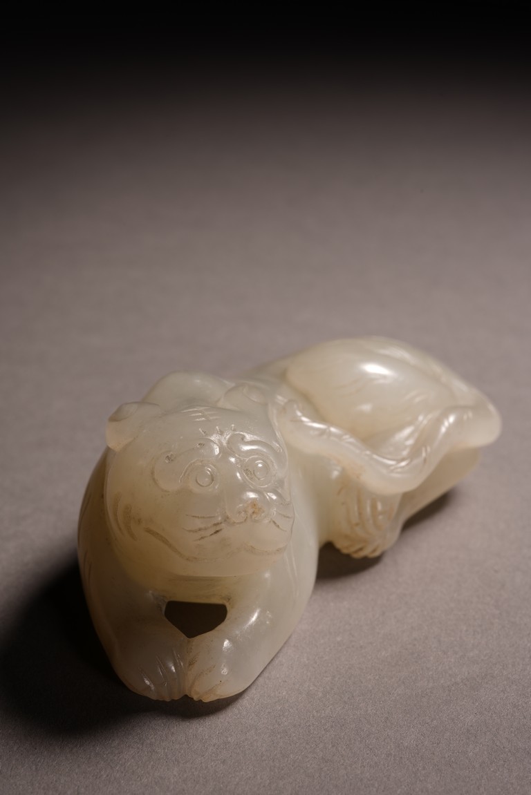 Qing Dynasty period. The recumbent tiger with body slightly slumped aside, the tail swished over its left haunch and spine, the head detailed with a wide grin, whiskers, and rounded eyes, the stone is of polished and translucent white tone.