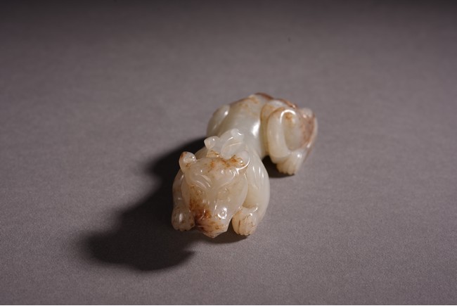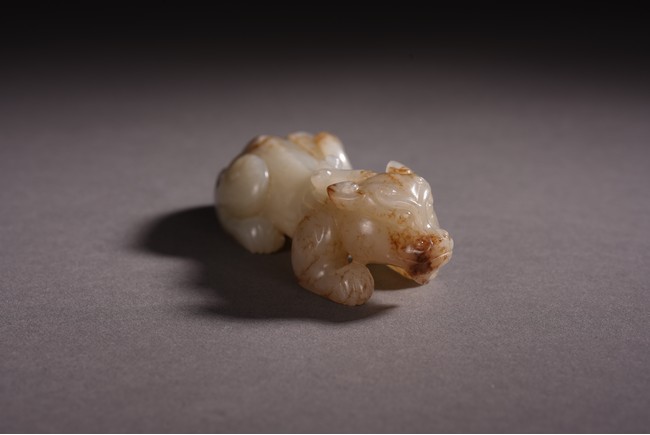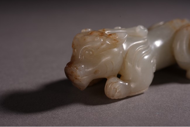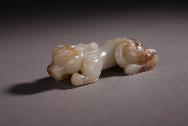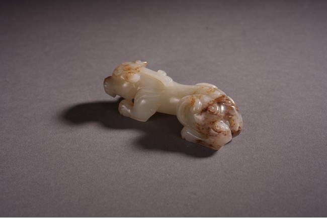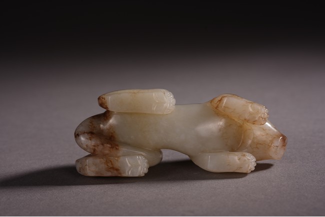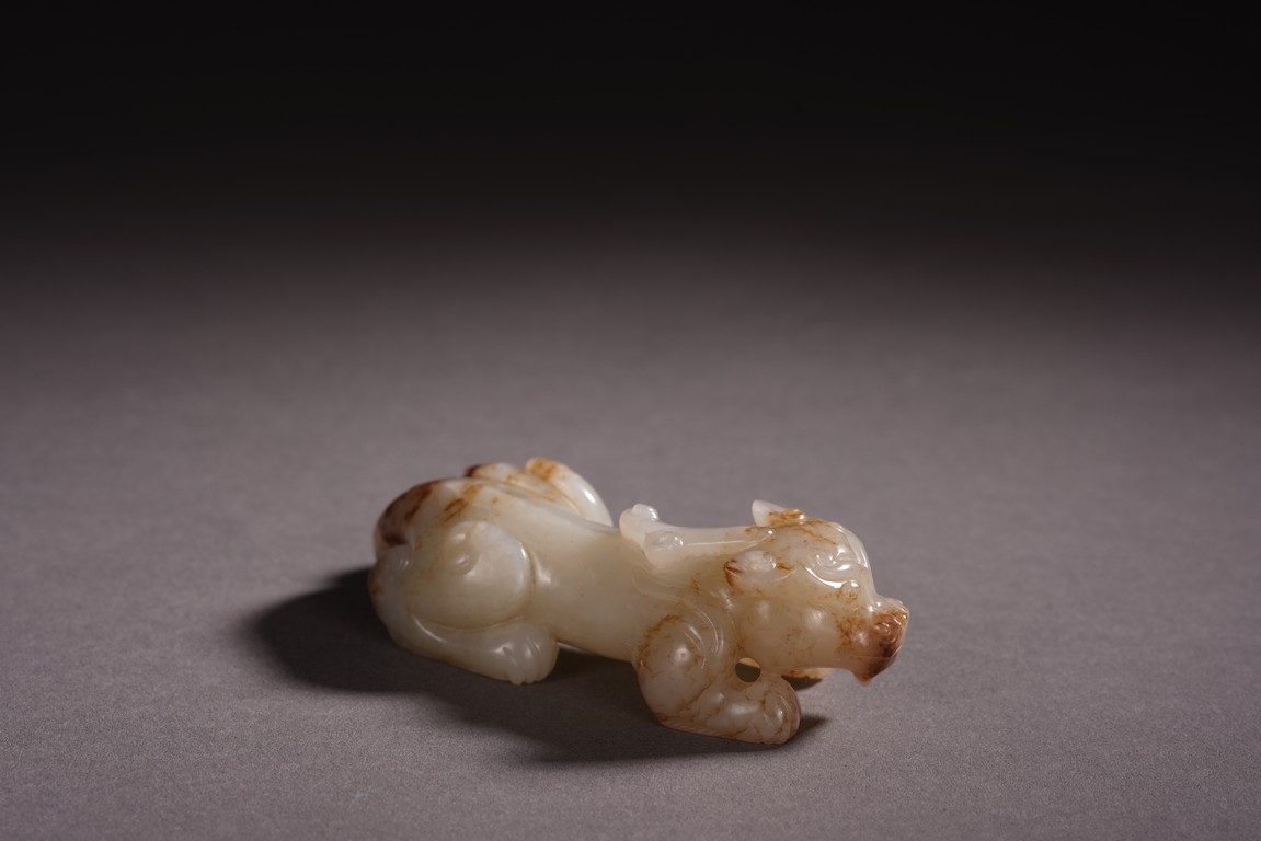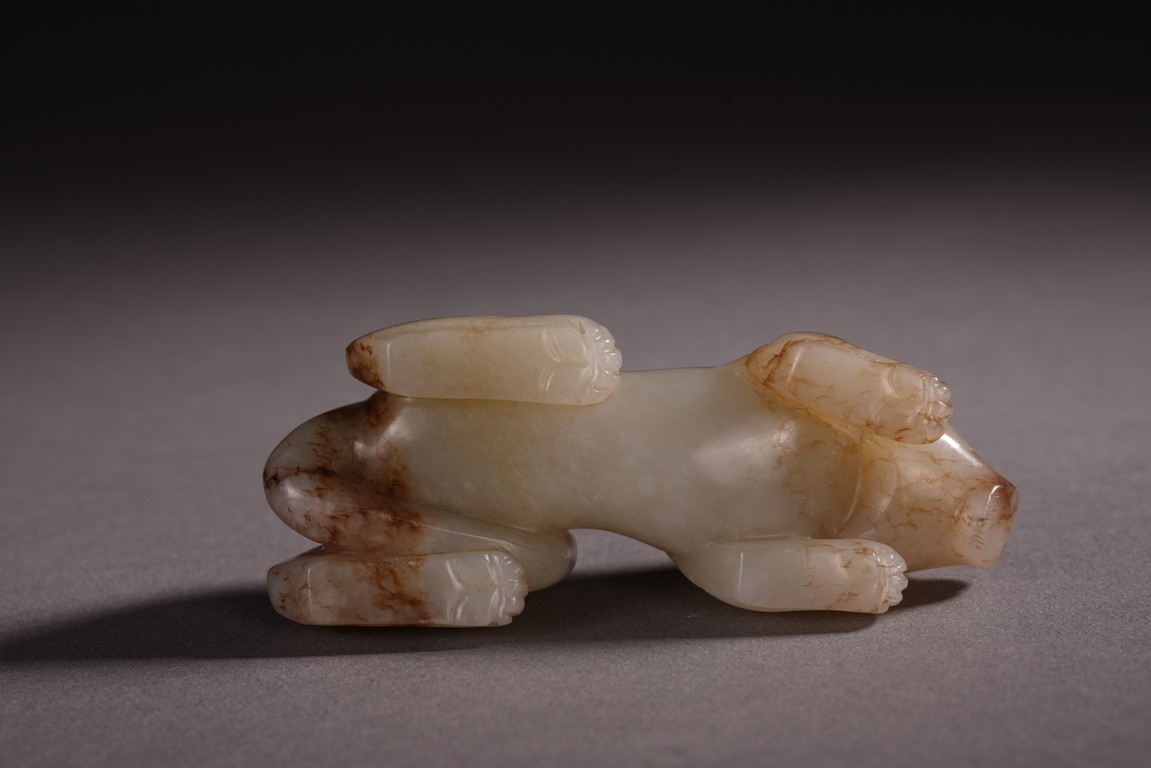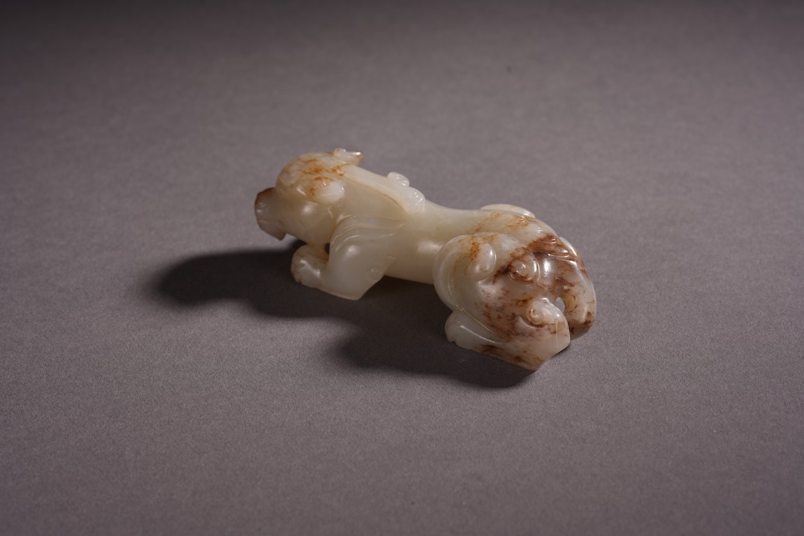 Qing Dynasty period. The recumbent beast portrayed with a broad snout, bulging eyes, and wide chin, both forelegs with wings, the tail swept over its left haunch, the stone is of white tone with russet inclusions.