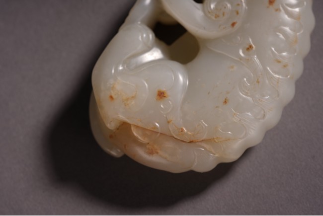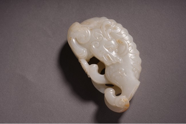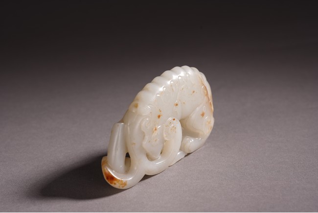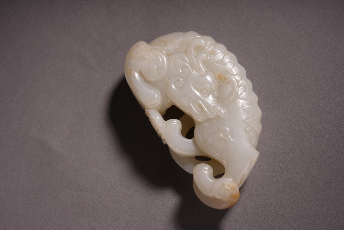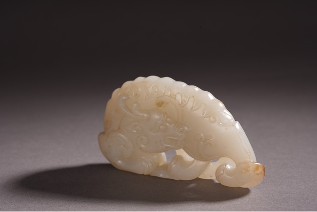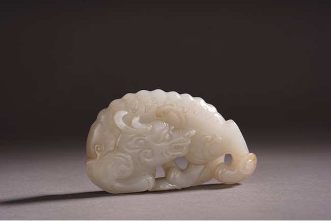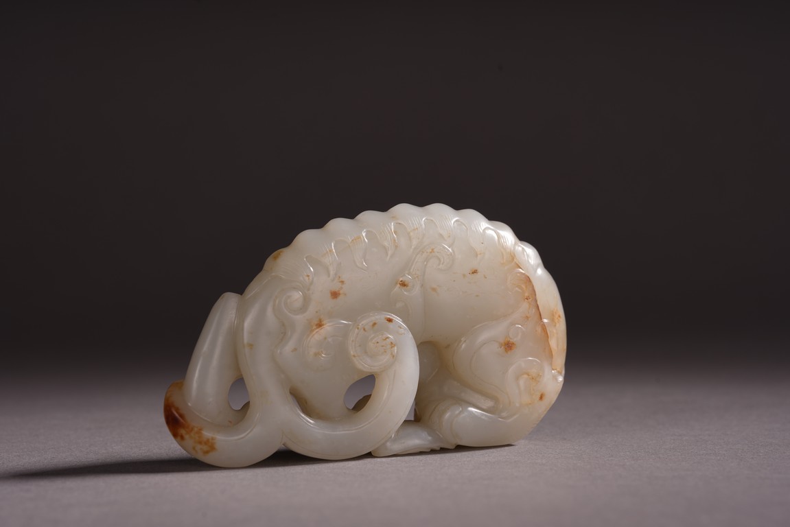 Qing Dynasty period. Carved in the form of a qilin with head turning back, detailed with wide nostrils, mouth agape revealing fangs, and protruding eyes, and two upright horns, the spine with incised mane.