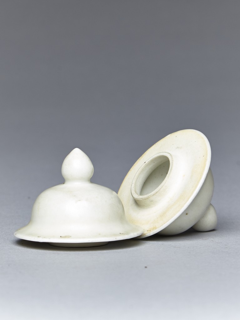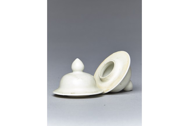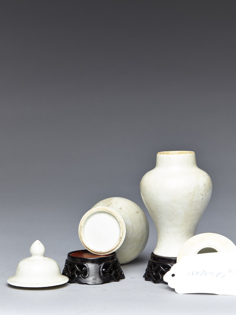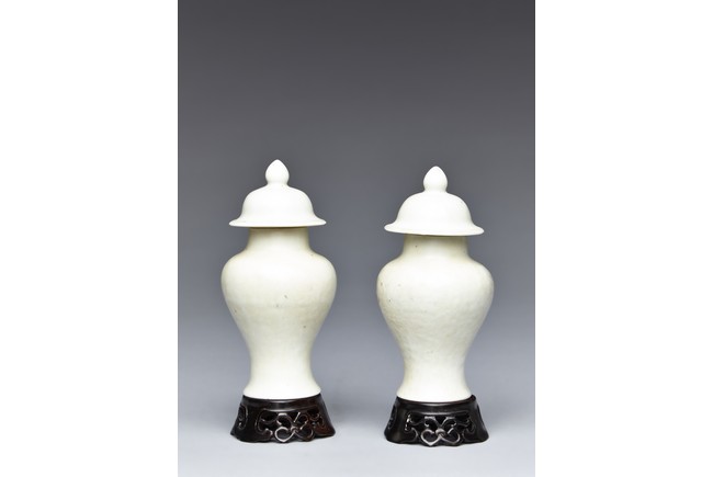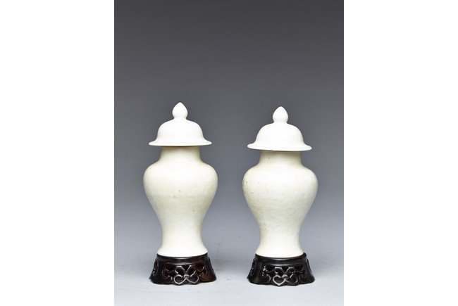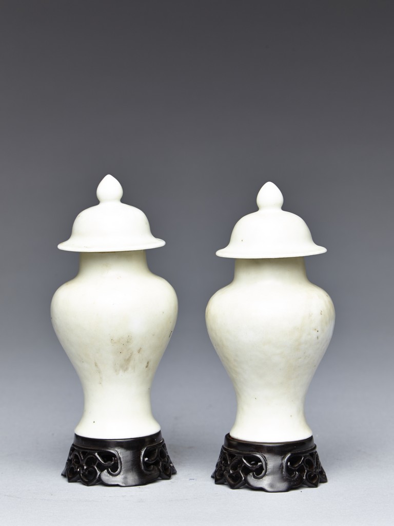 Ming Dynasty period. Each vase is of baluster from, the exterior evenly applied with white glaze. The cover is surmounted with an bud finial. Each supported on reticulated hardwood stand.