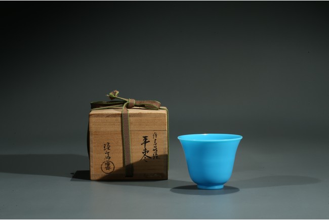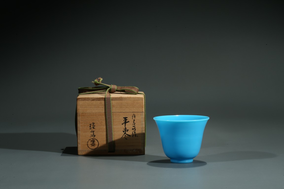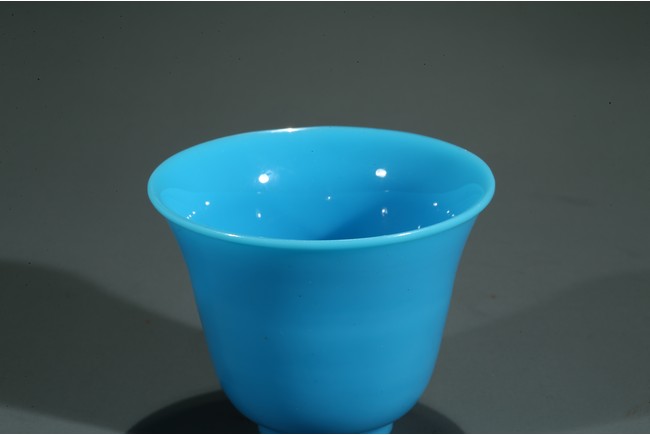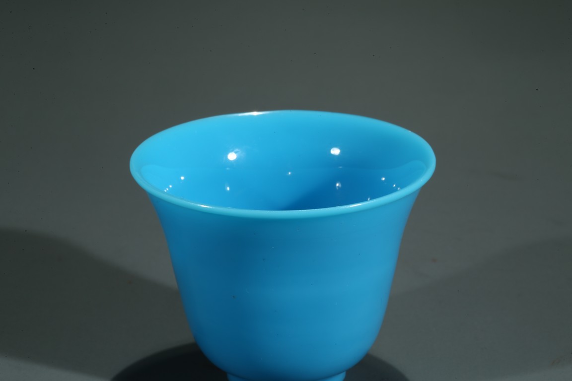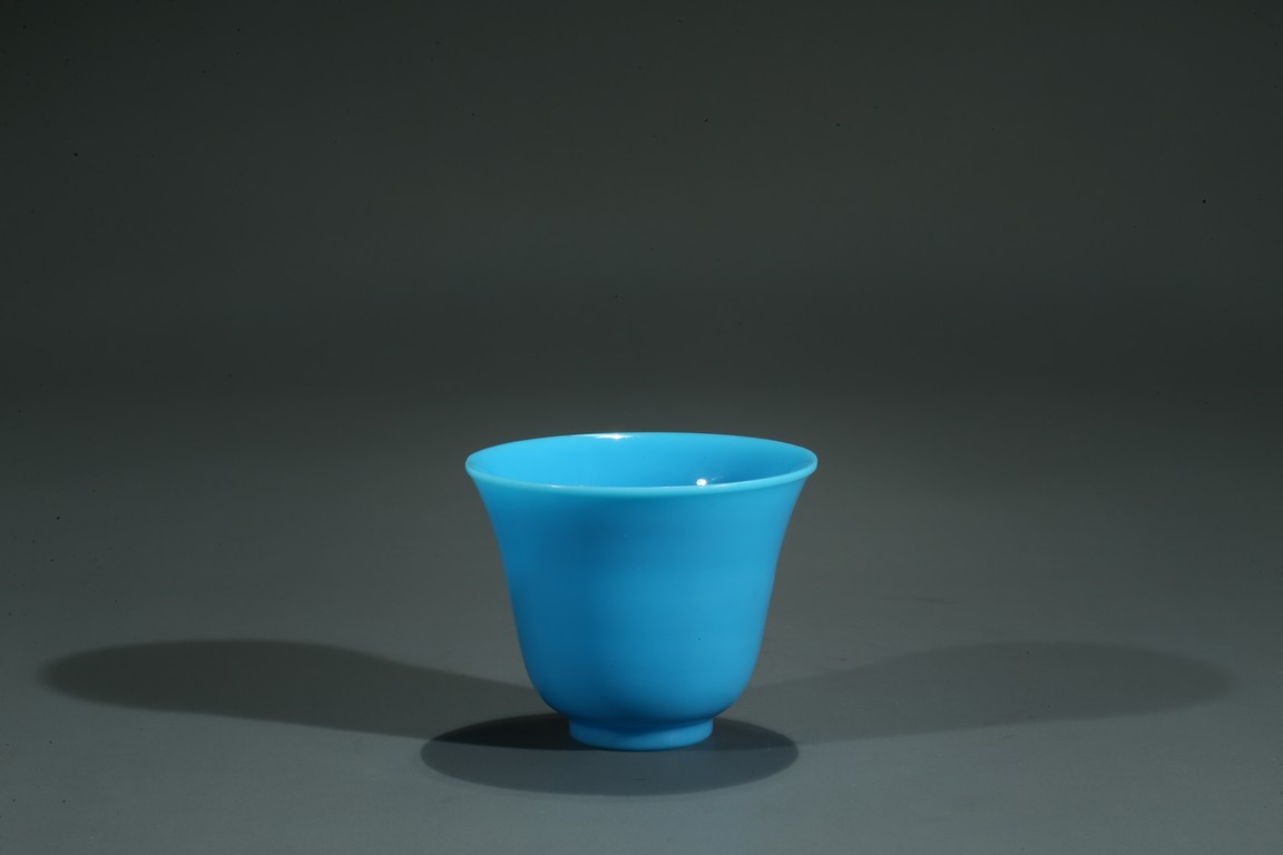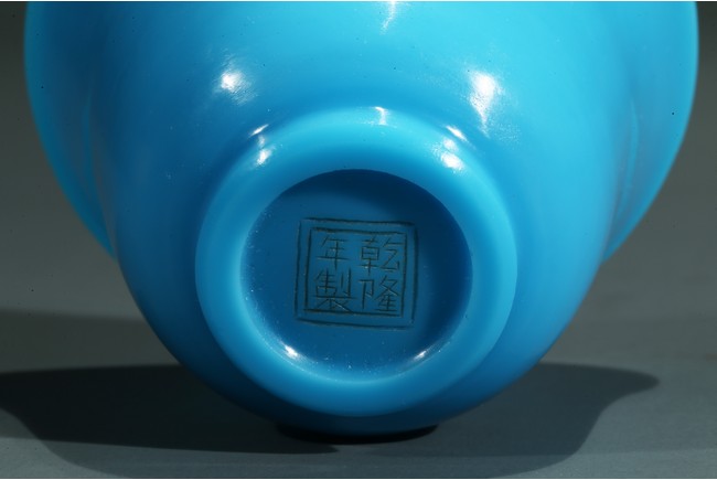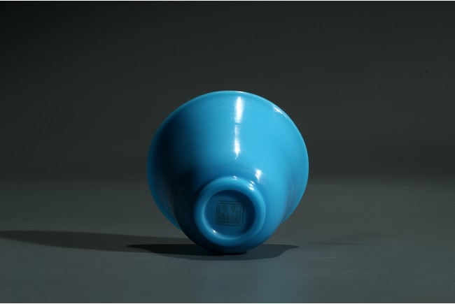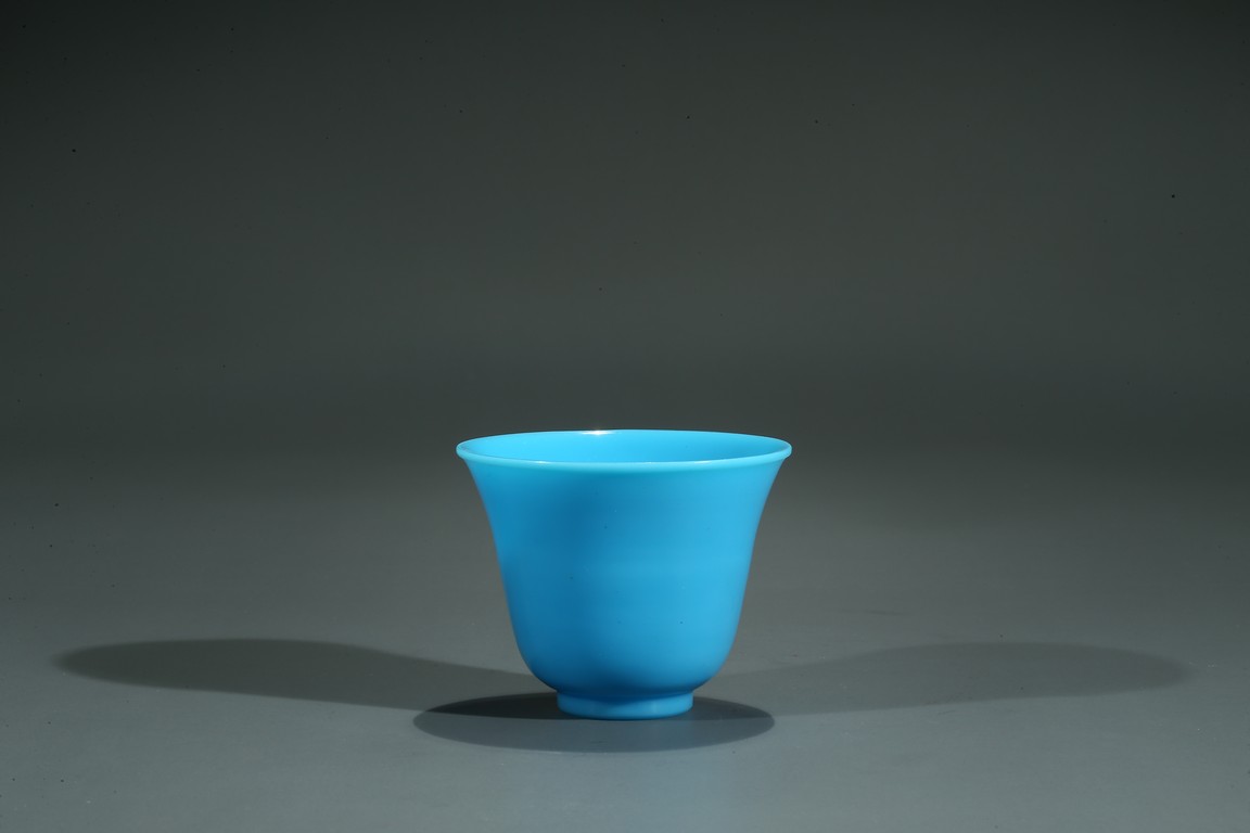 Of well potted deep U-shape, the glass is of translucent turquoise blue tone, the base with four character Qianlong mark, accompanied with a wood box.