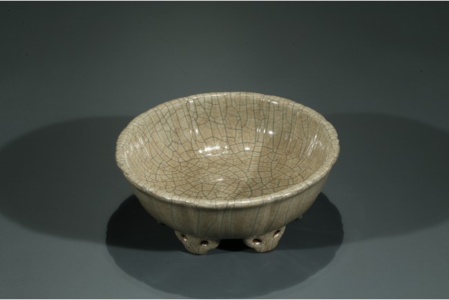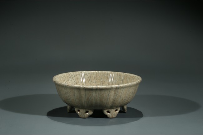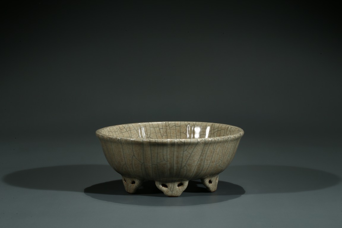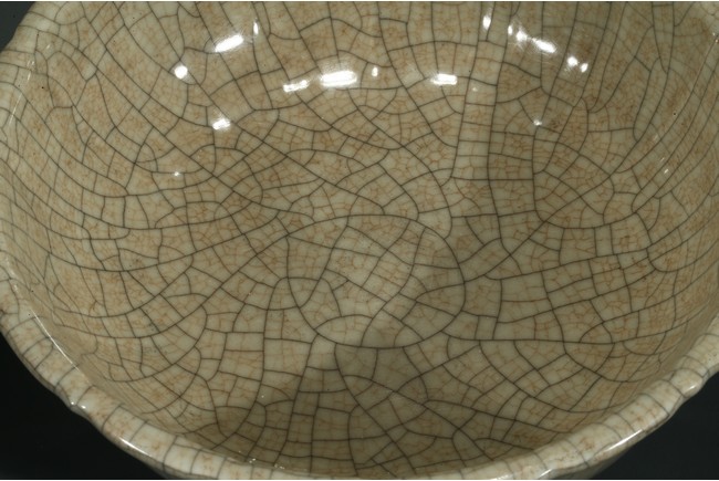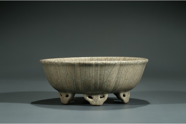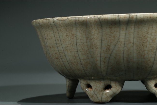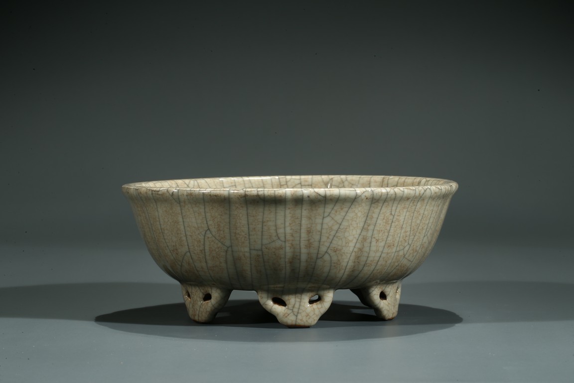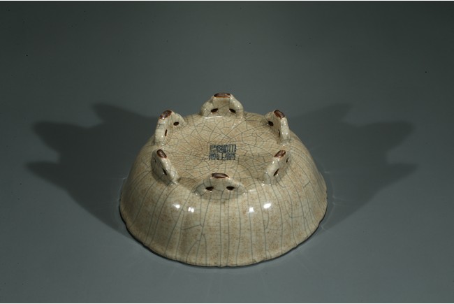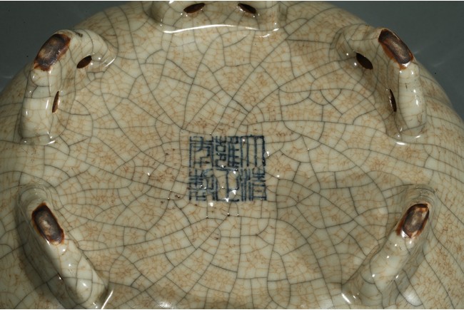 Supported on six short ruyi-shaped stubs, covered overall in a thick pale gray glaze suffused with charcoal-gray craquelure to the interior and base, the underside with six character Yongzheng mark.