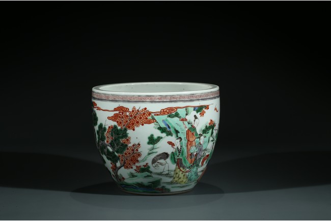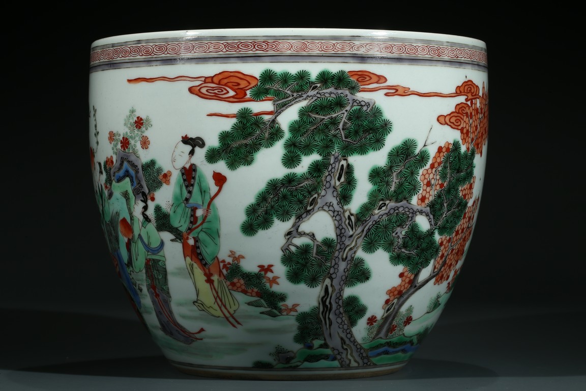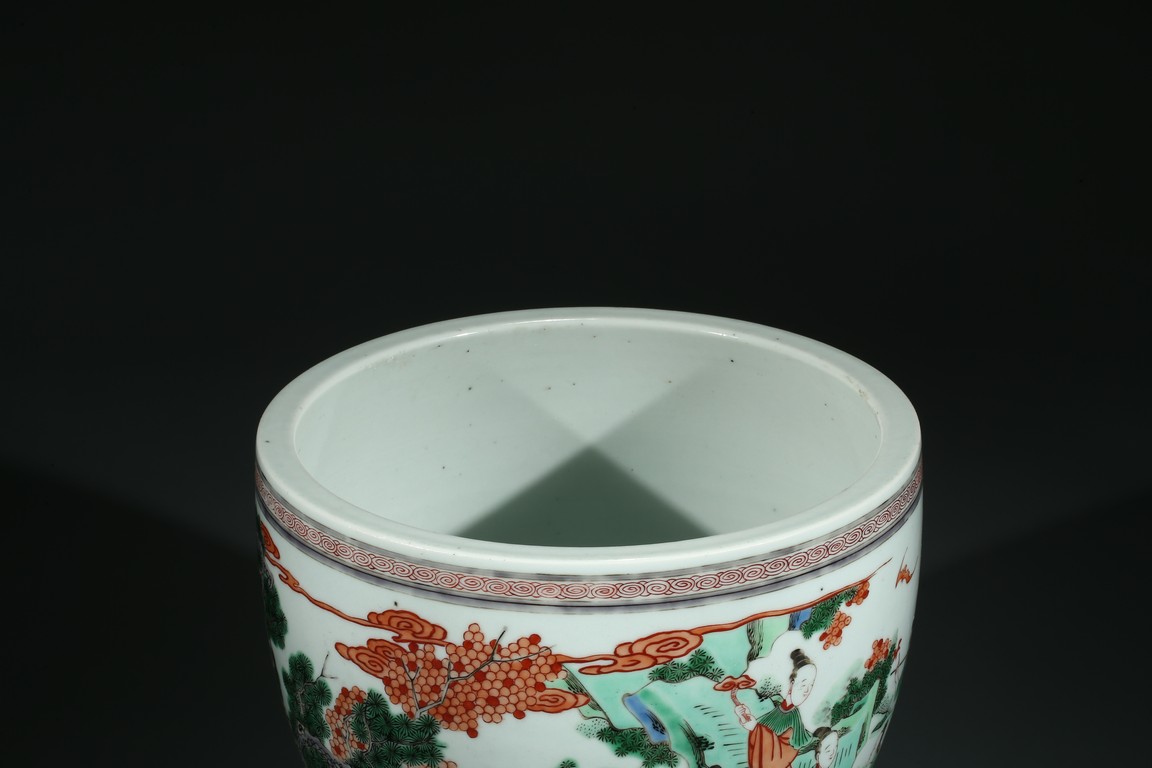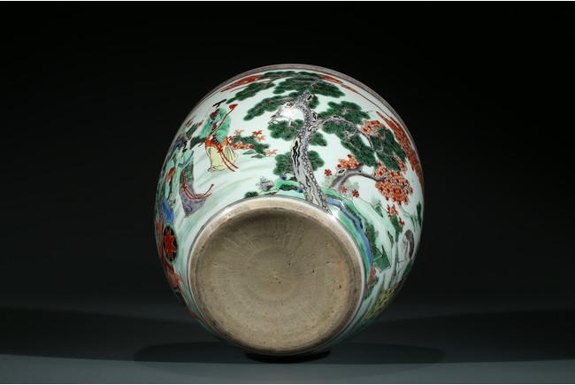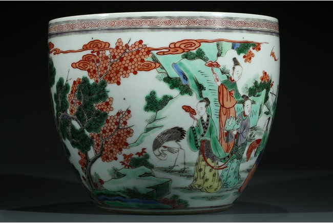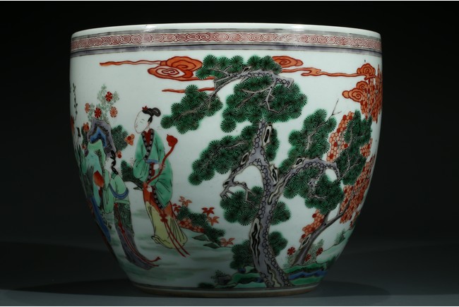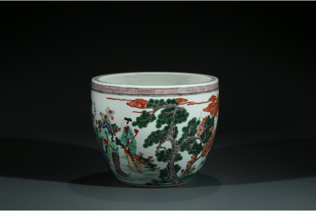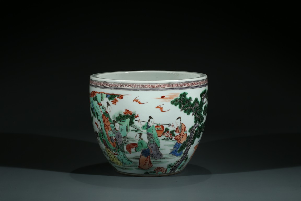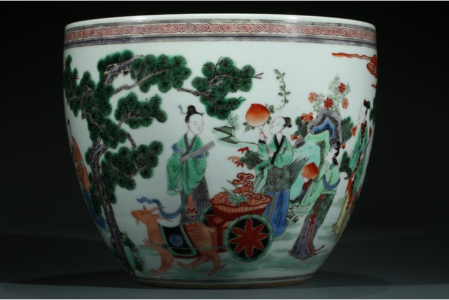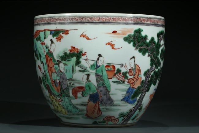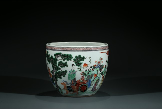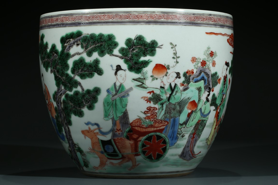 Qing Dynasty Kangxi period. The exterior body finely painted with a continuous scene depicting ladies gathering various rare herbs and fruits from the forests in celebration of the Birthday of Xiwangmu (Queen Mother of the West), framed by pine trees, clouds, and flying auspicious bats. The mouth rim decorated with a band of cloud pattern. The base left unglazed.