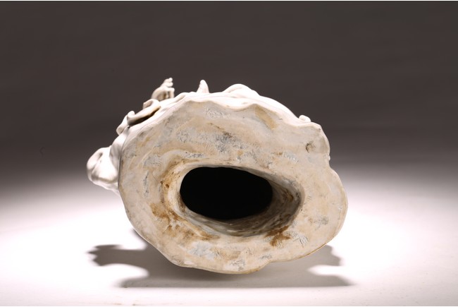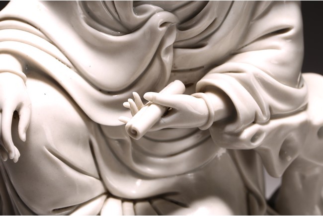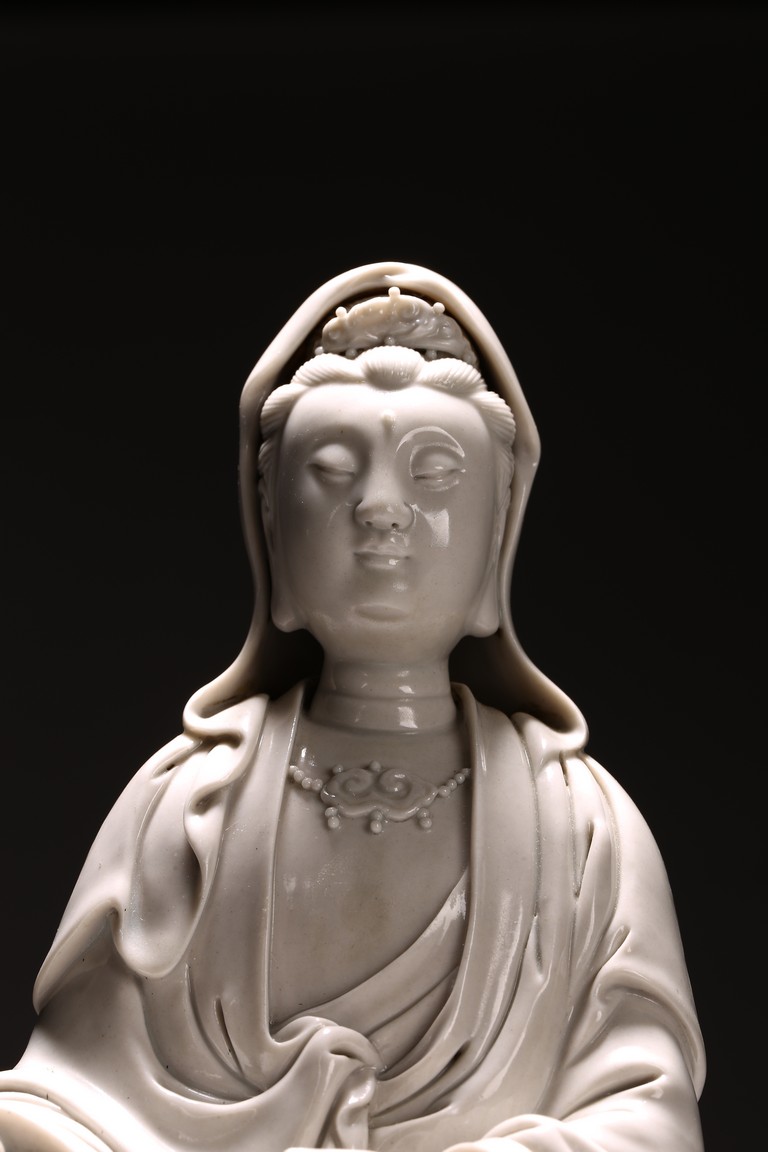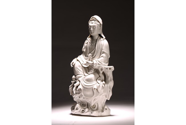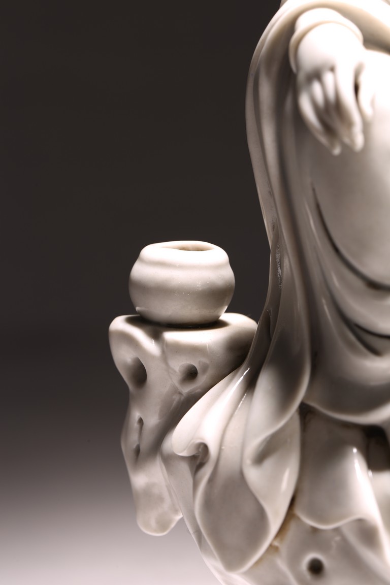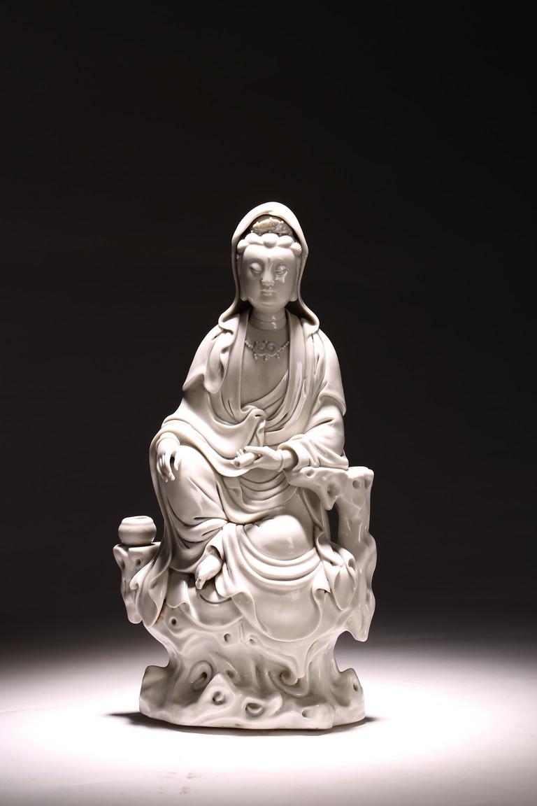 The female deity seated in 'Royal Ease' on a high rockwork pedestal base, wearing a long flowing hooded robe falling in deep U-shaped folds around her body and down over the rocks, to her right a bowl is supported on a rocky ledge, her reverse impressed with two seal marks. Qing Dynasty period.