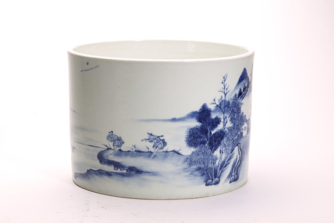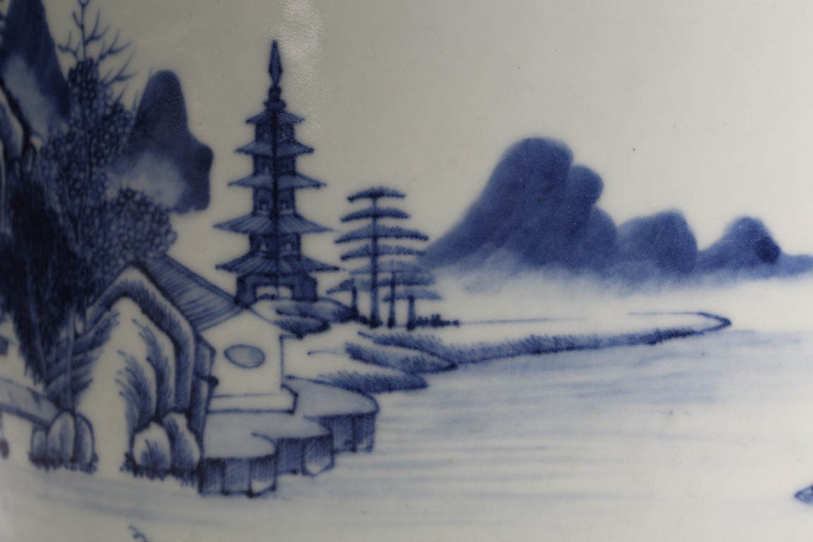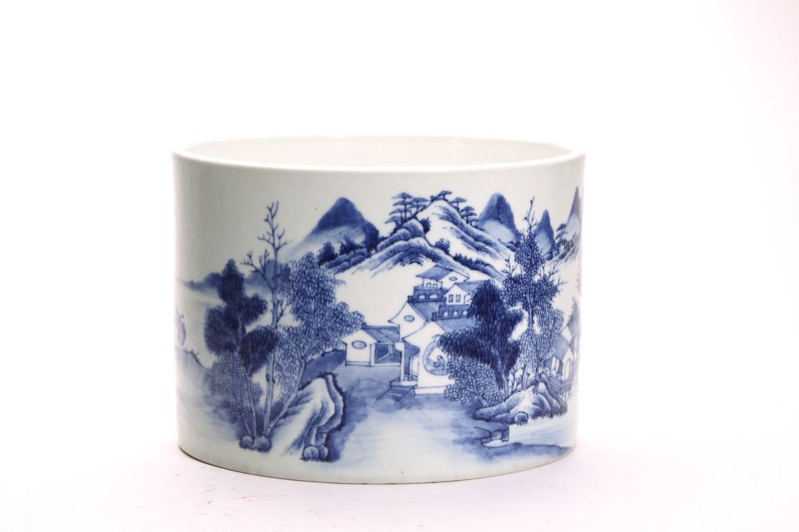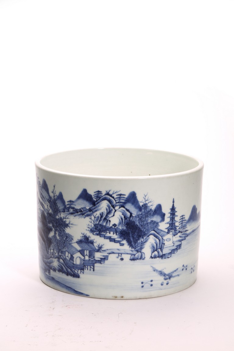Qing Dynasty period. Of short cylindrical form, the exterior finely painted in blue and white with a continuous landscape scene depicting figures on riverbank, with hills, mountains, trees, pagodas, pavillions, and retreats behind.