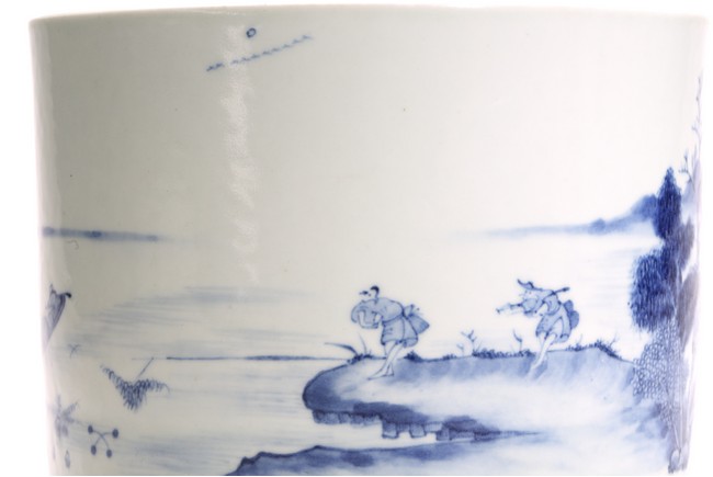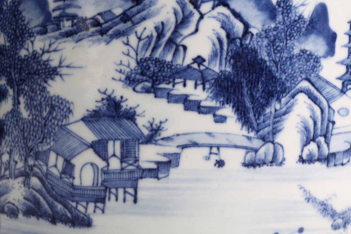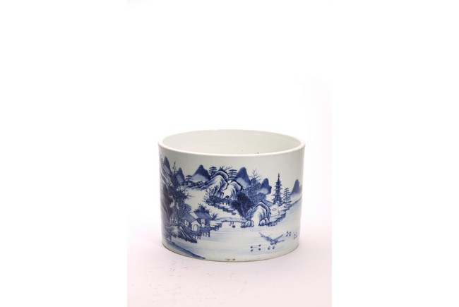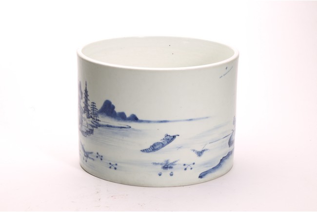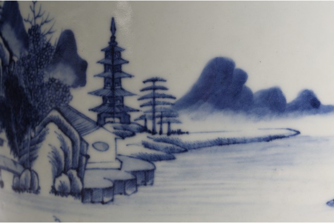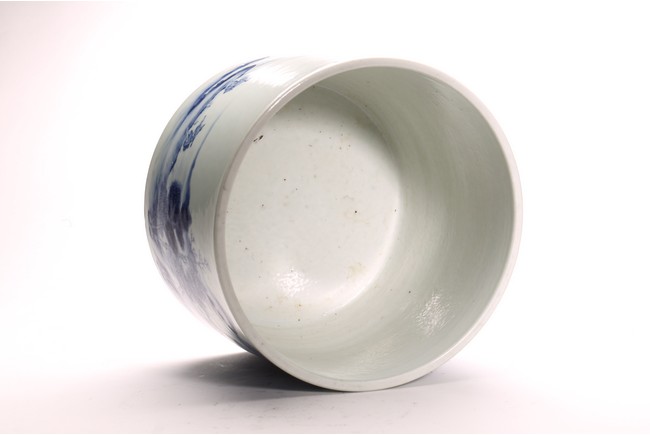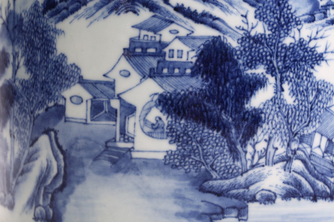 Qing Dynasty period. Of short cylindrical form, the exterior finely painted in blue and white with a continuous landscape scene depicting figures on riverbank, with hills, mountains, trees, pagodas, pavillions, and retreats behind.