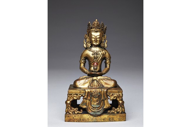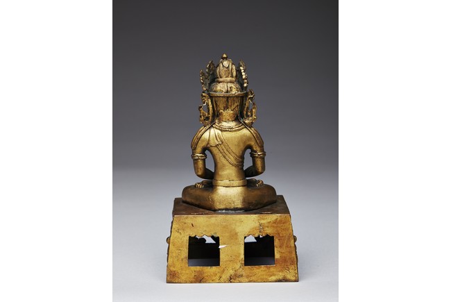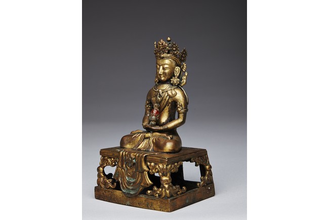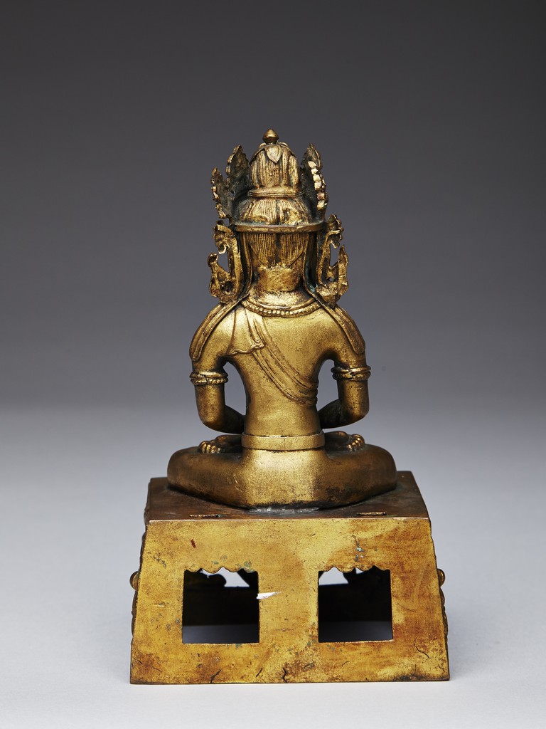 Shown seated in dhyanasana with the hands in dhyana mudra, wearing a dhoti tied over the left shoulder and adorned with beaded jewellery, the head crowned by pointed tiara, all supported on a tapering rectangular throne above the Qianlong reign mark.