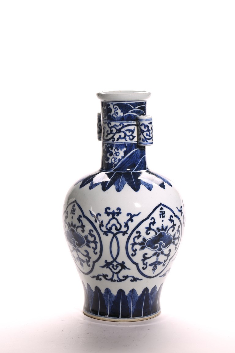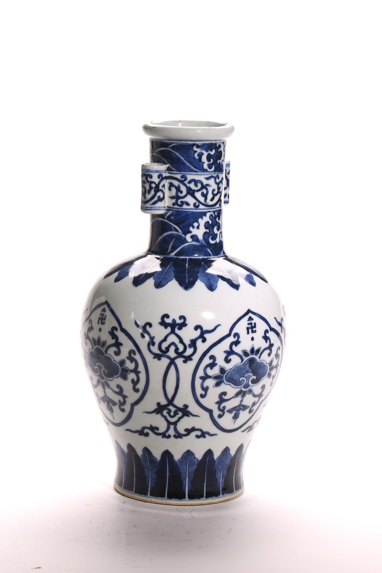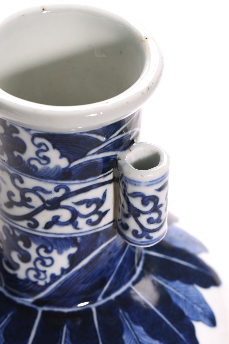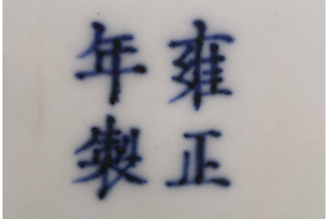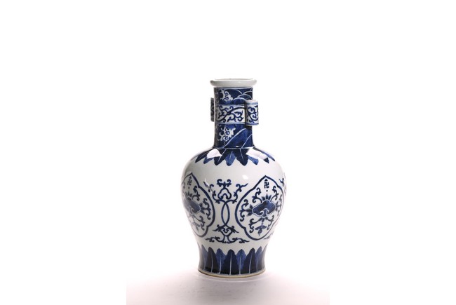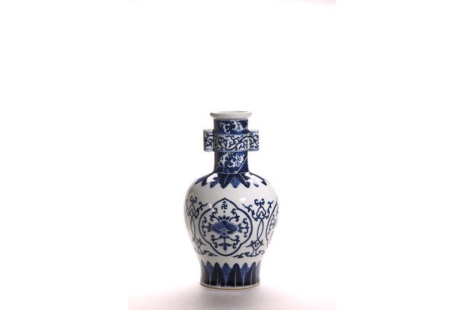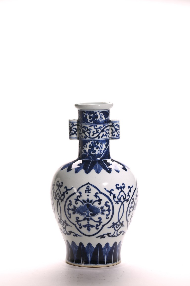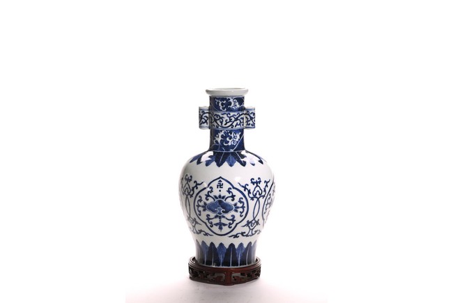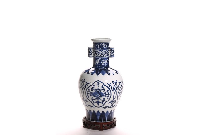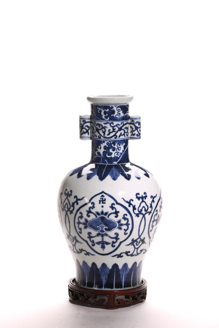 Qing Dynasty period. The rounded body decorated with stylized foliate decorations and cylindrical neck flanked by a pair of tubular handles. Base inscribed with four character Yongzheng mark. With hardwood stand.