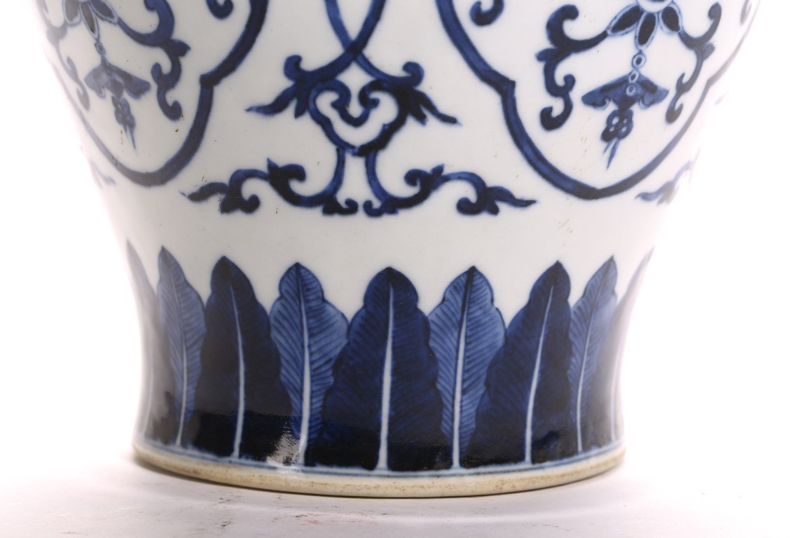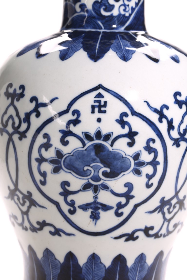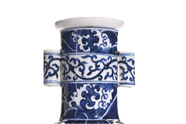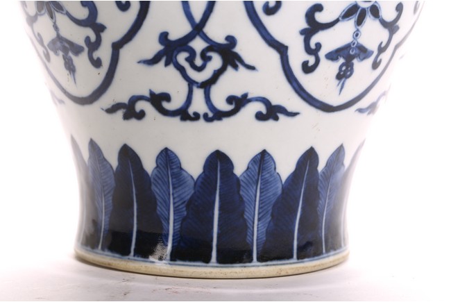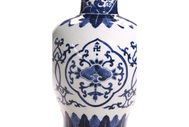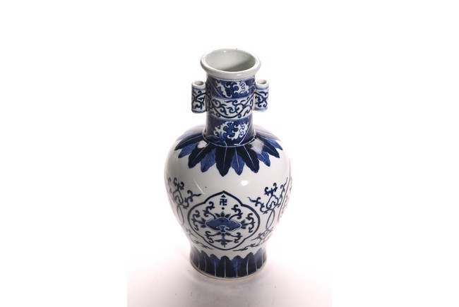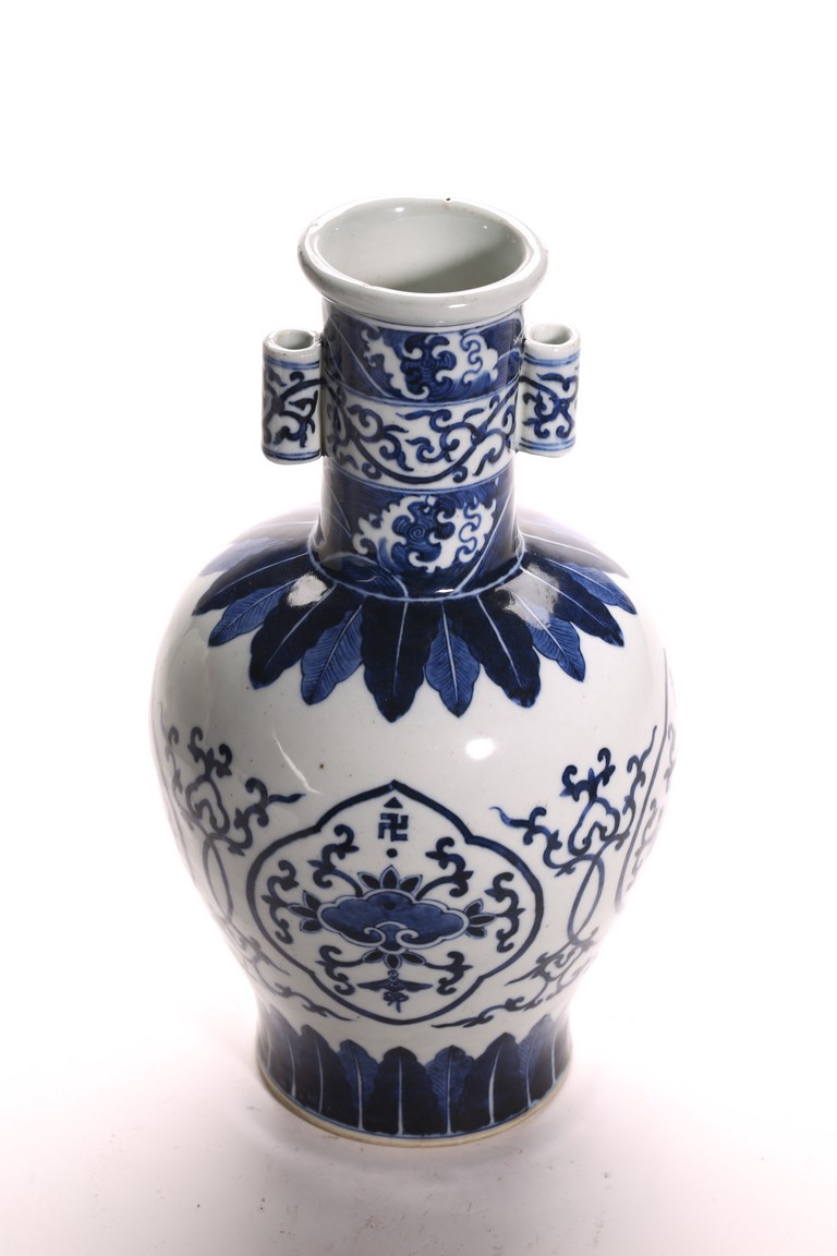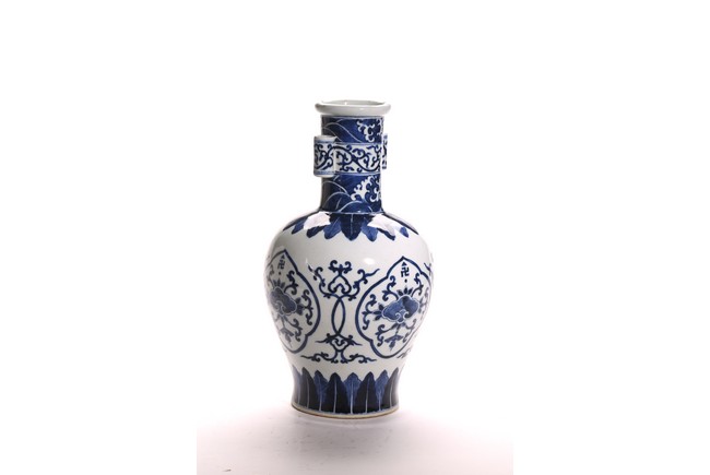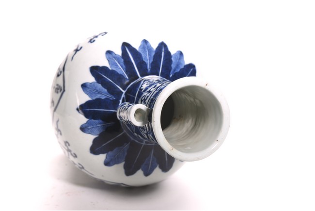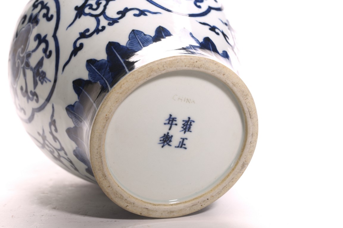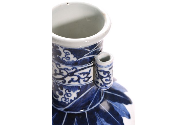 Qing Dynasty period. The rounded body decorated with stylized foliate decorations and cylindrical neck flanked by a pair of tubular handles. Base inscribed with four character Yongzheng mark. With hardwood stand.
