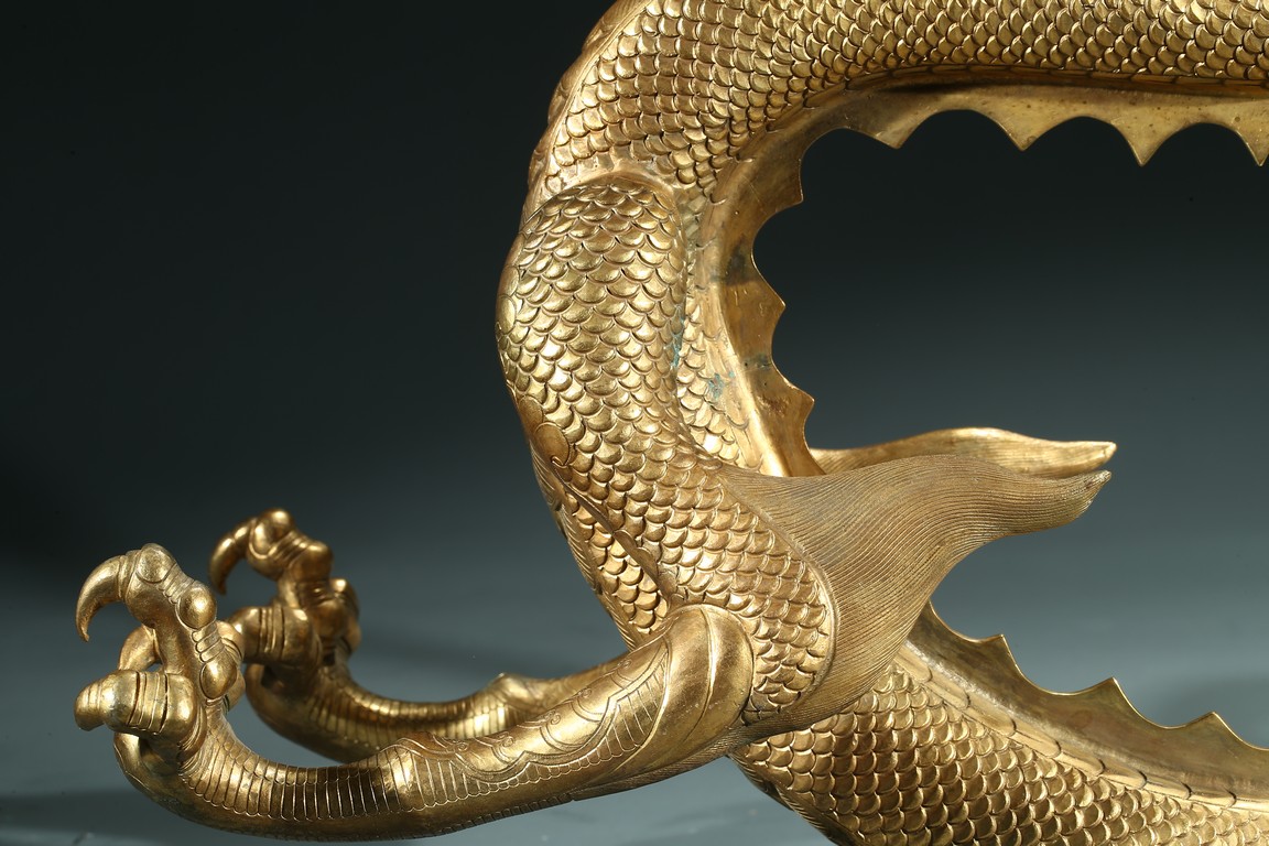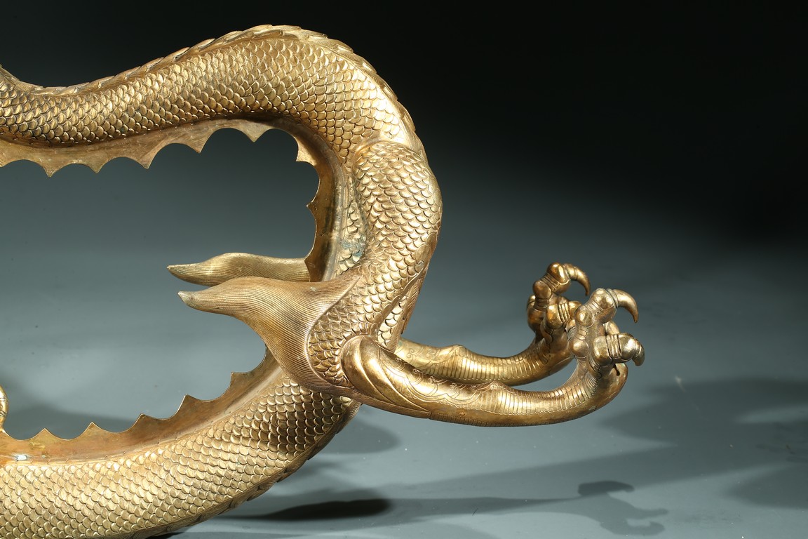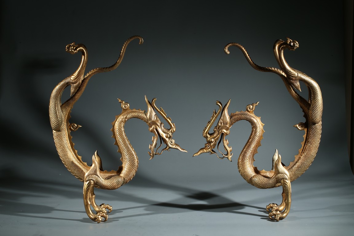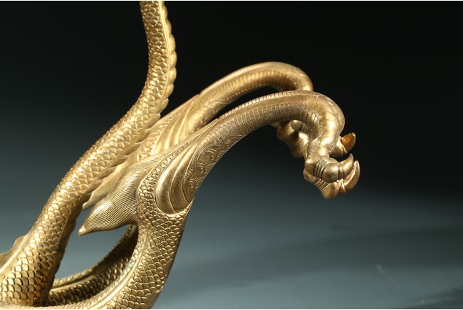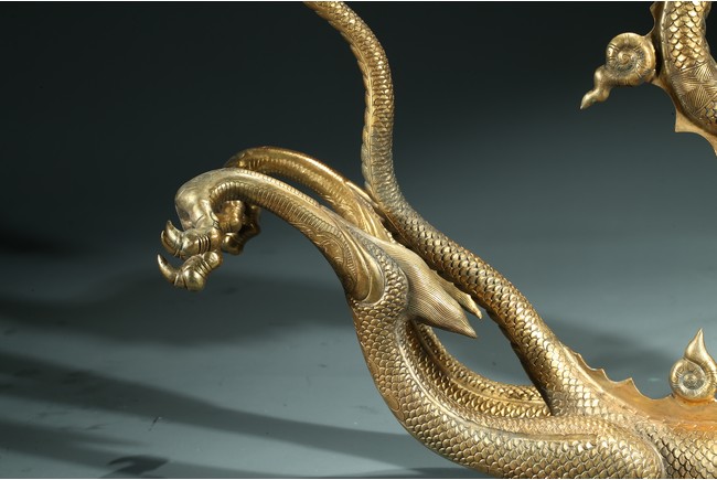 Each cast standing on its front legs while forcefully flinging the back legs up into the air, the open mouth also pierced to show the fangs and tongue, body detailed with scales.