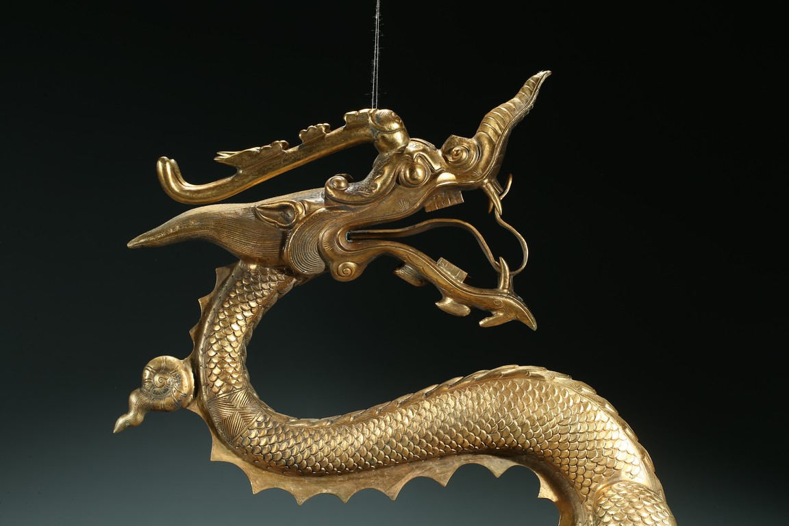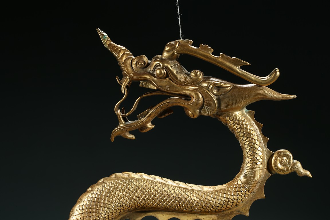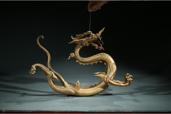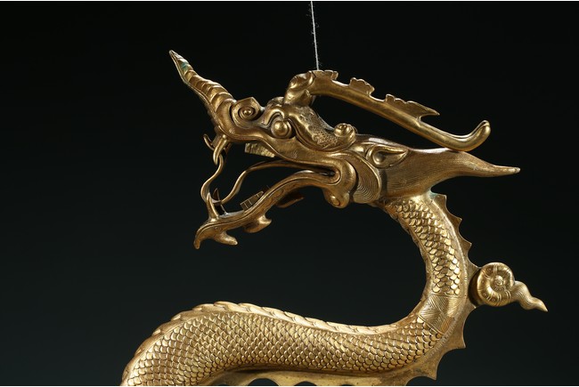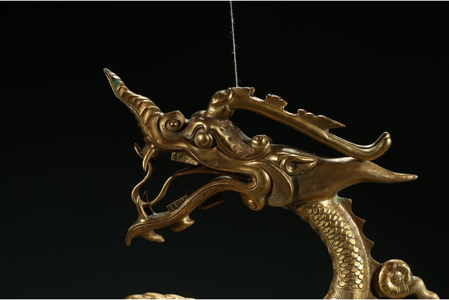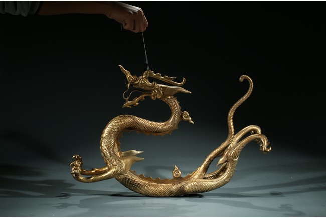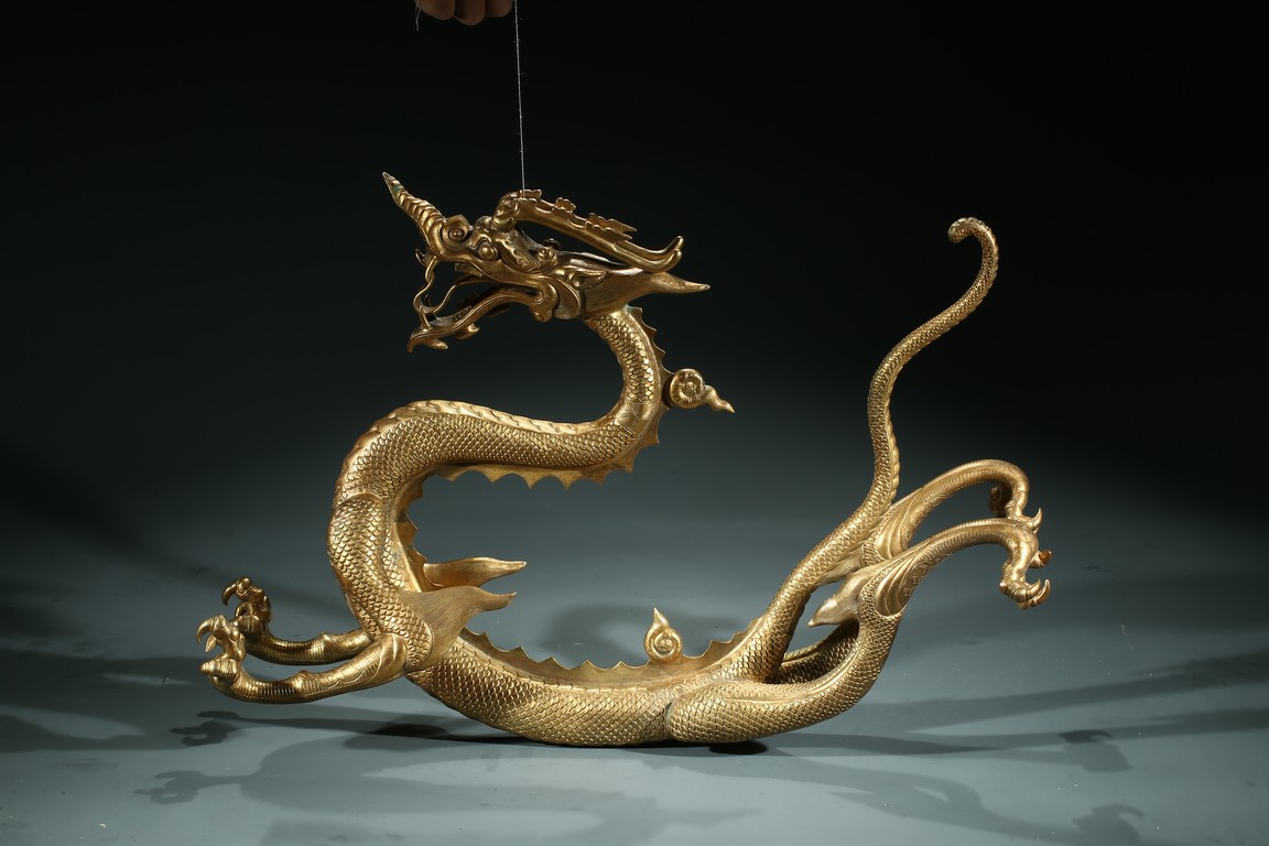 Each cast standing on its front legs while forcefully flinging the back legs up into the air, the open mouth also pierced to show the fangs and tongue, body detailed with scales.