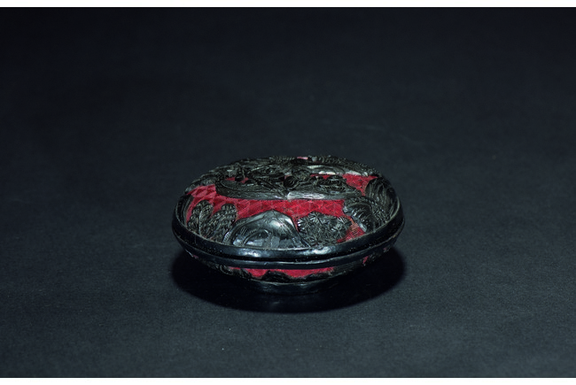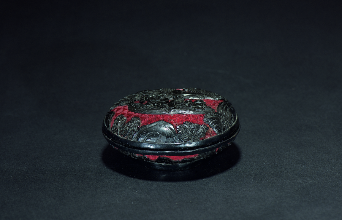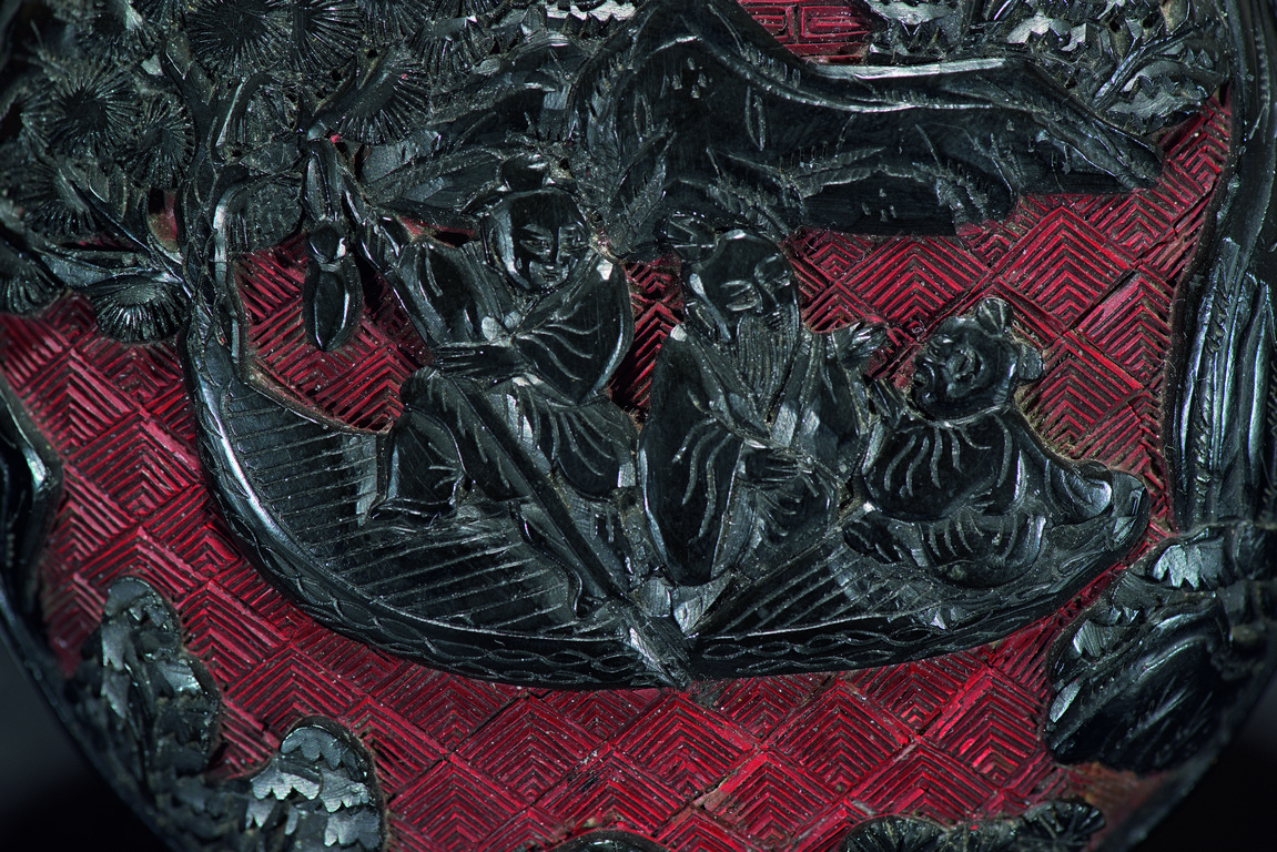 Qing Dynasty period. The paste box carved through to depict figures on a boat in a river, with rocks and pine in foreground and mountains to the distance.