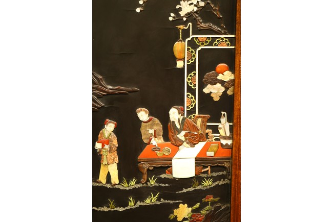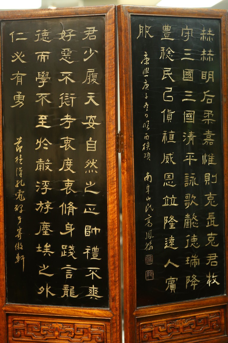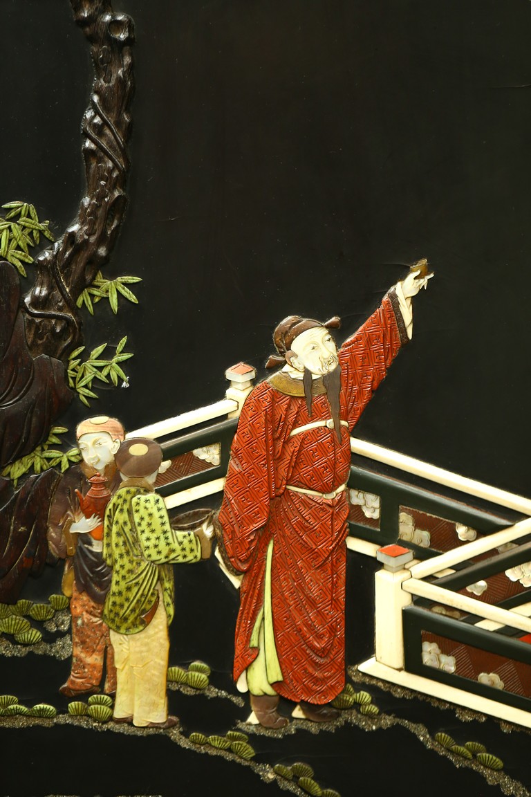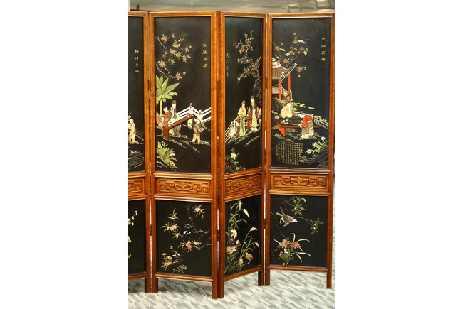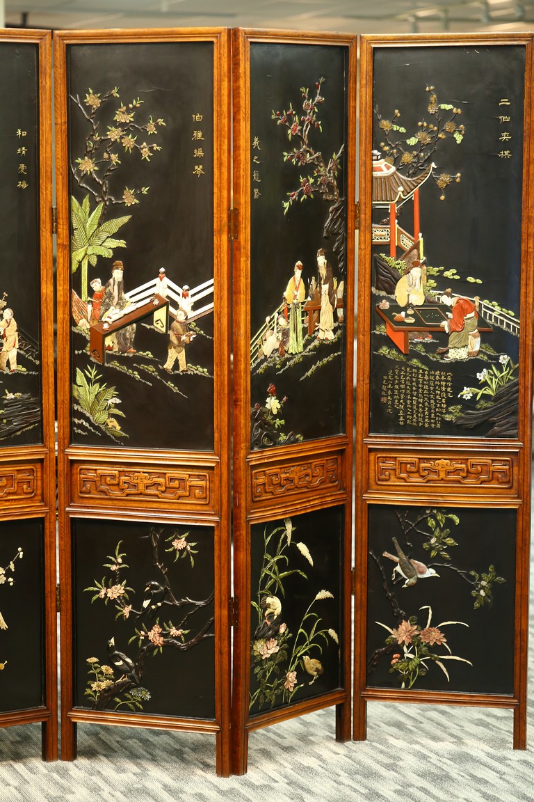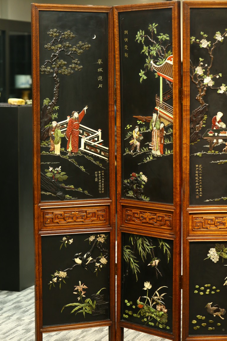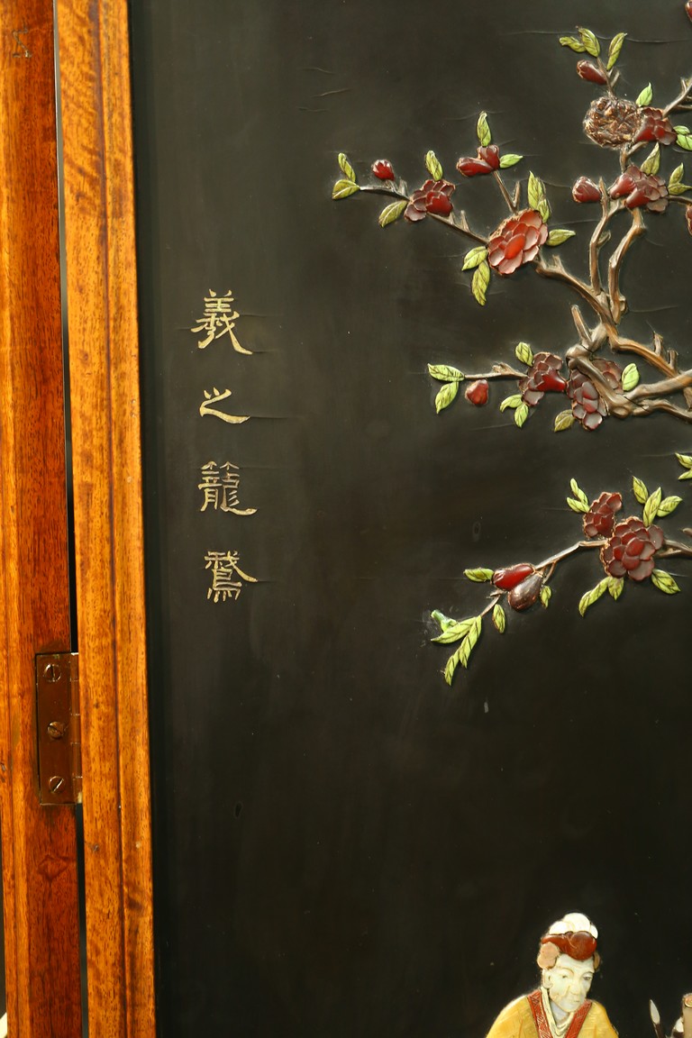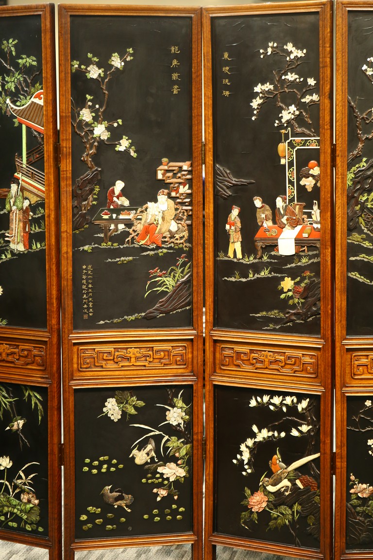 Qing Dynasty Daoguang period. The center section of each panel inlaid in jade, agate, soapstone, quartz, aventurine, mother-of-pearl, cinnabar lacquer to depict eight story scenes including scholar toasting to the moon, scholar appreciating the chrysanthemum, scholar studying the inkstones, two immortals playing chess, etc, with inscription dating to seventeenth year of Daoguang reign (1837), each with lower panel depicting various birds and flowers, in between a hardwood panel with carved archaistic pattern; the reverse painted with calligraphy inscriptions in clerical script.