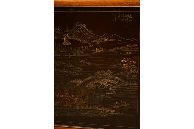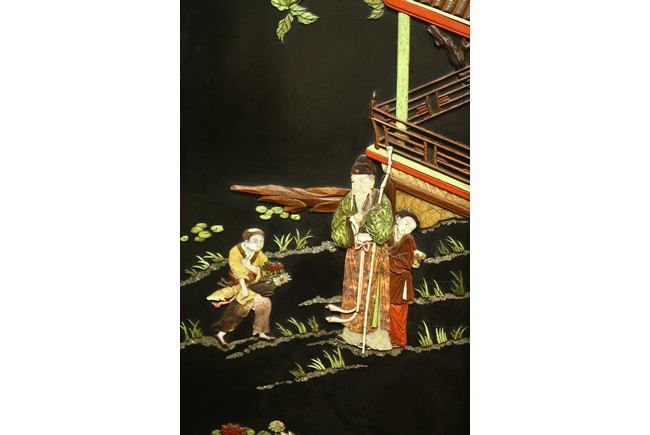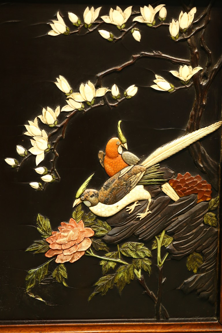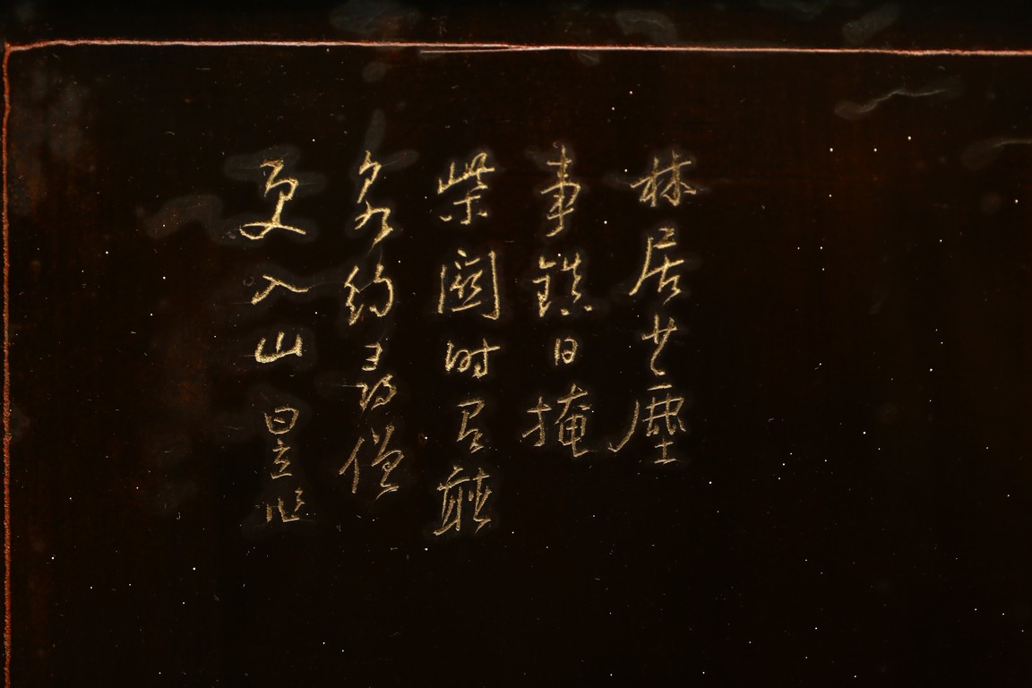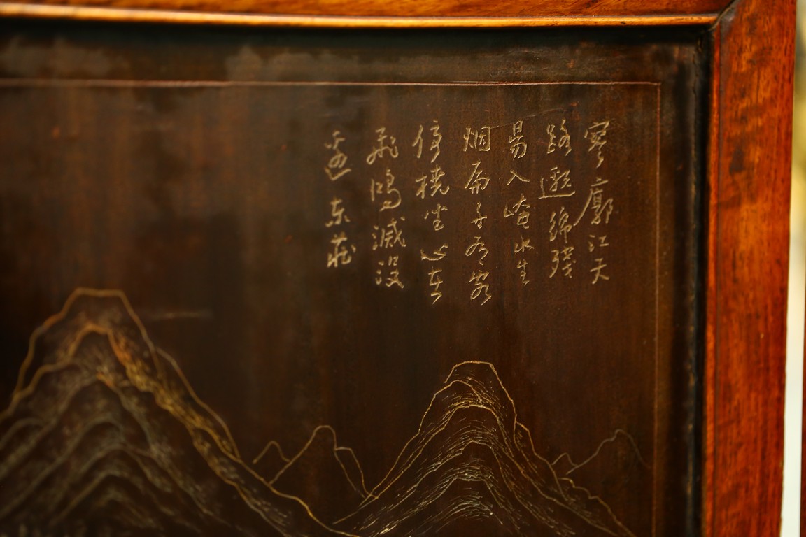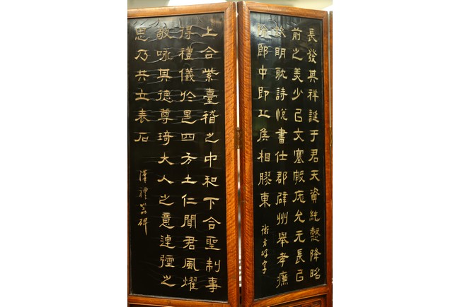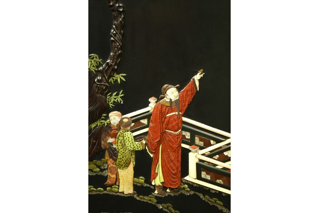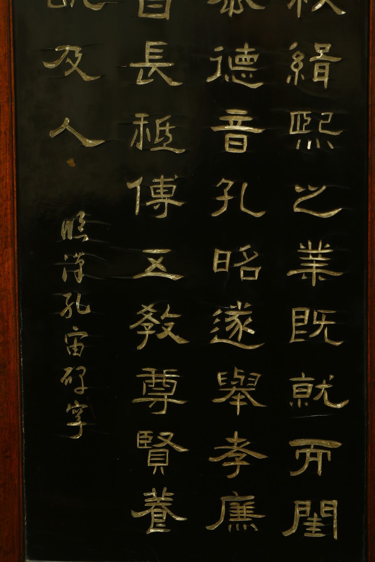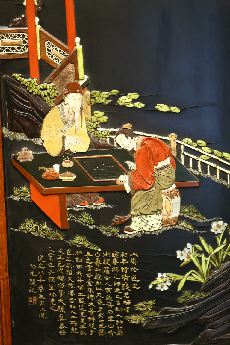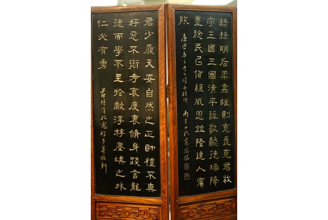 Qing Dynasty Daoguang period. The center section of each panel inlaid in jade, agate, soapstone, quartz, aventurine, mother-of-pearl, cinnabar lacquer to depict eight story scenes including scholar toasting to the moon, scholar appreciating the chrysanthemum, scholar studying the inkstones, two immortals playing chess, etc, with inscription dating to seventeenth year of Daoguang reign (1837), each with lower panel depicting various birds and flowers, in between a hardwood panel with carved archaistic pattern; the reverse painted with calligraphy inscriptions in clerical script.